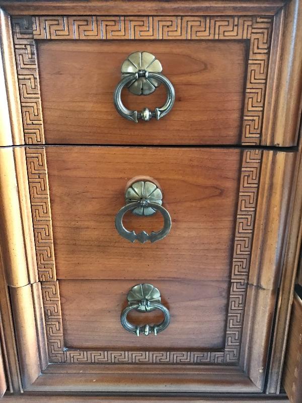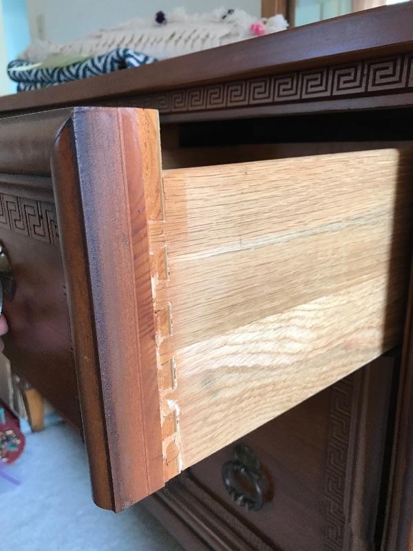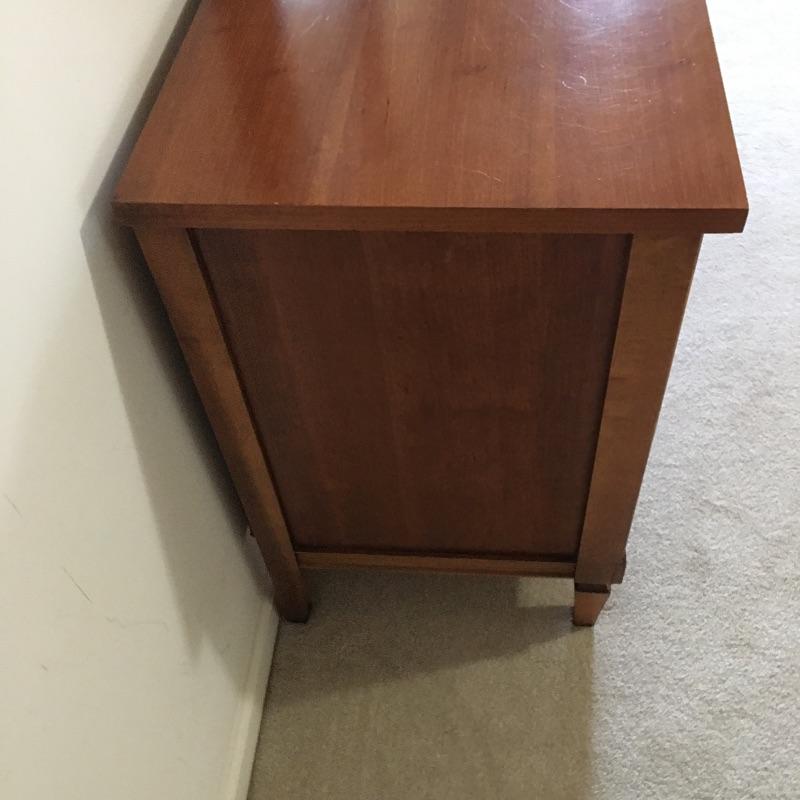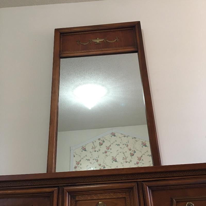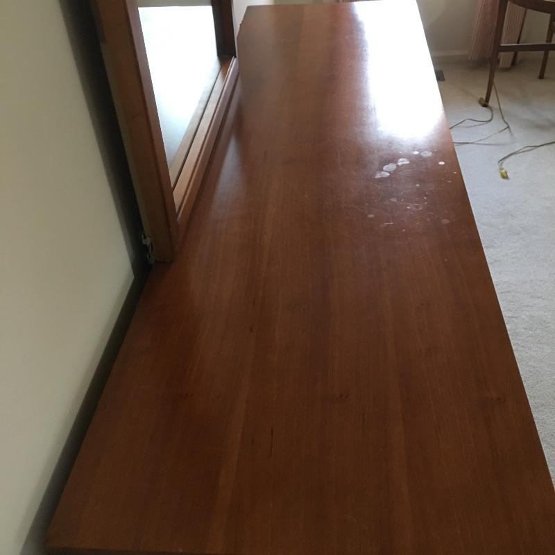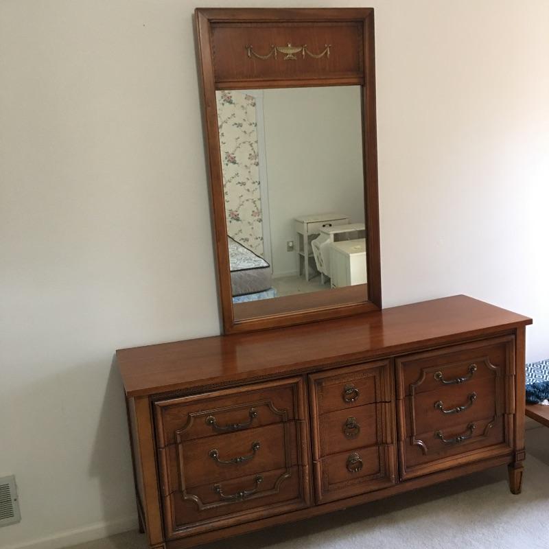 Dresser with nine dovetailed drawers and mirror. Nice large dresser to hold lots of your clothes. Dresser has a few scratches on top and back cover is loose, see pictures. Mirror can be removed for transport. Dresser measures 18.75” x 63.75” x 30.5” and mirror frame measures 29” x 50.5”. Item is substantial bring help.