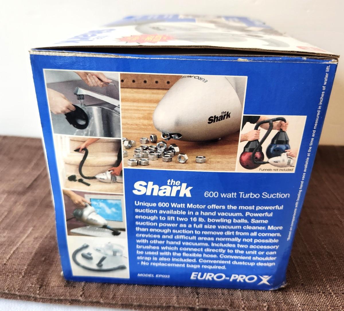 Euro-Pro X SHARK brand hand vacuum cleaner - new in box - never used. Weighs less than 3 pounds, no bags needed. Enough suction to lift 2 16 pound bowling balls. Handy item for quick clean ups.
