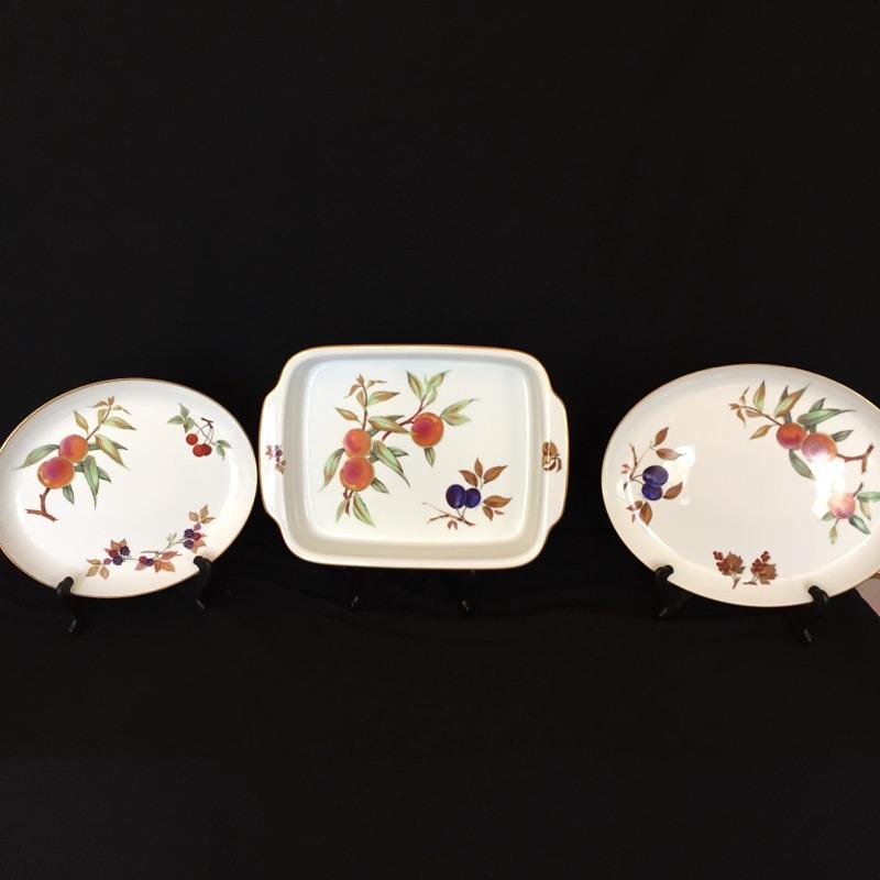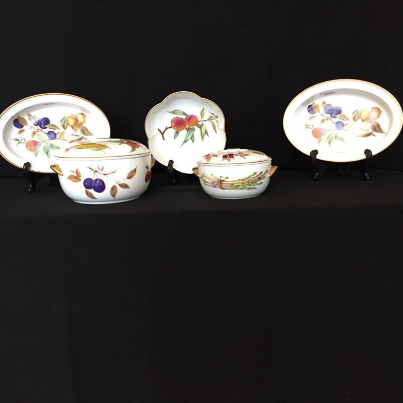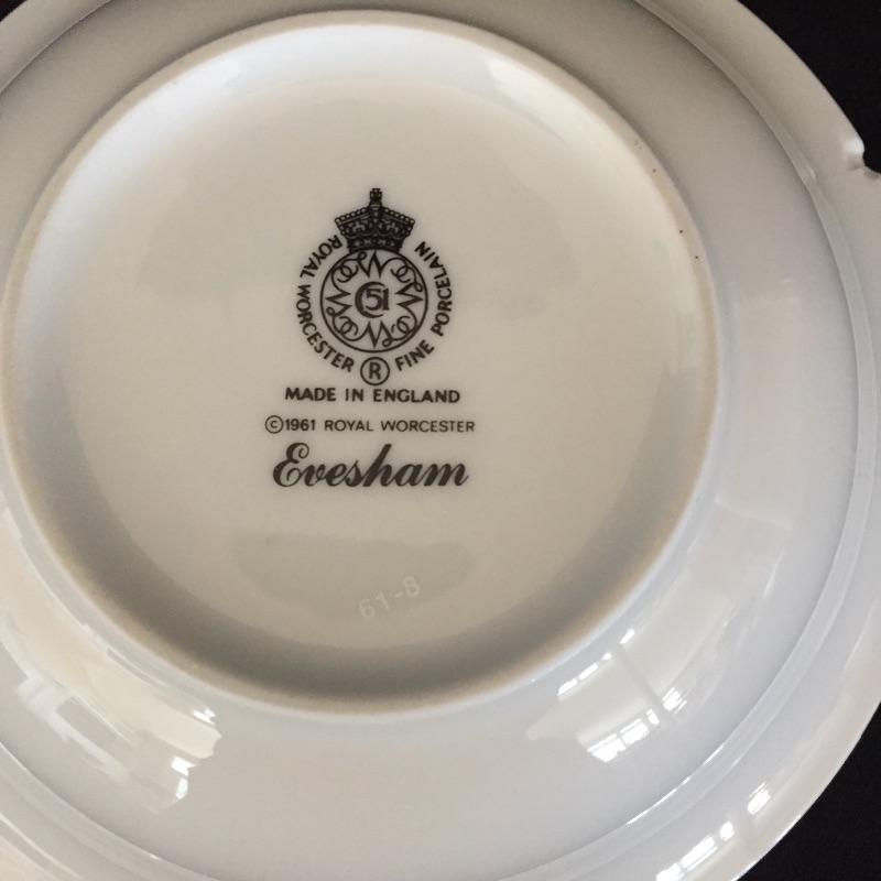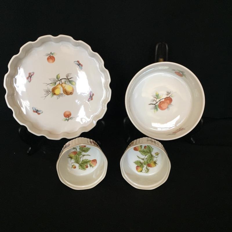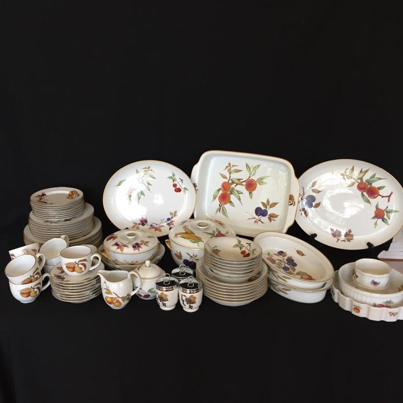 This large 68 piece set - Evesham by Royal Worcester Fine Porcelain is made in England and includes the following 8 place settings -teacups, saucers, bread plates, salad plates, dinner plates, both the large and small bowls are missing 1 piece, so 7 small bowls and 7 larger bowls, 3 lidded condiment jars, 2 large lidded bowls, 1 large dish, 5 assorted platters. This lot also includes 4 Oven to Table pieces that include a quiche dish, large bowl and 2 terrines.