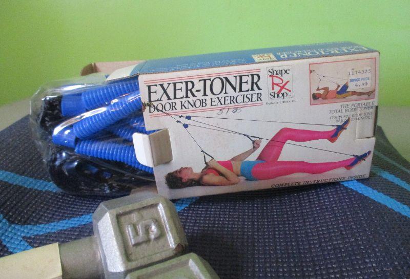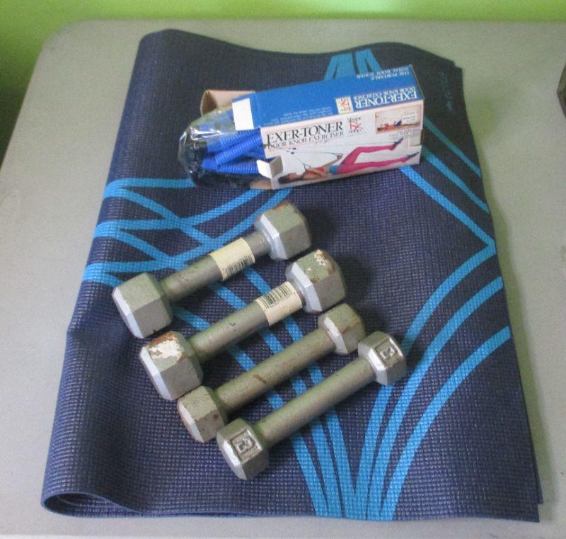 This lot is also known as the New Years Resolution lot. It has (2) 3 lb weights, (2) 5 lb weights, a yoga mat (looks new), and a door exercise thing.