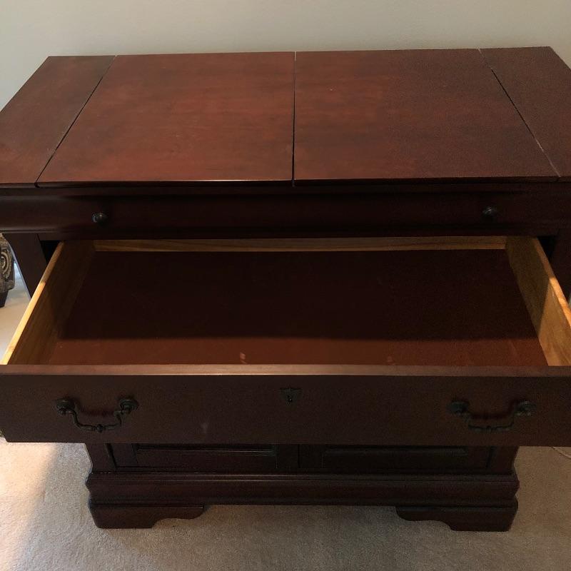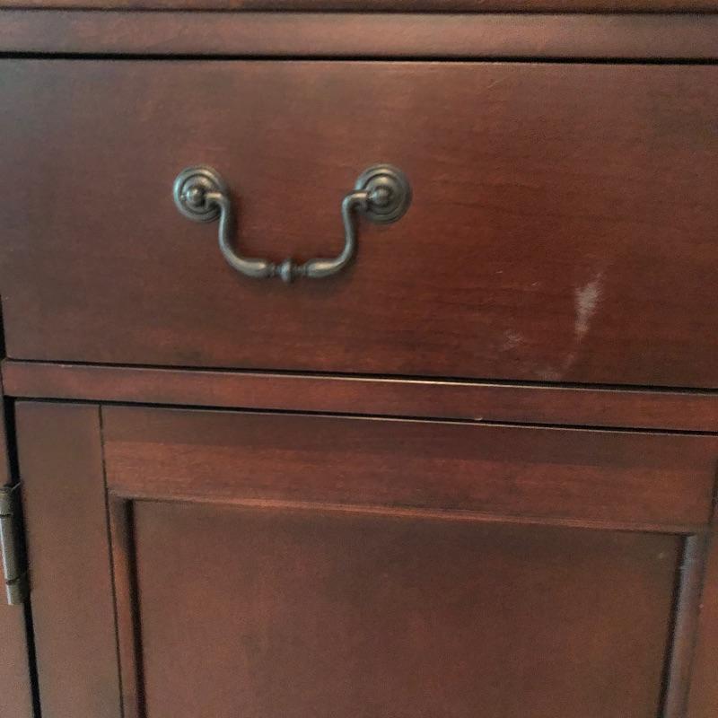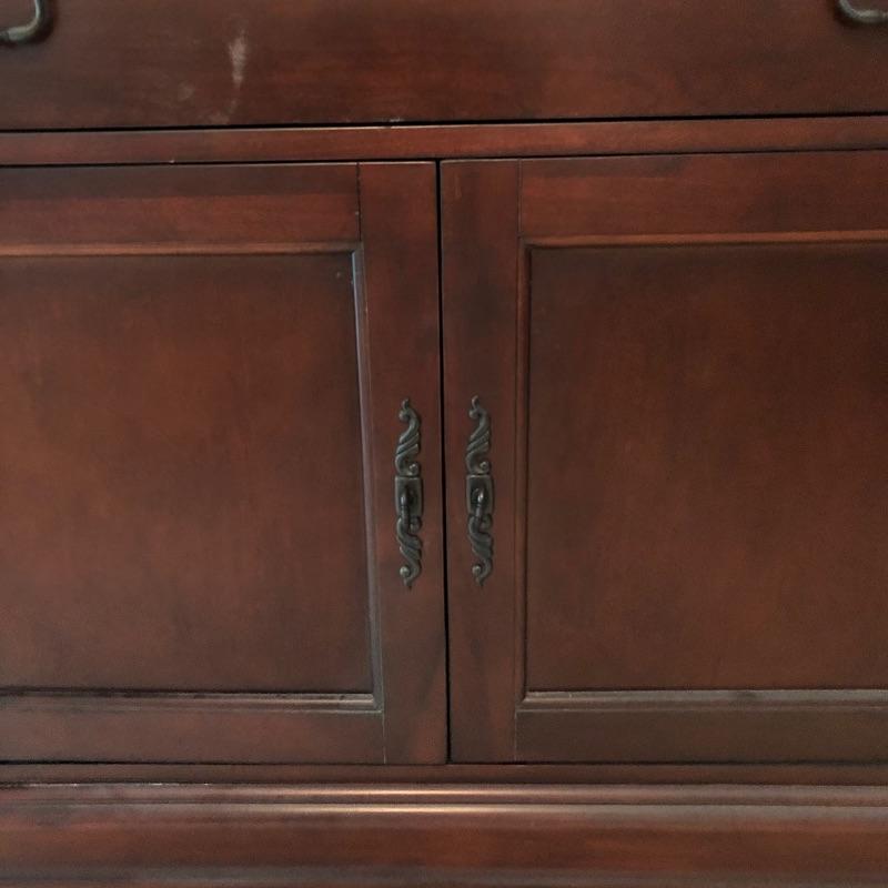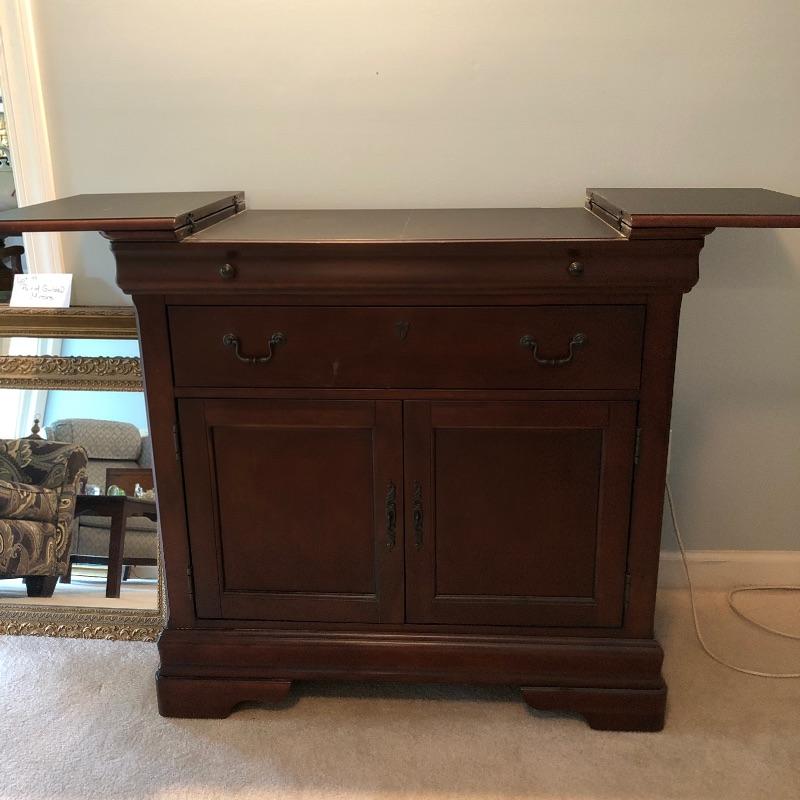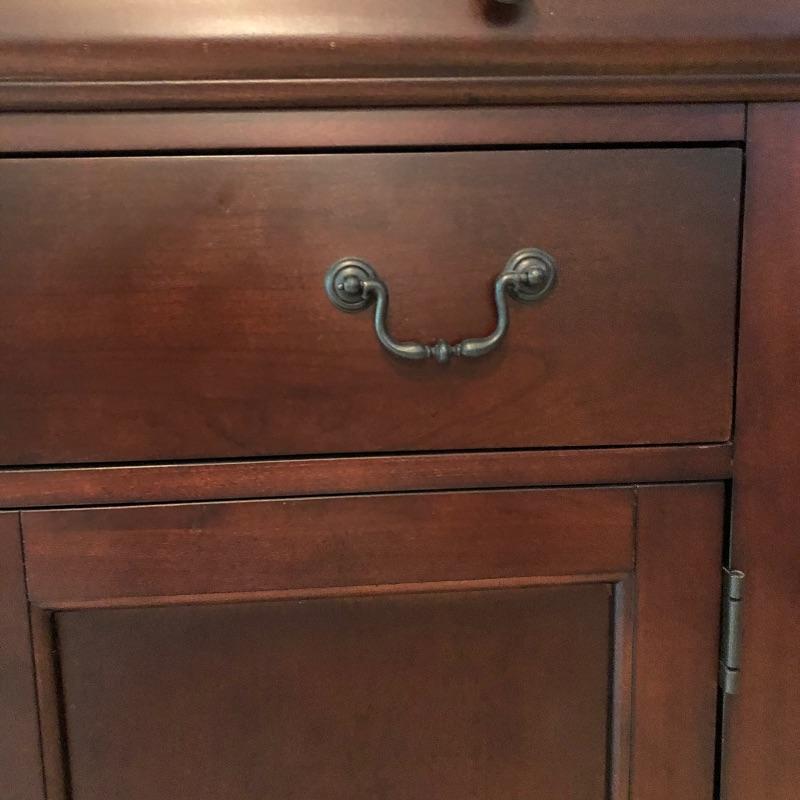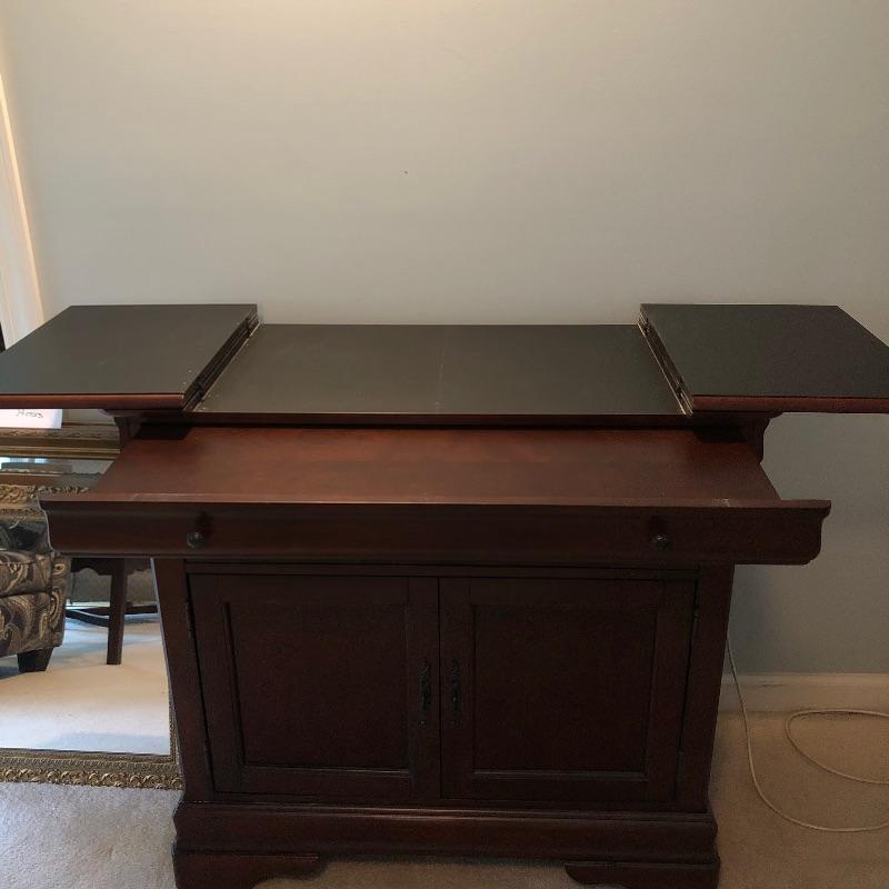 This wooden buffet table (40” x 20” x 38”) is in great condition. It expands (57.5” width) to create greater space for working or as a place to set things such as a vase or picture frames. It has a total of two drawer spaces, plus a retractable shelf on the top. It would be perfect for your dining room or living room space. It appears to be a dark mahogany colored stain. The buffet has rollers on the bottom for an easier move. It will require two people to get it down a set of 2 stairs.