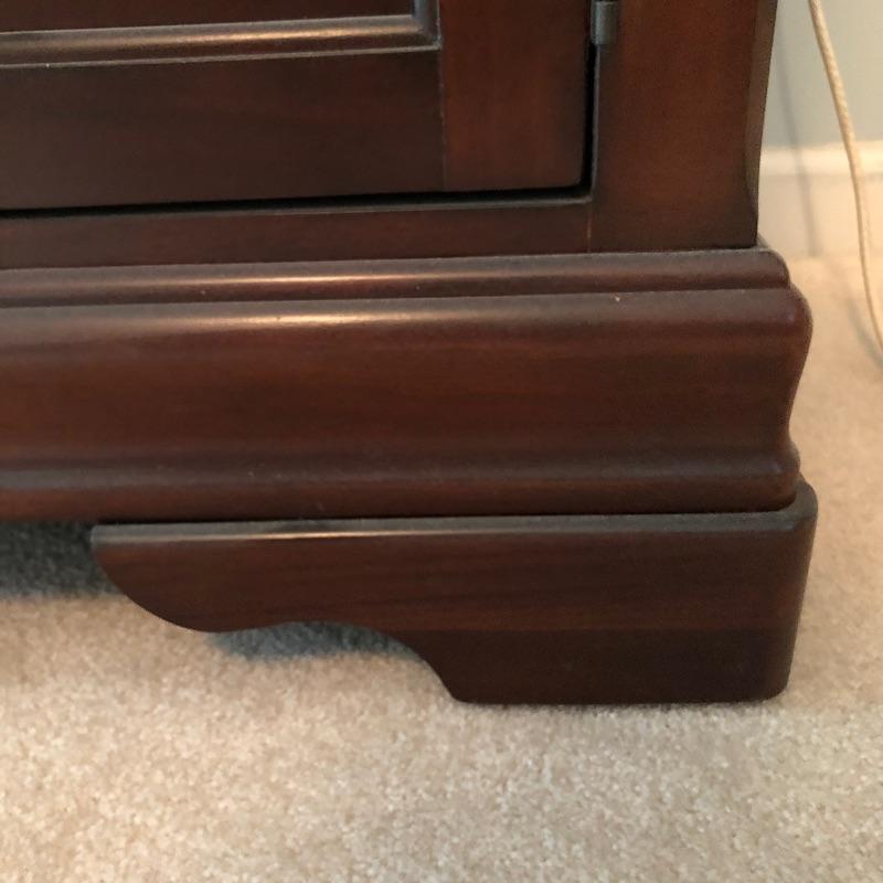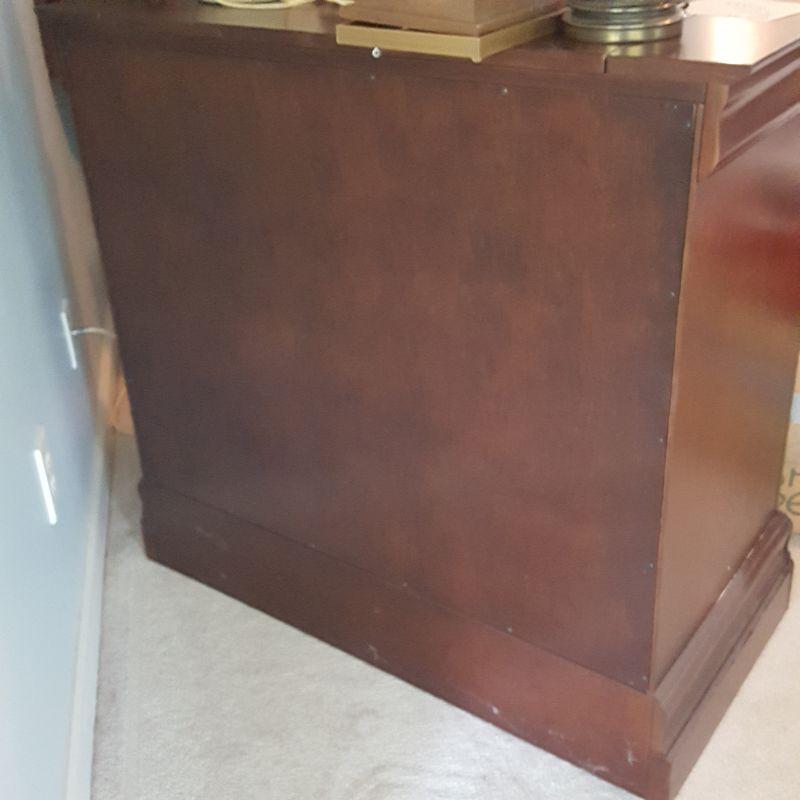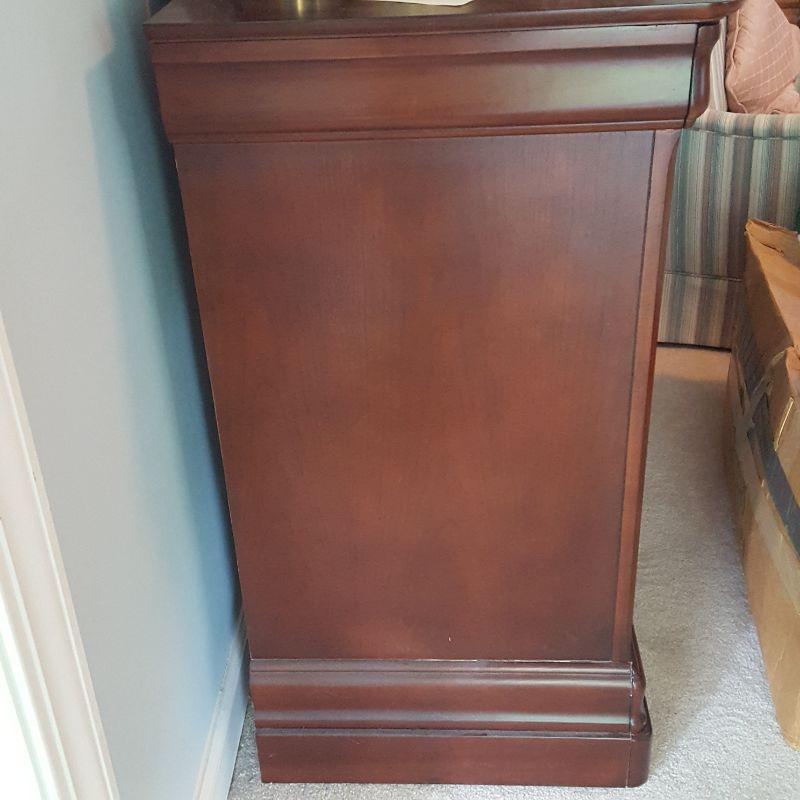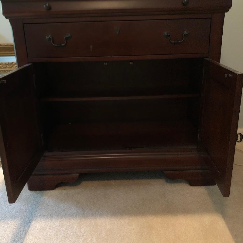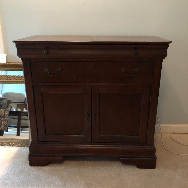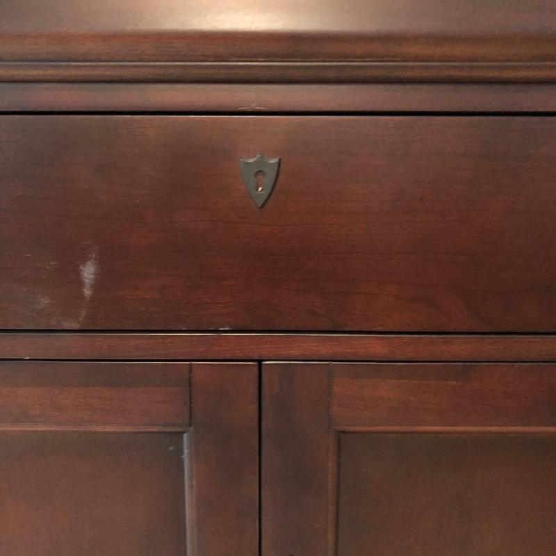 This wooden buffet table (40” x 20” x 38”) is in great condition. It expands (57.5” width) to create greater space for working or as a place to set things such as a vase or picture frames. It has a total of two drawer spaces, plus a retractable shelf on the top. It would be perfect for your dining room or living room space. It appears to be a dark mahogany colored stain. The buffet has rollers on the bottom for an easier move. It will require two people to get it down a set of 2 stairs.