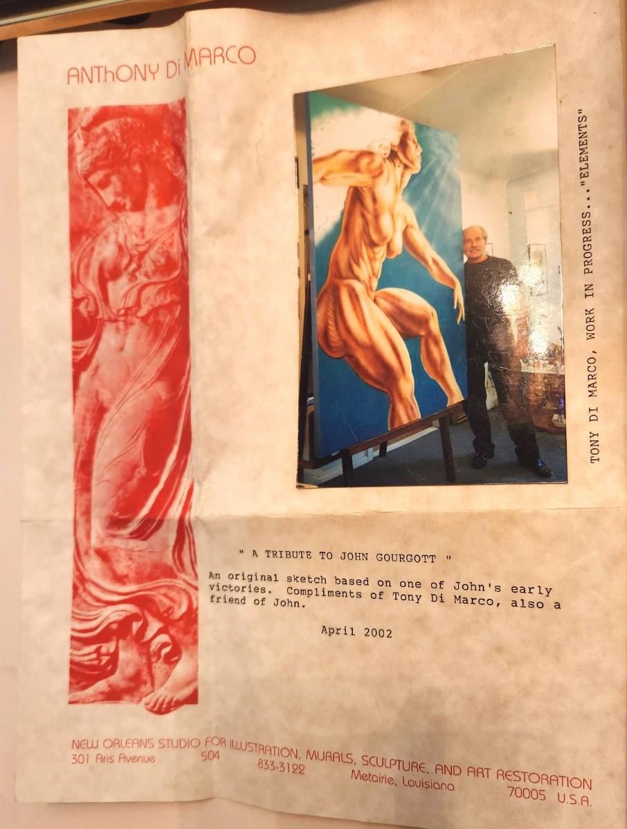 "Gemini" artwork measures 37" tall, 8.5" across - signed by listed artist Anthony di Marco (year 2000). Piece is interesting - plastic on foam core. Mr. DiMarco runs the New Orleans Studio for Illustration, Murals, and Sculpture and is also an Art Restorer.