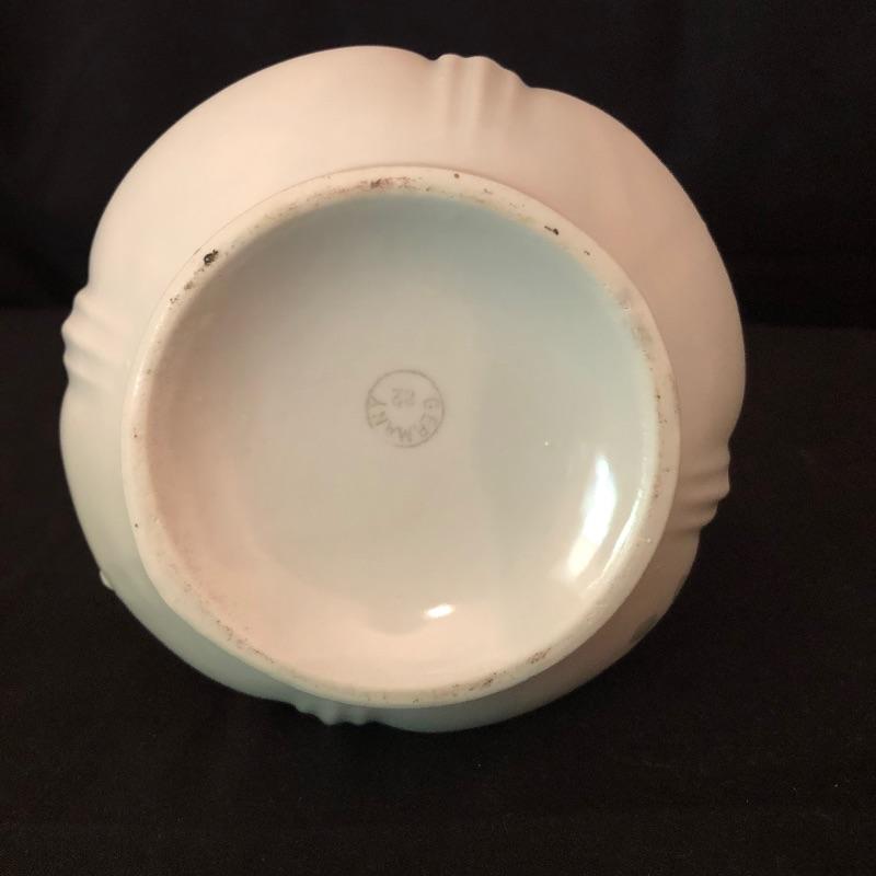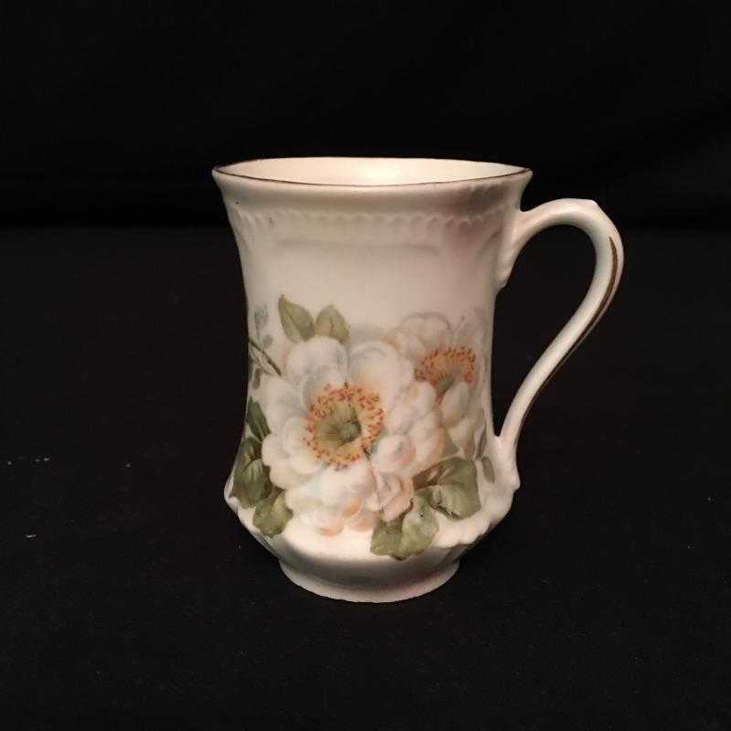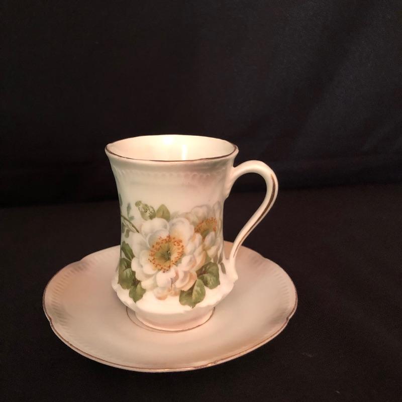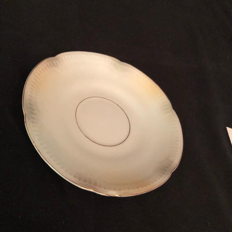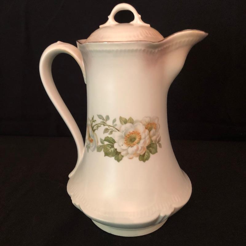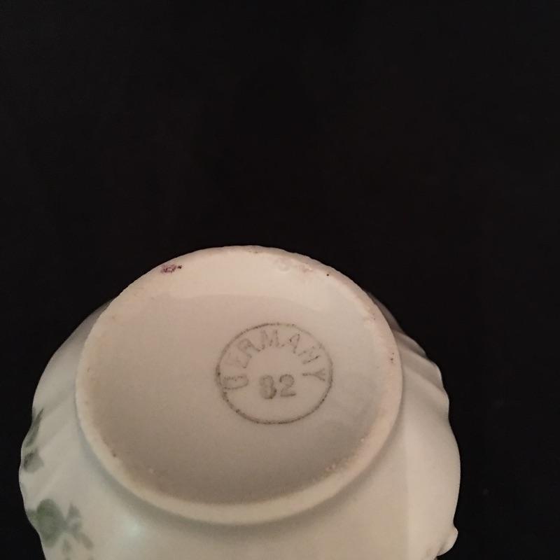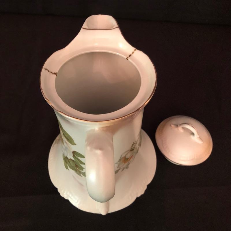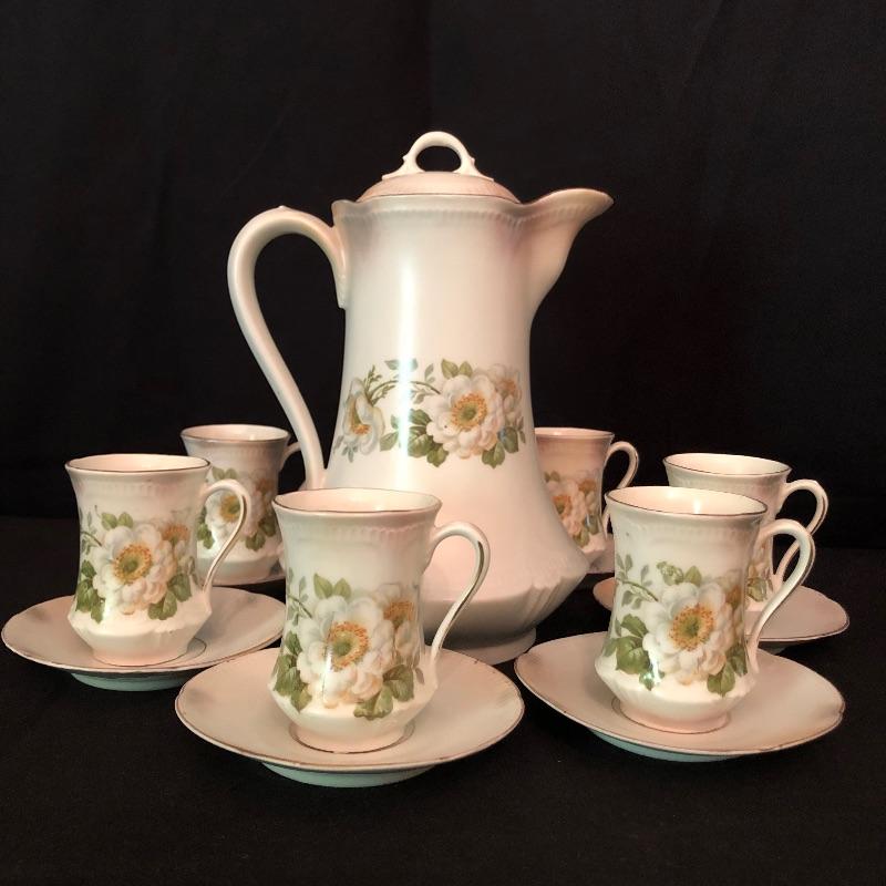 Six cups and saucers and a teapot are all matching, with a very pretty white flower design. They appear to be China and are marked Germany 82. The teapot measures approximately 6” x 9”.