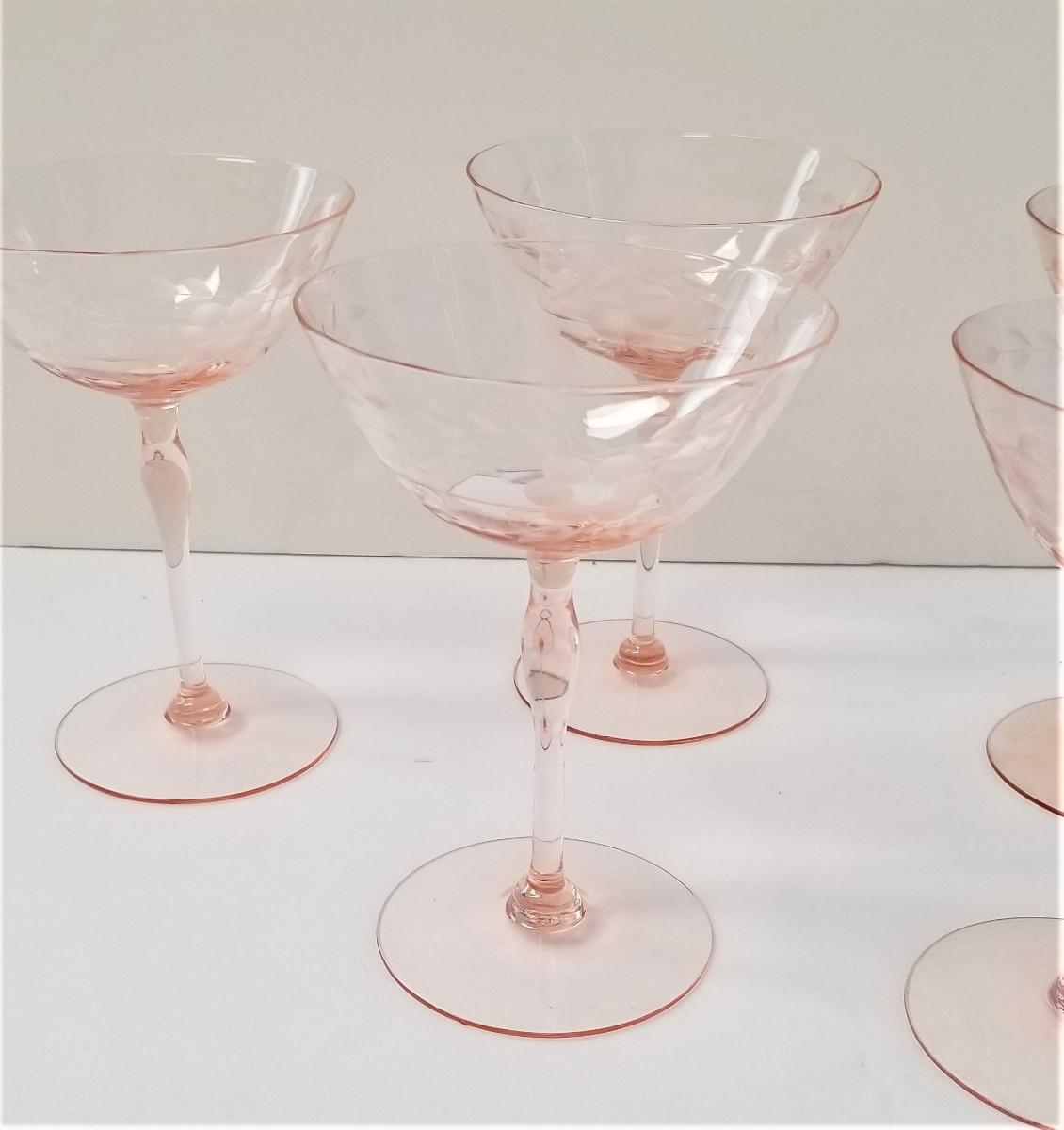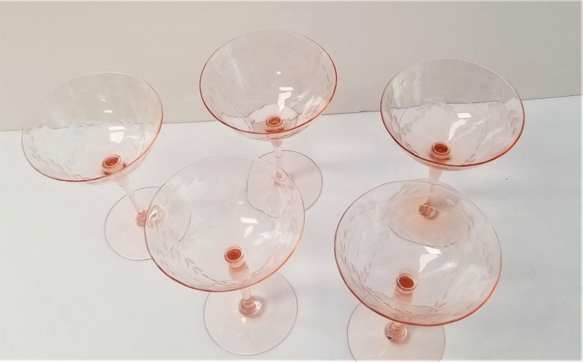 5 lovely pink etched crystal goblets/champagnes - all in good condition. Each stands 6" tall. Probably from the 1940's or so.