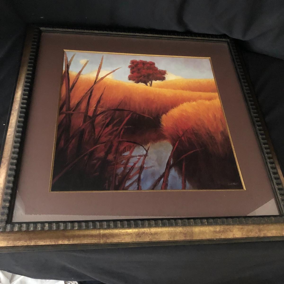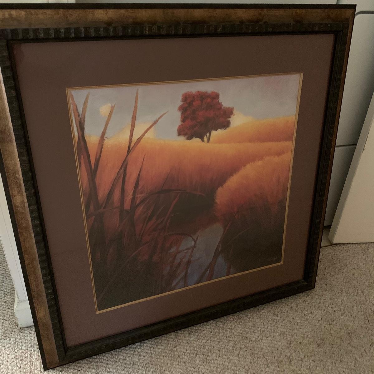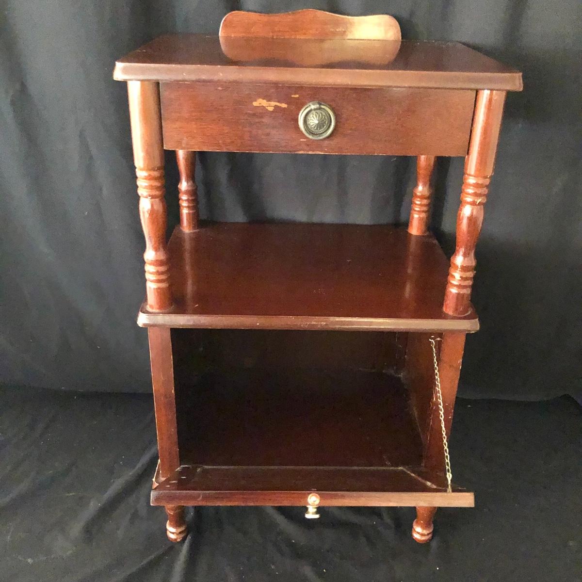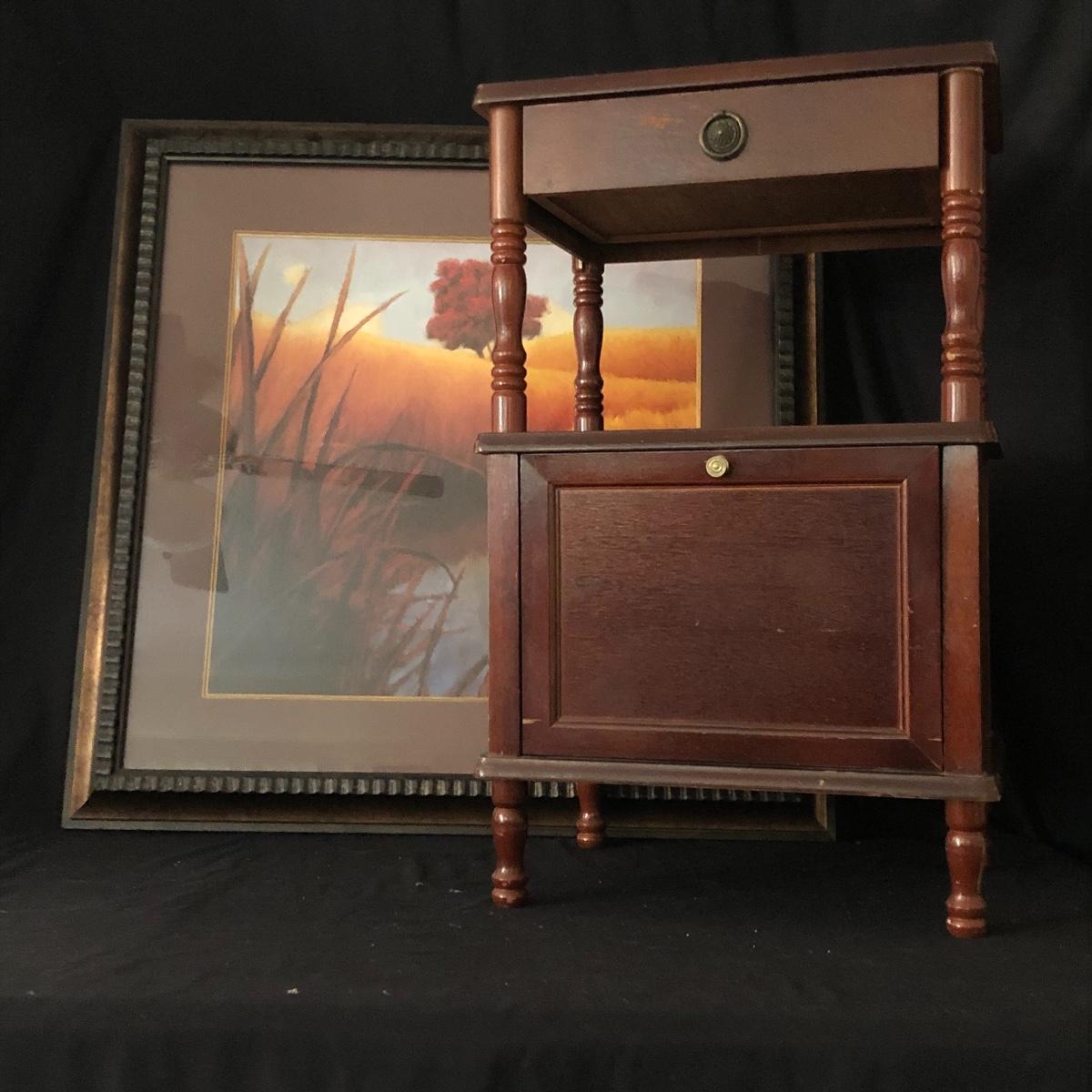 Lot includes James Weins framed and matted print and a side table with a drawer and storage space underneath.
