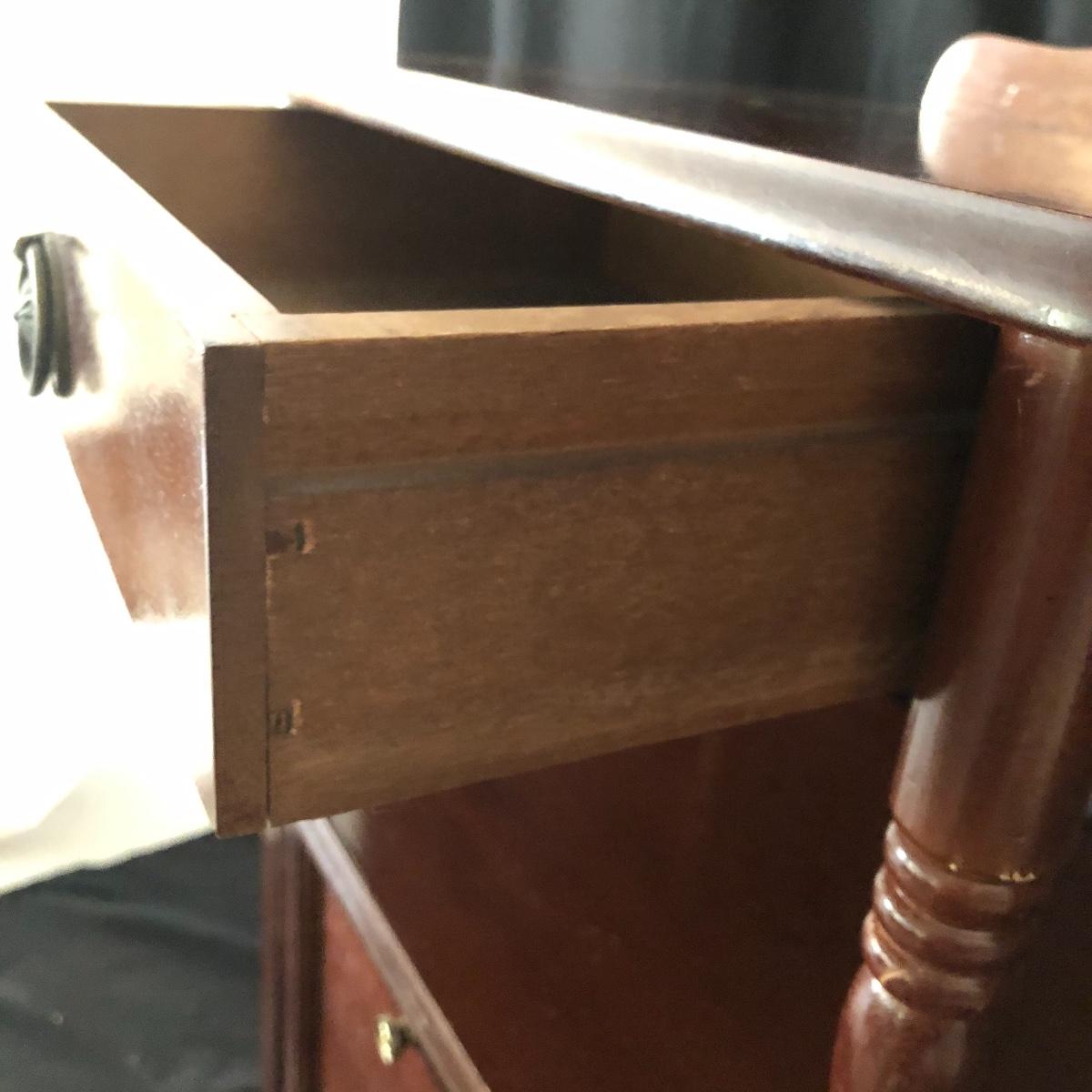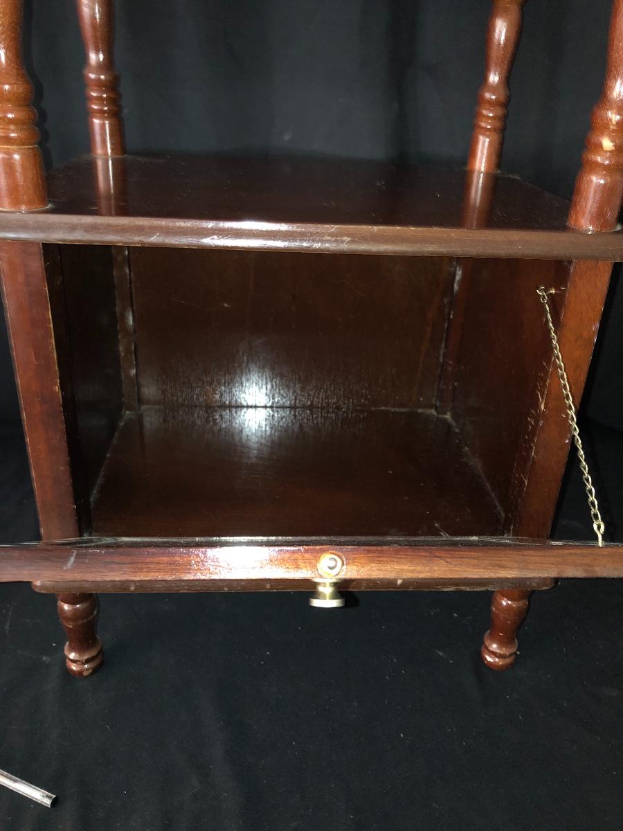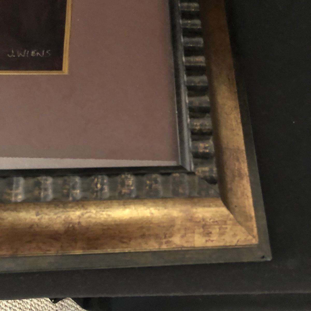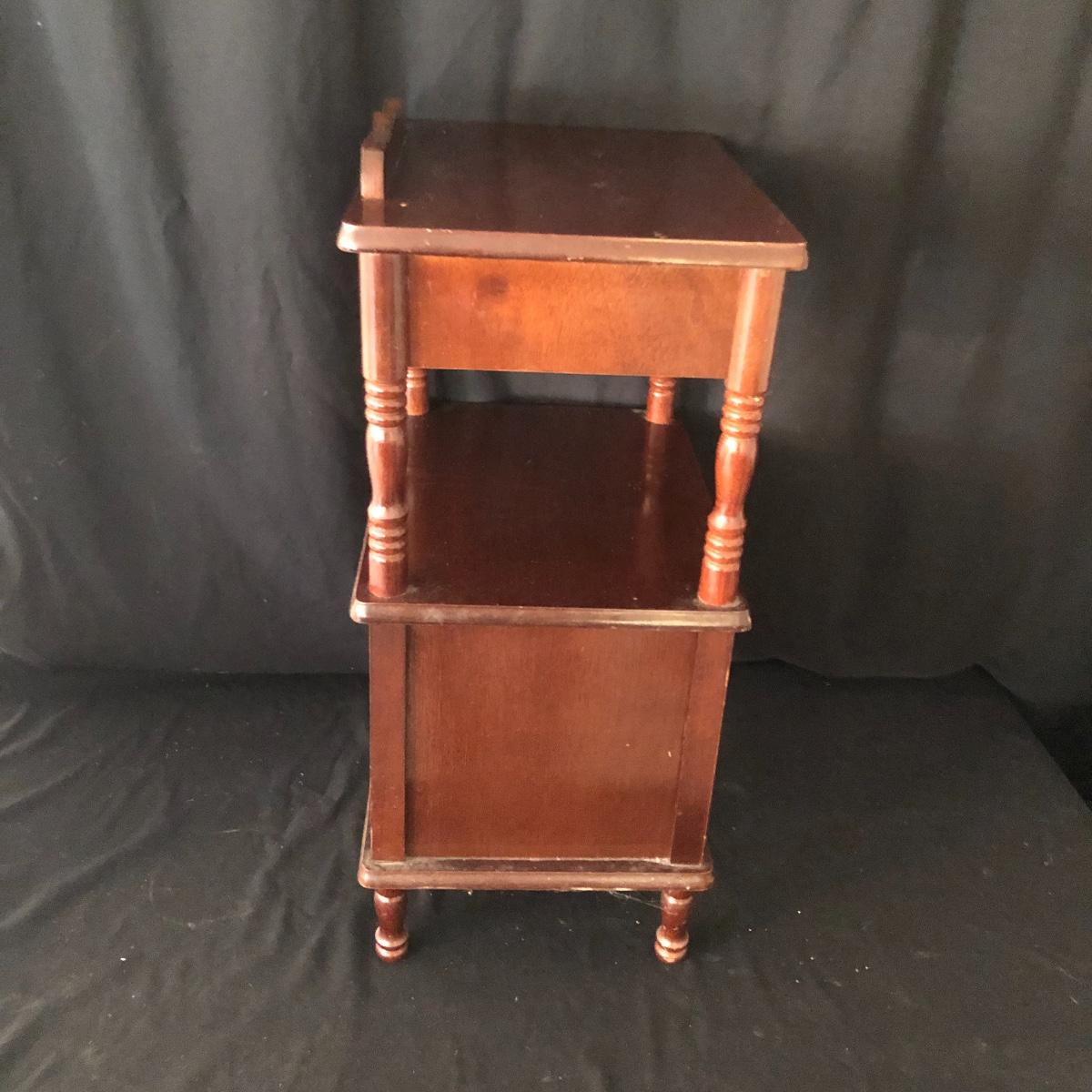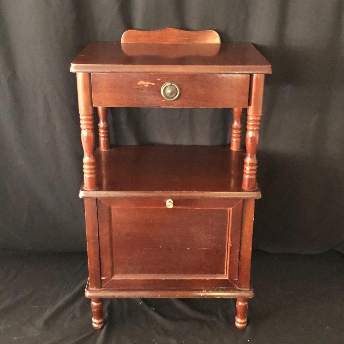 Lot includes James Weins framed and matted print and a side table with a drawer and storage space underneath.