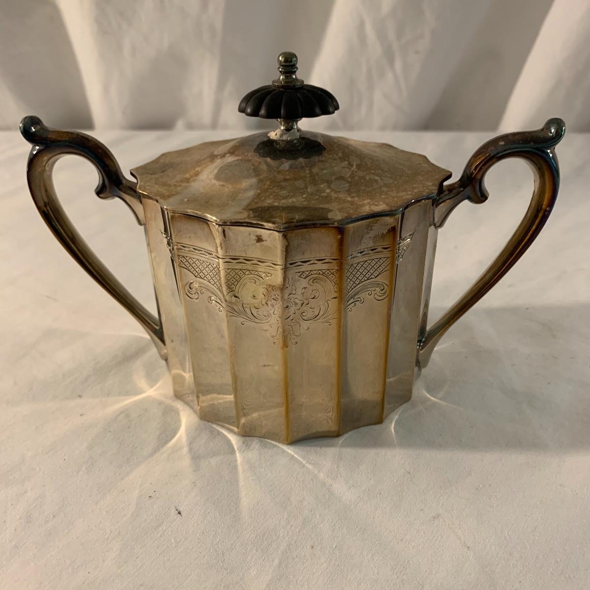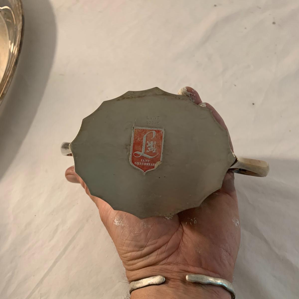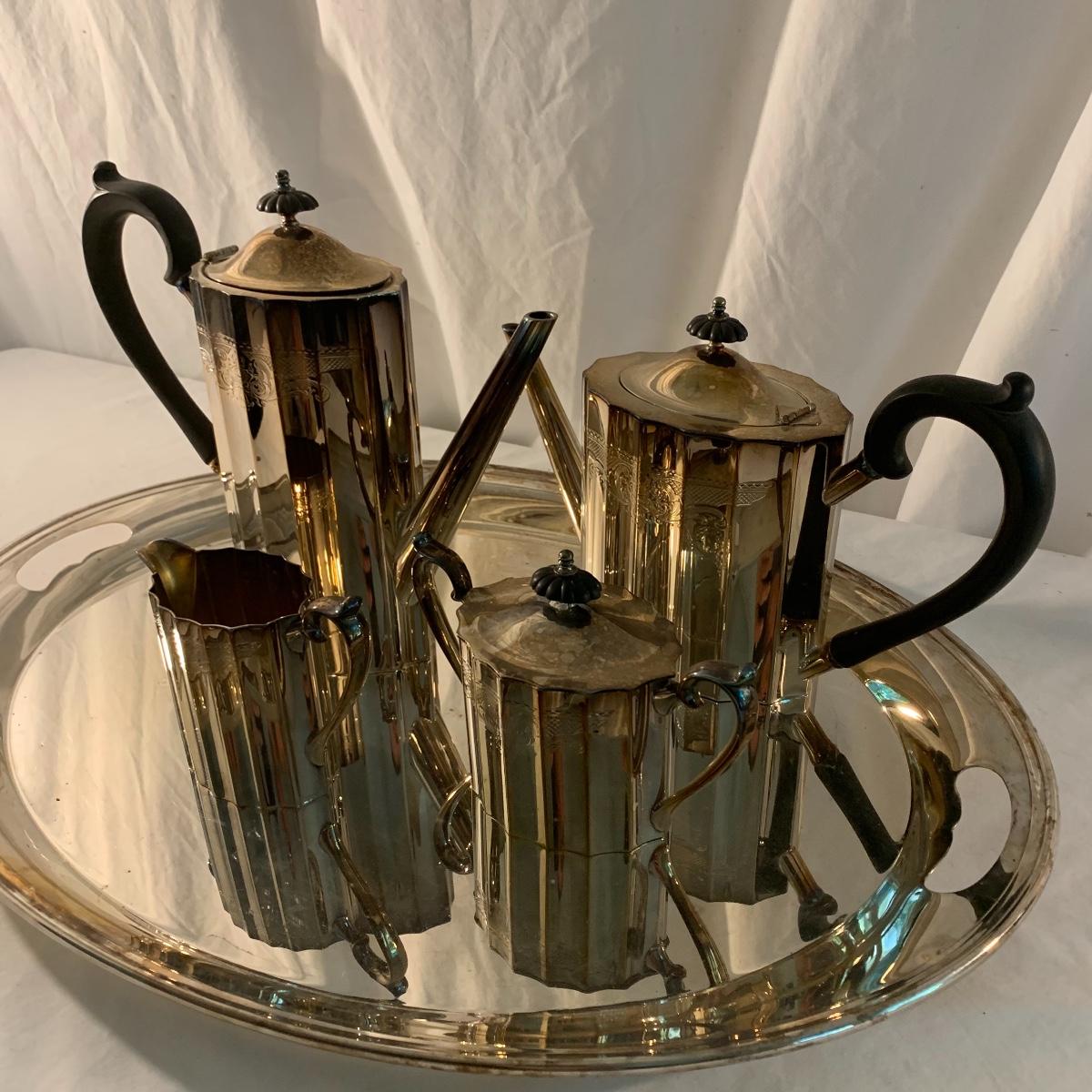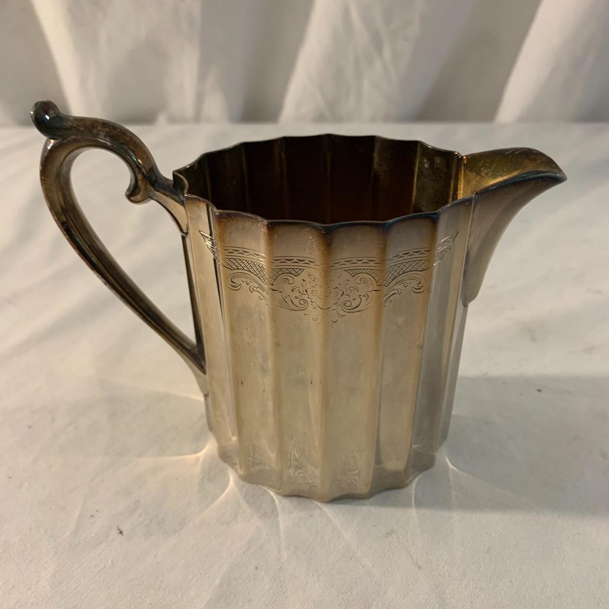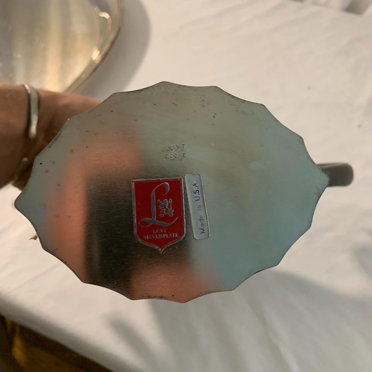 This Tea set is gorgeous! Manufactured by Lunt the set includes a serving tray that measures 22” X 16”, a 9” tea pot, a 6” tea pot, a cream pitcher as well as a covered sugar bowl. All vessels feature a beautiful corrugated body with an engraved design. This set is in good condition but could stand a polishing. All items silver plated.