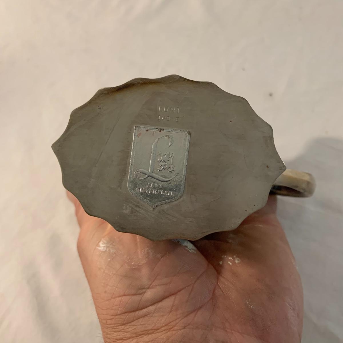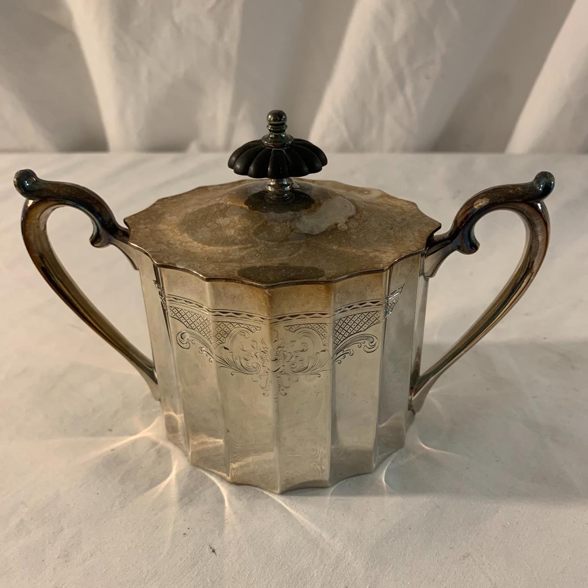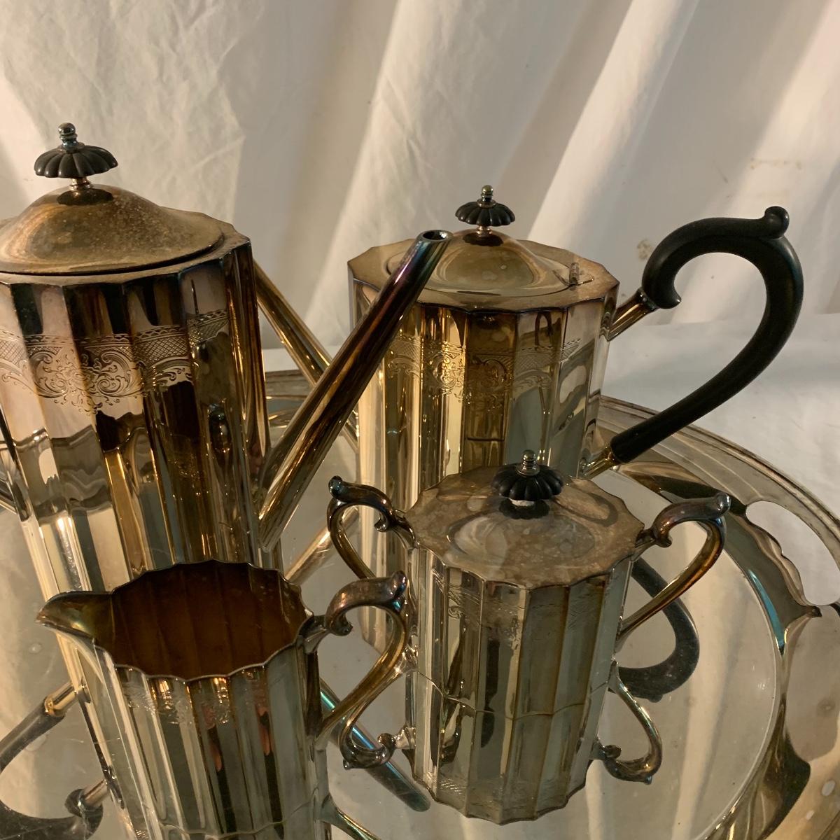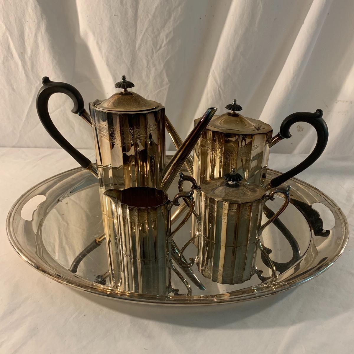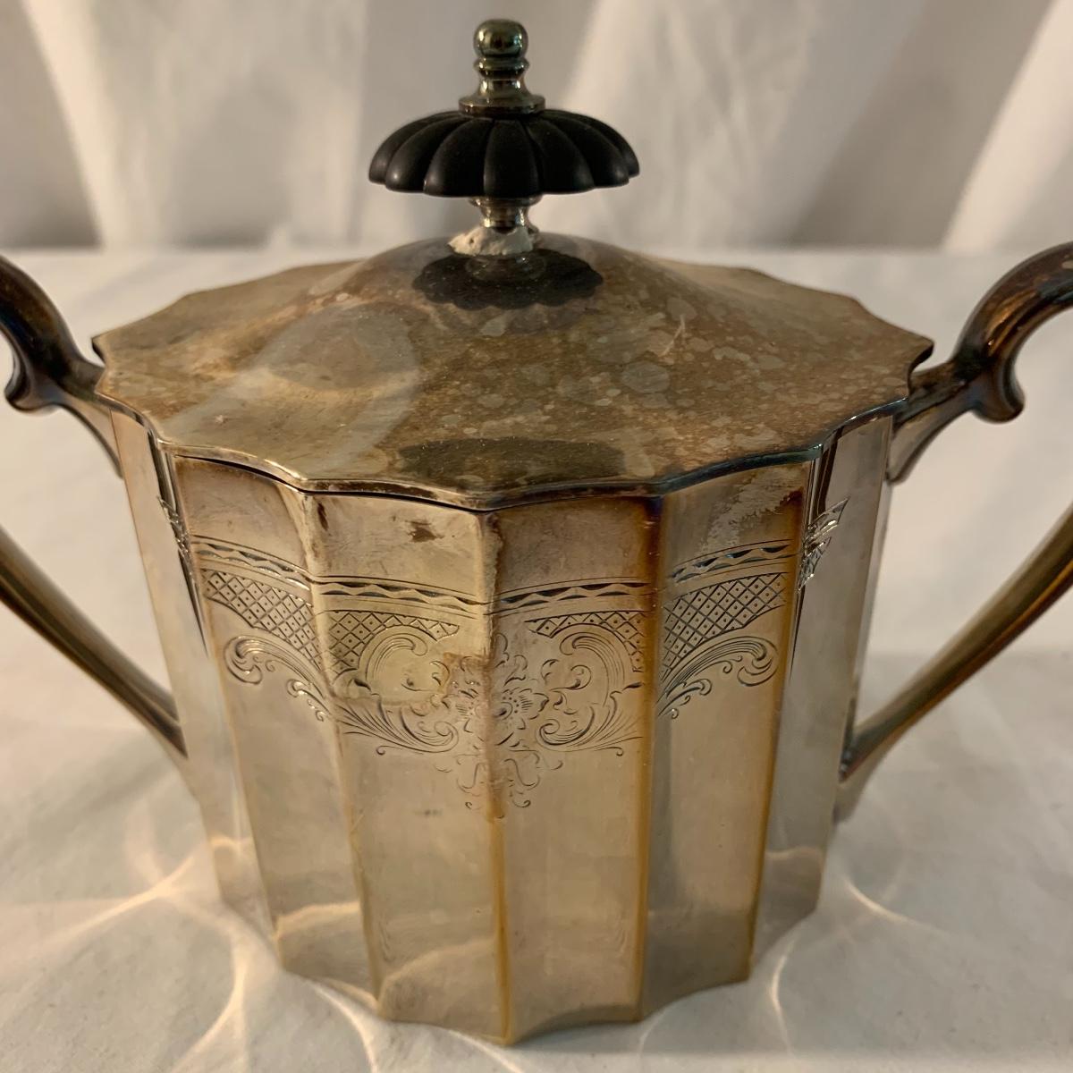 This Tea set is gorgeous! Manufactured by Lunt the set includes a serving tray that measures 22” X 16”, a 9” tea pot, a 6” tea pot, a cream pitcher as well as a covered sugar bowl. All vessels feature a beautiful corrugated body with an engraved design. This set is in good condition but could stand a polishing. All items silver plated.