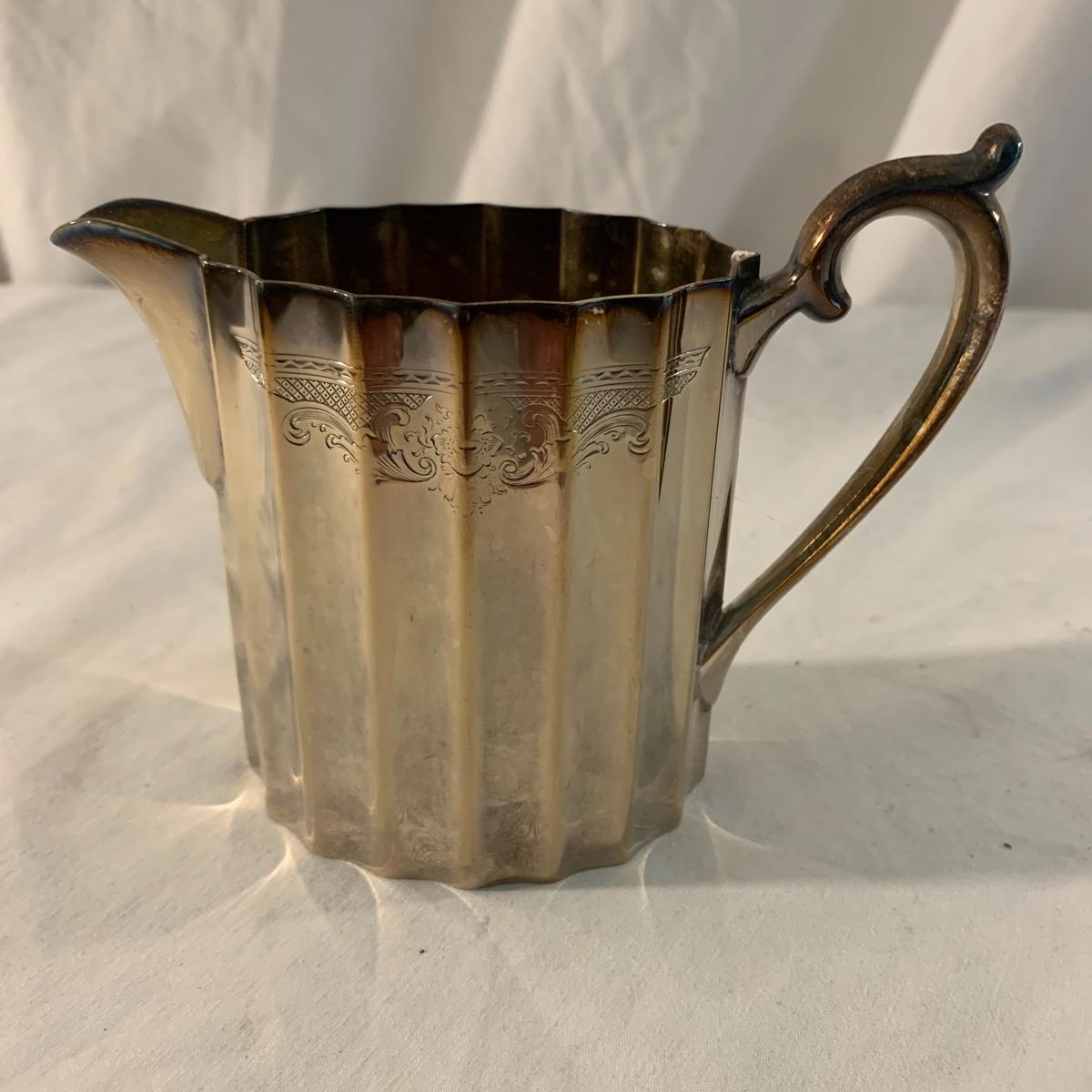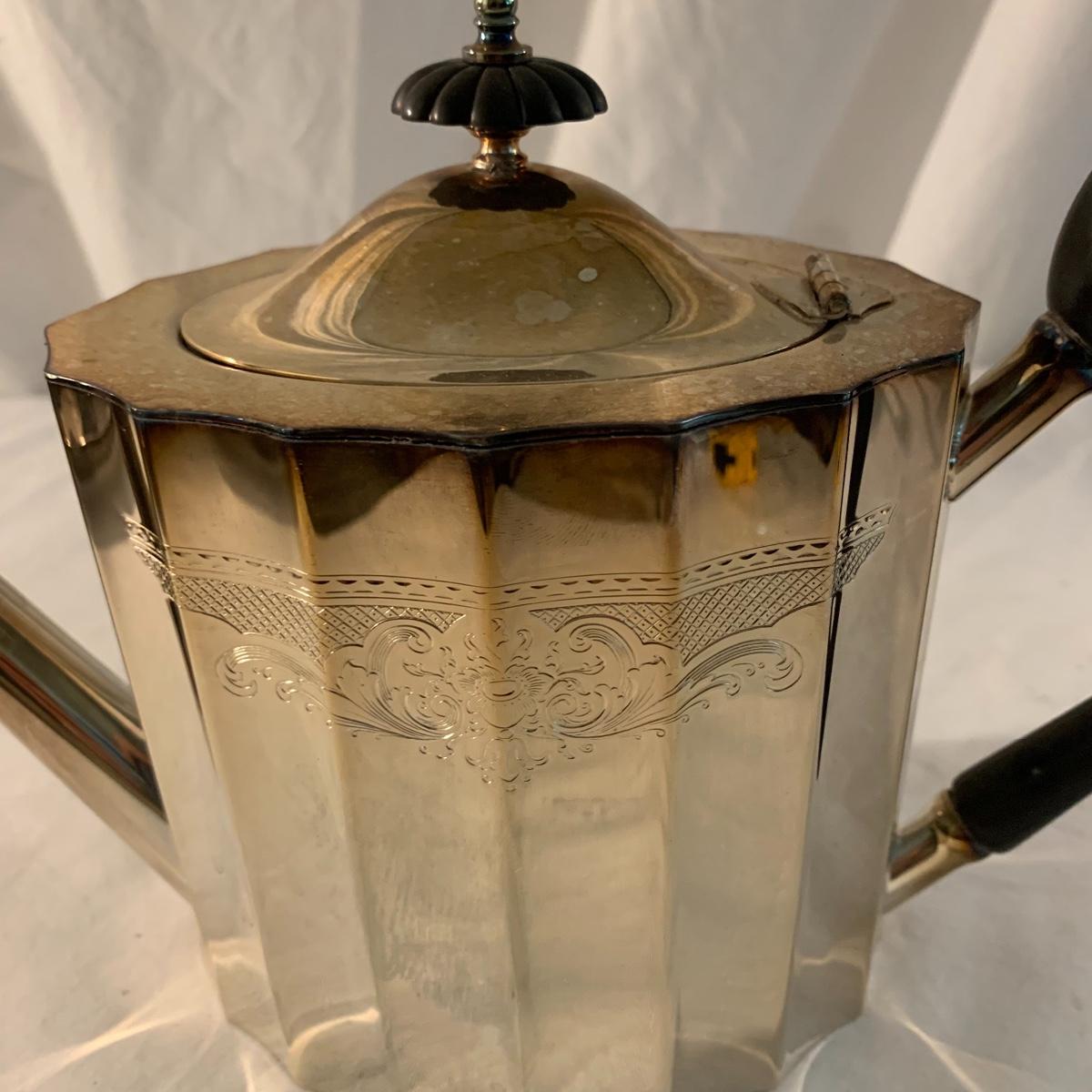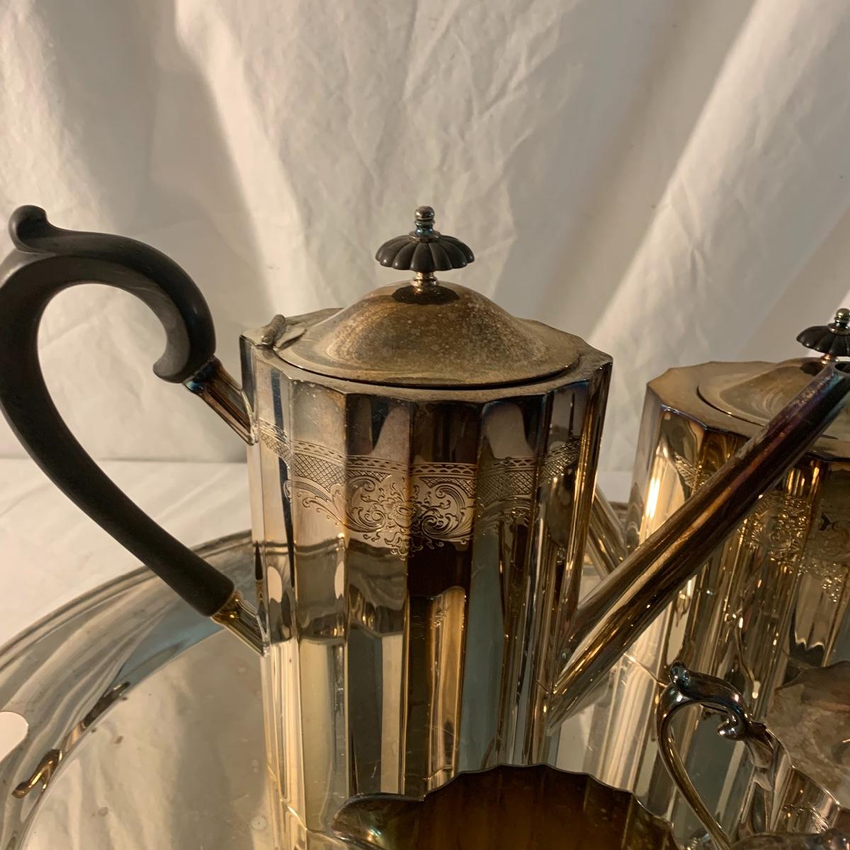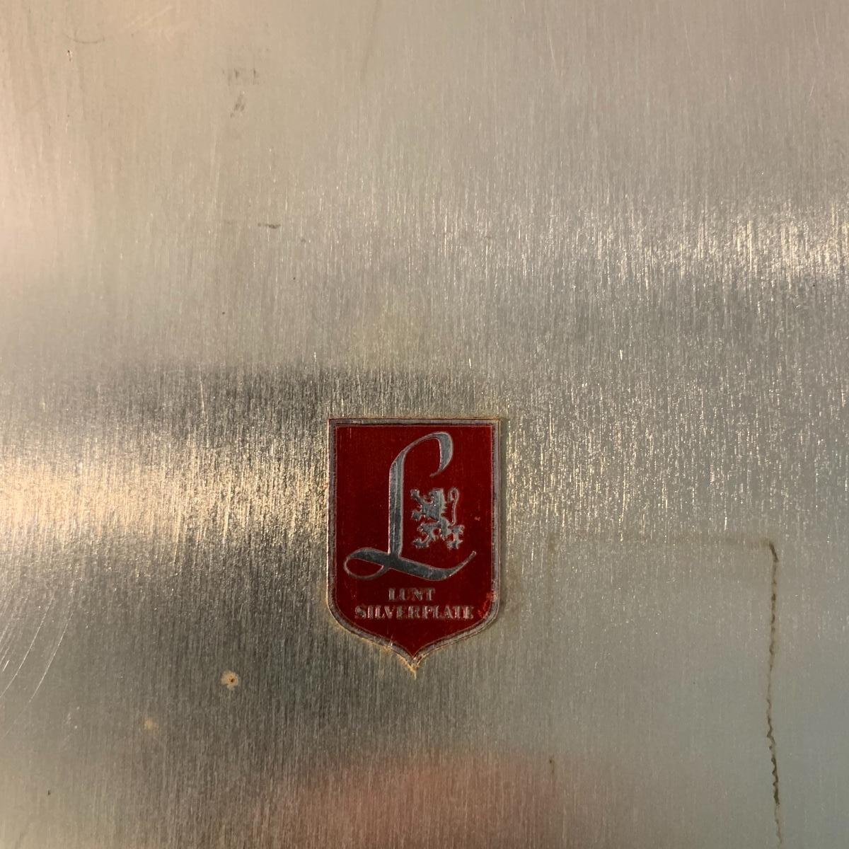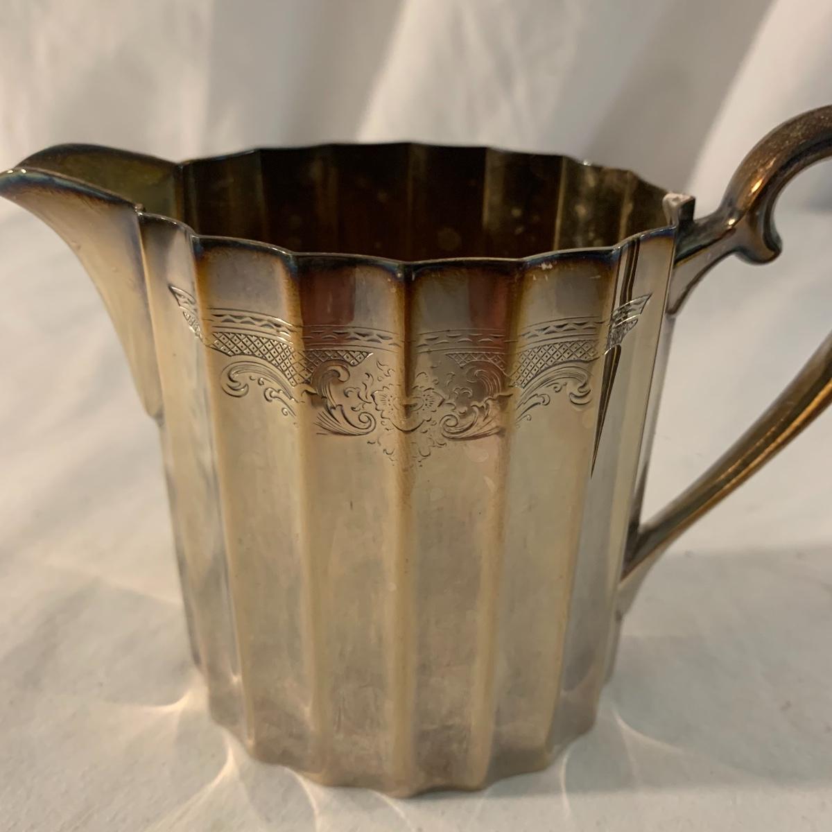 This Tea set is gorgeous! Manufactured by Lunt the set includes a serving tray that measures 22” X 16”, a 9” tea pot, a 6” tea pot, a cream pitcher as well as a covered sugar bowl. All vessels feature a beautiful corrugated body with an engraved design. This set is in good condition but could stand a polishing. All items silver plated.