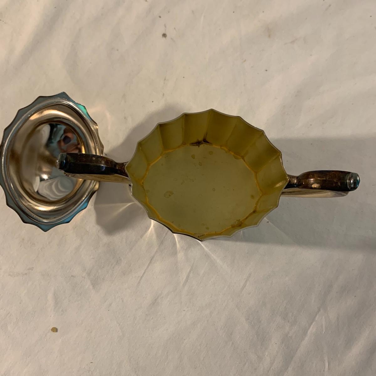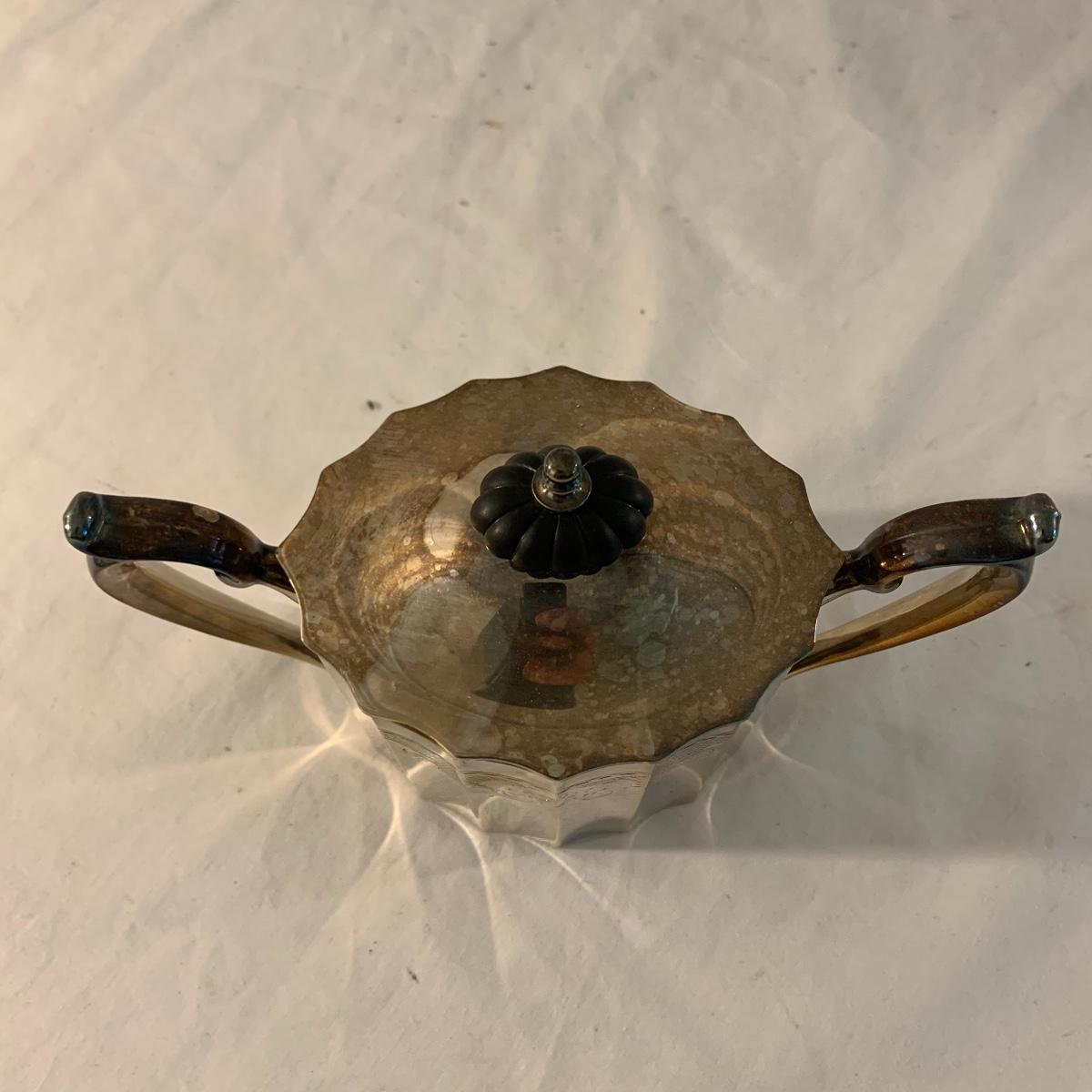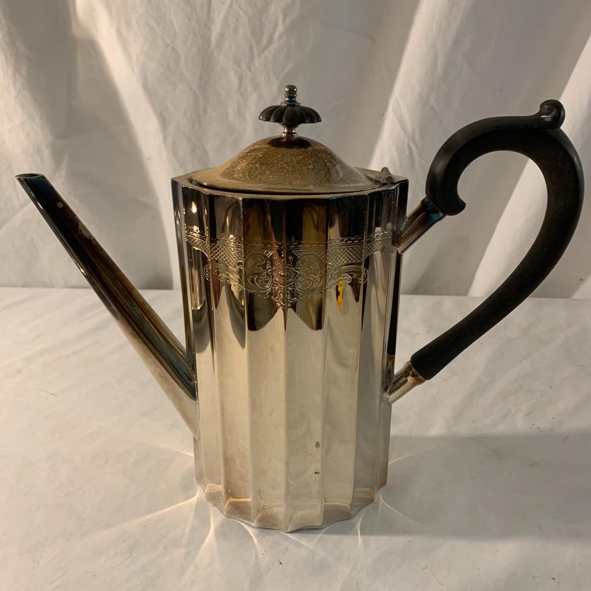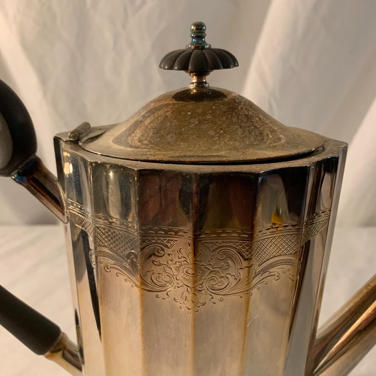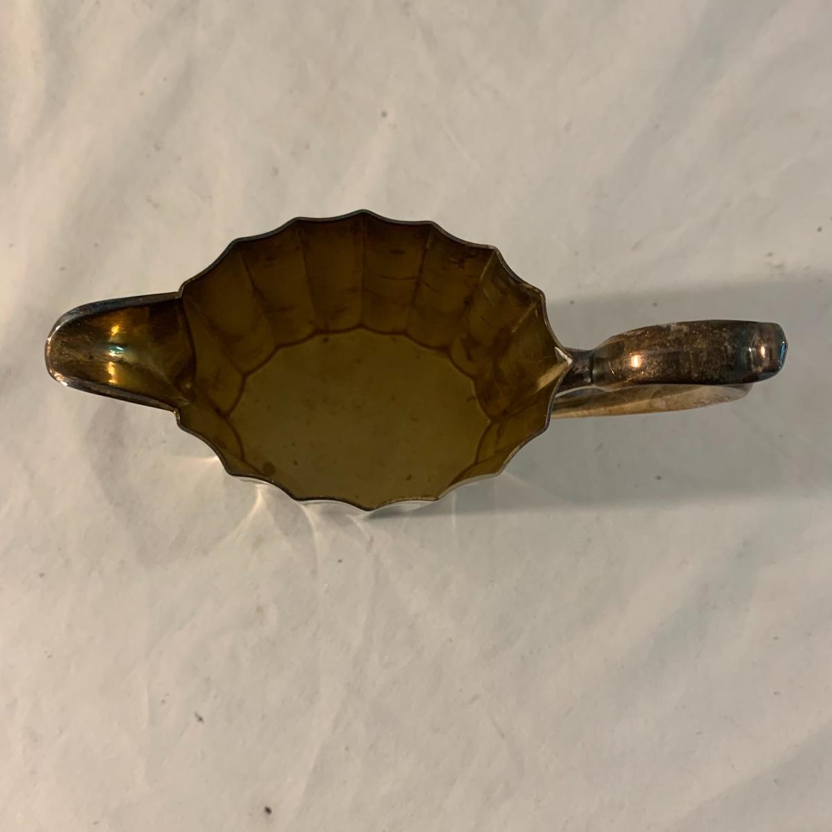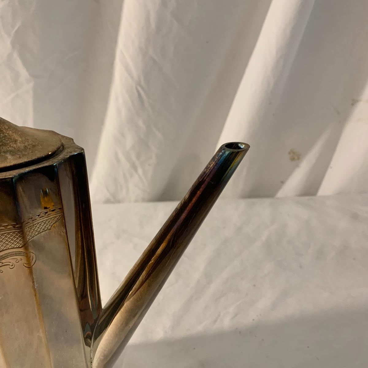 This Tea set is gorgeous! Manufactured by Lunt the set includes a serving tray that measures 22” X 16”, a 9” tea pot, a 6” tea pot, a cream pitcher as well as a covered sugar bowl. All vessels feature a beautiful corrugated body with an engraved design. This set is in good condition but could stand a polishing. All items silver plated.