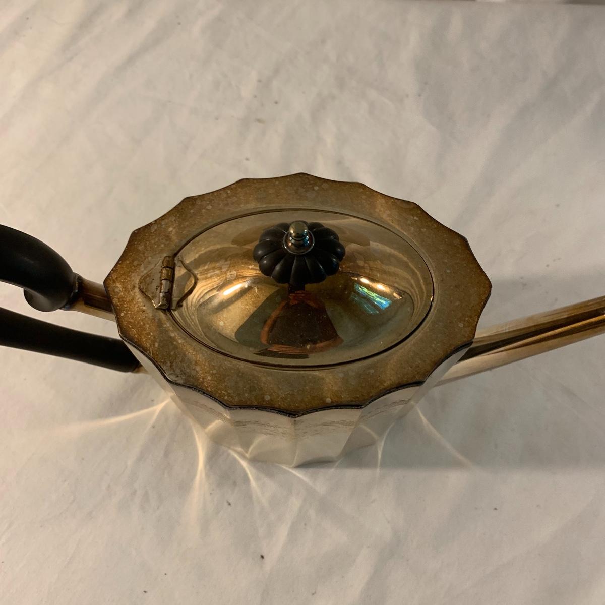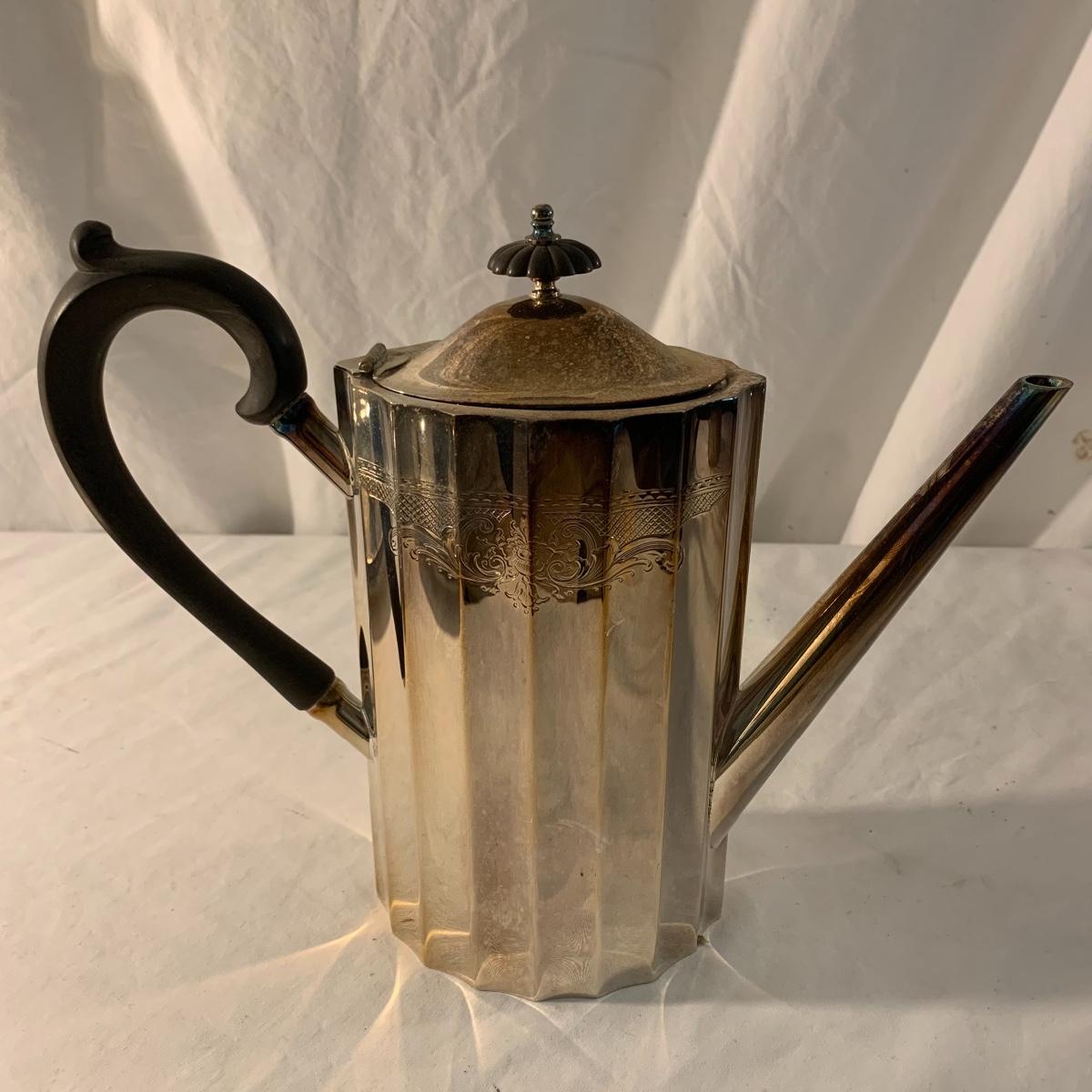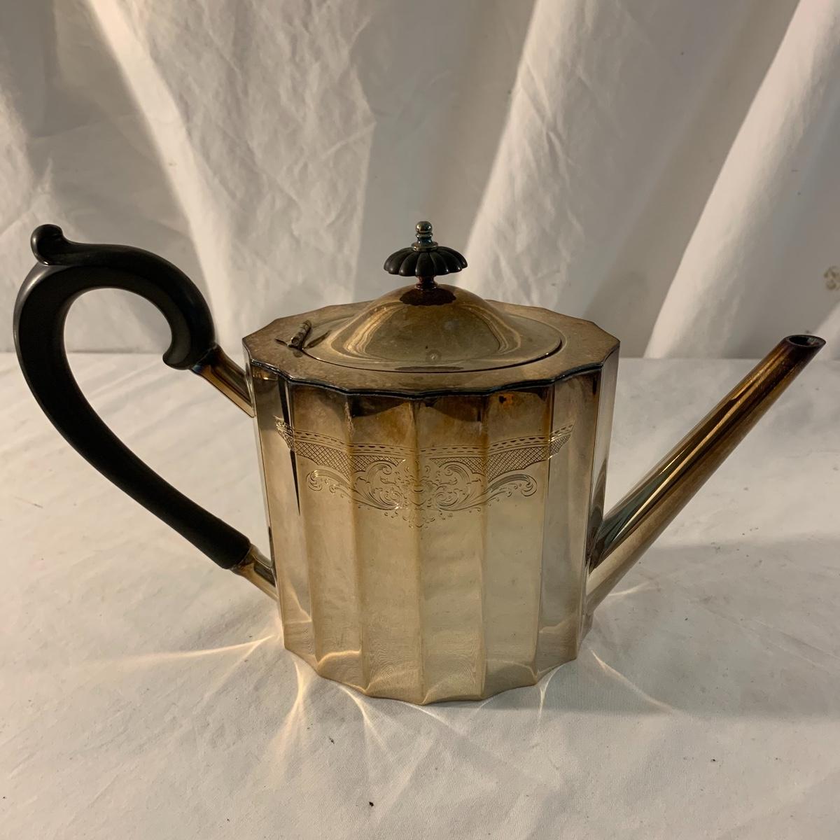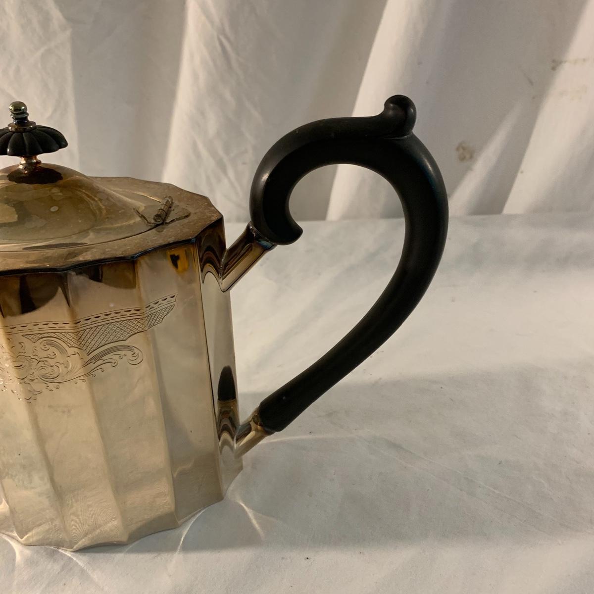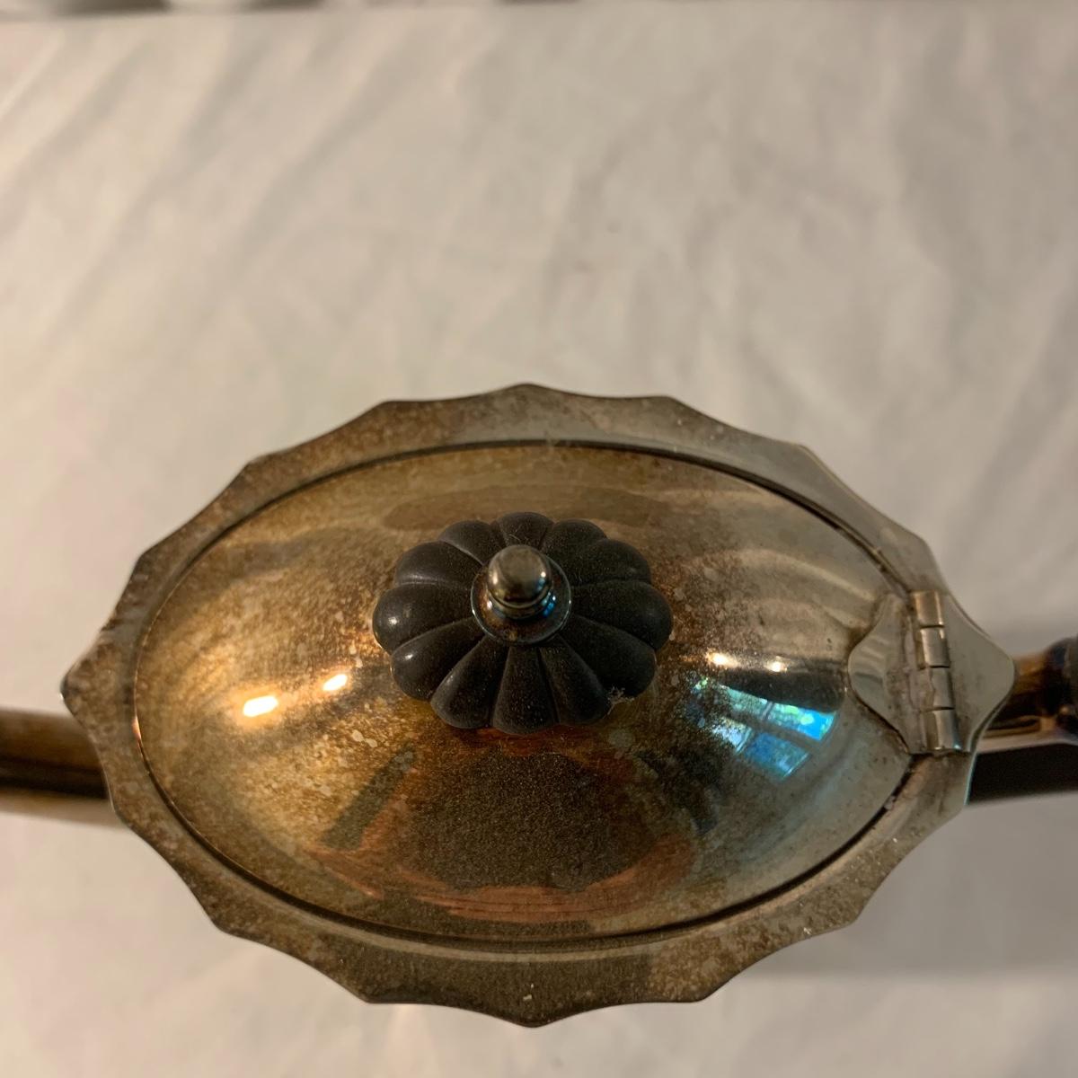This Tea set is gorgeous! Manufactured by Lunt the set includes a serving tray that measures 22” X 16”, a 9” tea pot, a 6” tea pot, a cream pitcher as well as a covered sugar bowl. All vessels feature a beautiful corrugated body with an engraved design. This set is in good condition but could stand a polishing. All items silver plated.