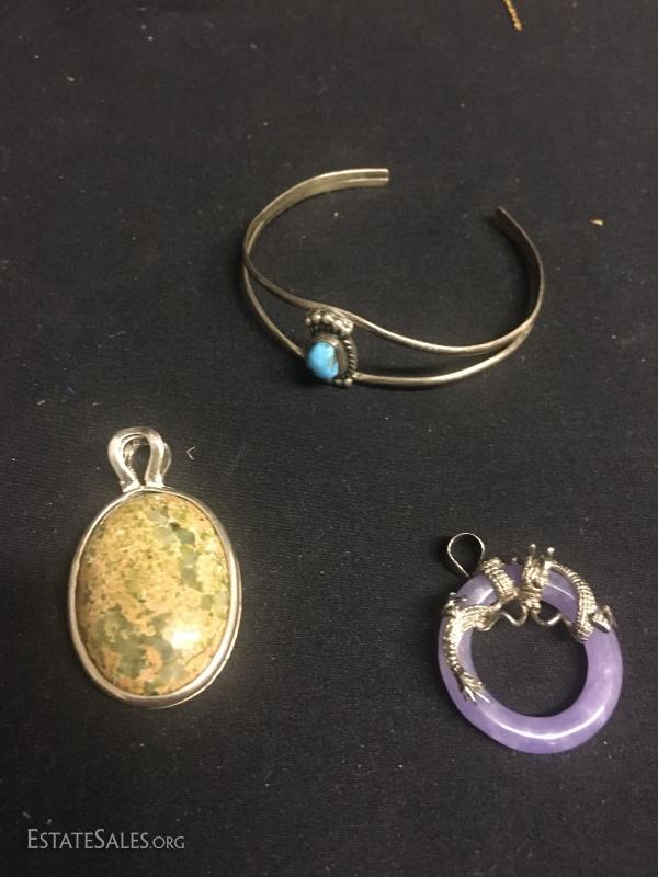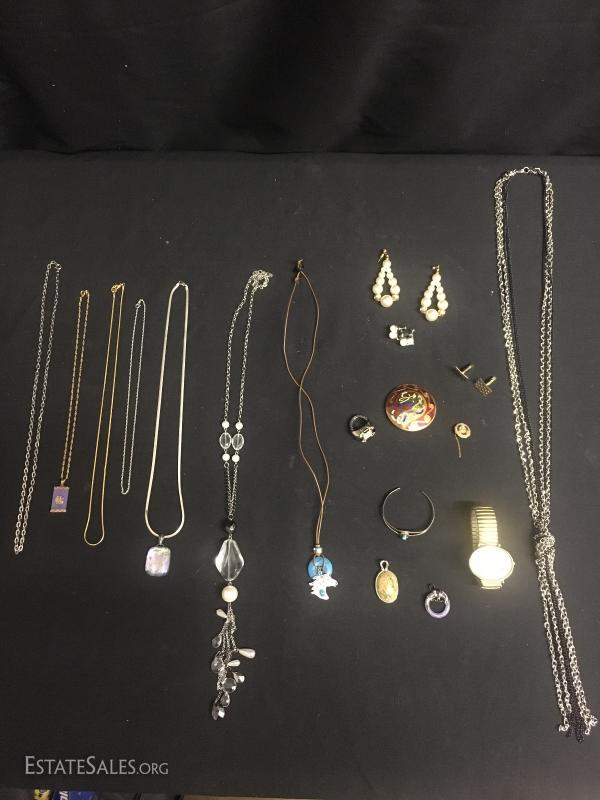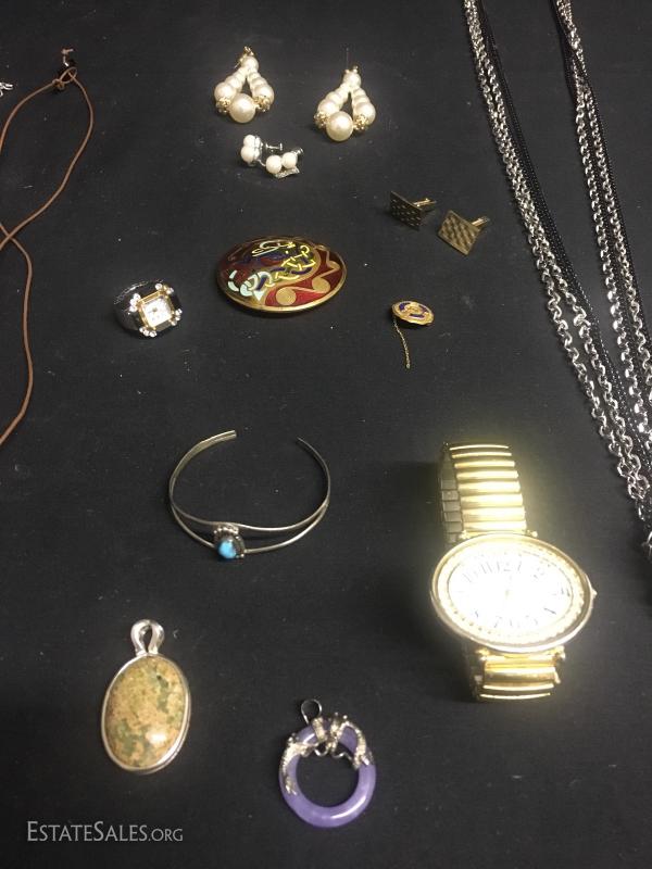 Various pieces including pendants, cuff links, earrings, bracelet, pins and necklaces. This lot is available for shipping or local pick up in Waynesville, NC.