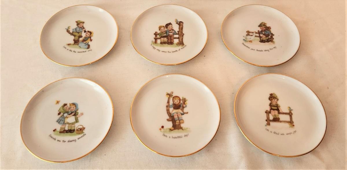 Lot of 6 Vintage Bavarian coasters, each featuring a different Hummel-type scene. 3.75" across.