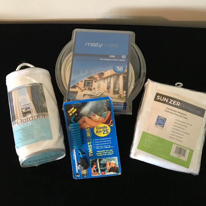 I say this lot is right on time to help you beat the heat with these temperature cooling accessories. Included are two water misters, one a personal mister and the other one longer for a larger area. Also included are easy hang curtains to block sun inside and out. All four items are still in their packaging and have never been used. Local pick up only.