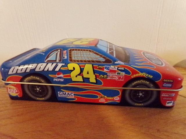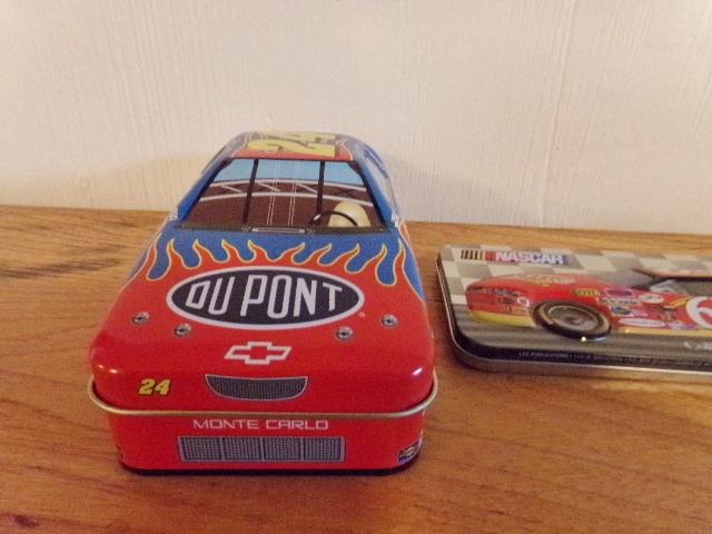 NASCAR TINS, ONE IS SHAPED LIKE JEFF GORDANS CAR AND THE OTHER ONE IS SMALL LIKE A TIN PENCIL BOX. # 17 IS A T-SHIRT SHAPED LIKE A CAR, IT’S SEALED