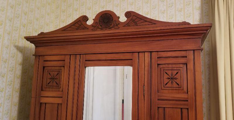 Nice Antique Armoire - good size for homes with 8" ceilings or apartments. Has bottom drawer. All original. Breaks down into three pieces. Circa 1910. Beveled mirror on the front. The back is unfinished, as shown. Solid. Inside has all original hooks, etc, but could use a little love or fresh liner paper. 42" across, 80.5" tall, 19" deep.