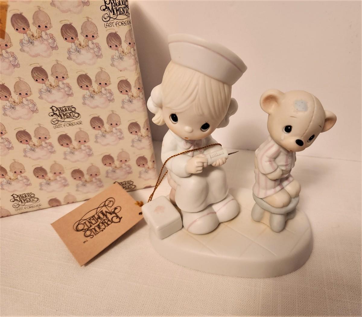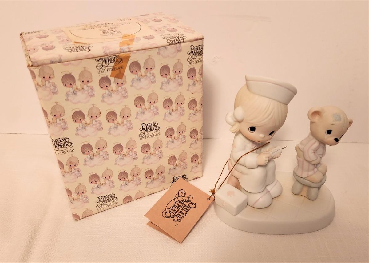 Precious Moments figurine from 1981, design E7158, original 36.00 price tag, 5" tall - note metal "needle" for the "shot." Has box and hang tag.