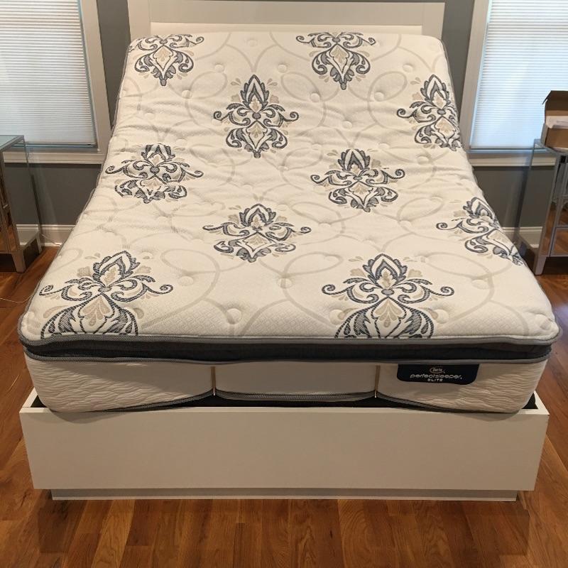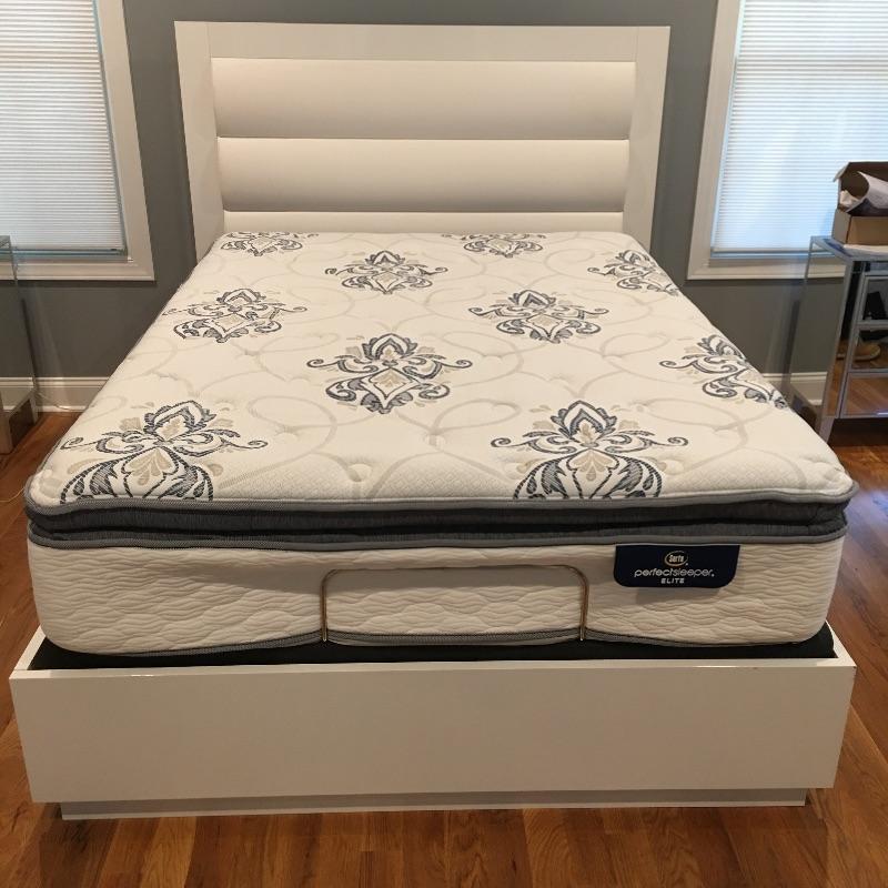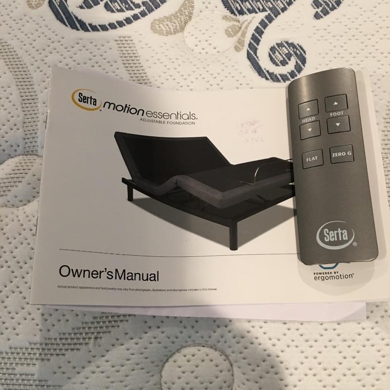 Serta Motion Essentials adjustable foundation and queen headboard with rails. This whole setup was purchased only last year in September, so save yourself money but have a like new bed. Remote controlled adjustable foundation and Italian made headboard that is Formica and what seems to be leather. Winning bidder may take mattress if wanted but is not required. This whole setup was purchased last year in September. Bring help item is substantial.