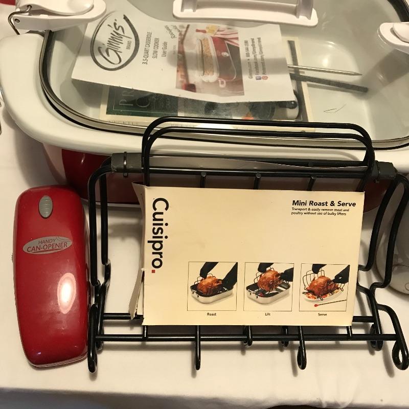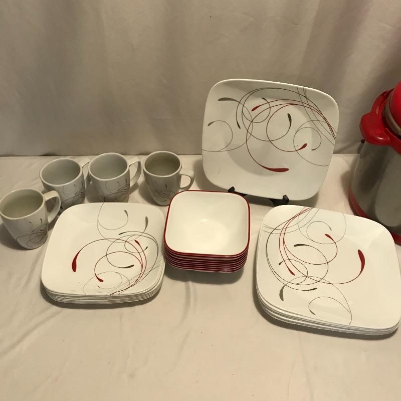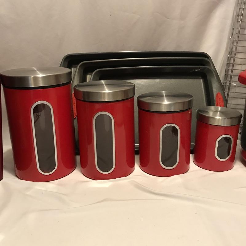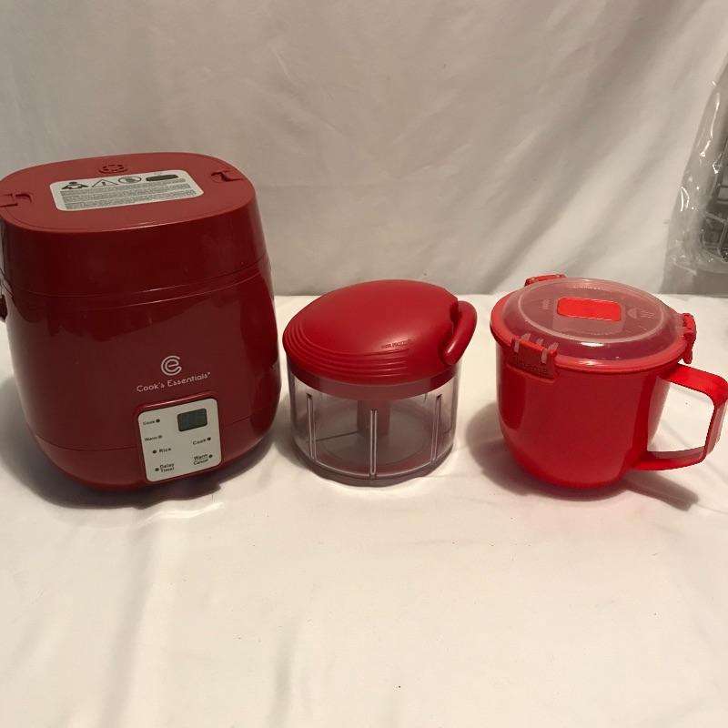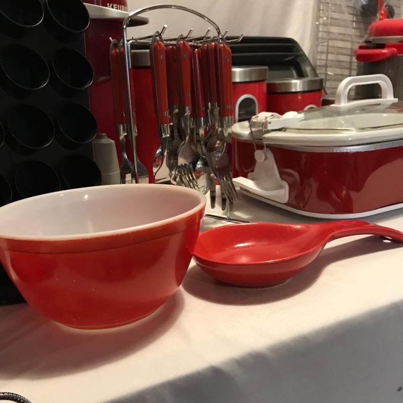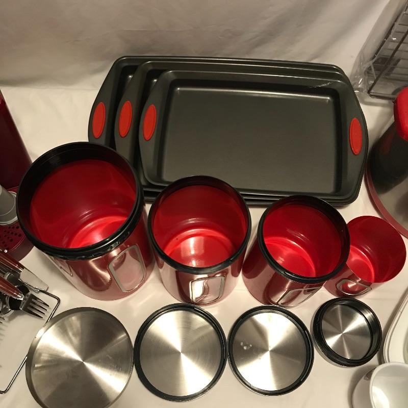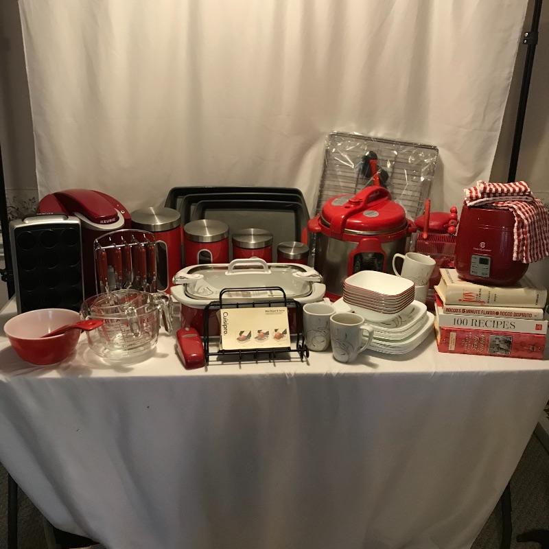 Upgrade or redesign your kitchen with stylish red flair! Appliances included all turned on when connected to power and include a Keurig with pod holder, a pressure cooker, a rice cooker that appears never used and an electric casserole dish. An eight person set of Corelle Vitrelle plates and bowls with four matching mugs. A four-person flatware collection on a cute hanging rack with one coffee spoon missing. Lot also includes three Pyrex measuring bowls with a red vintage mixing bowl, spoon rest, manual chopper, wash clothes and kitchen towel. Lot also includes a new, unassembled rolling organizer rack, a red themed knife display and clean four canister set with lids. See photos, some items and dishes need to be cleaned. Local pick up only.