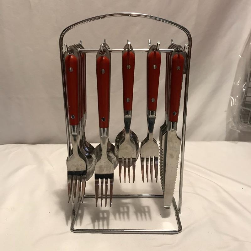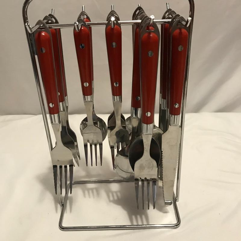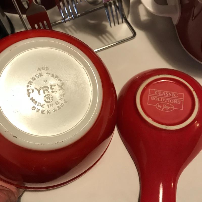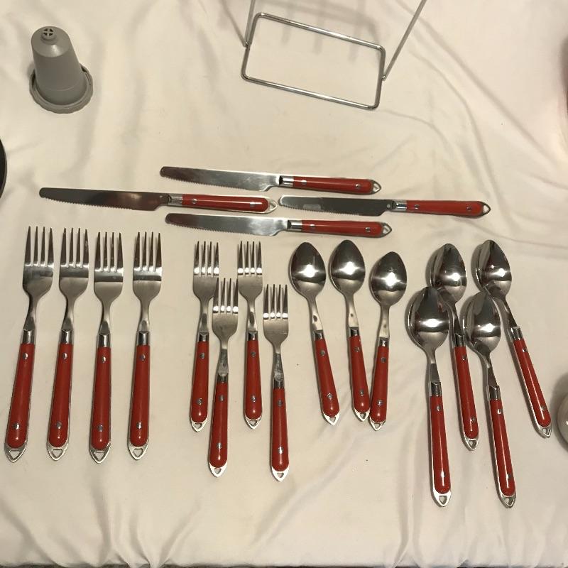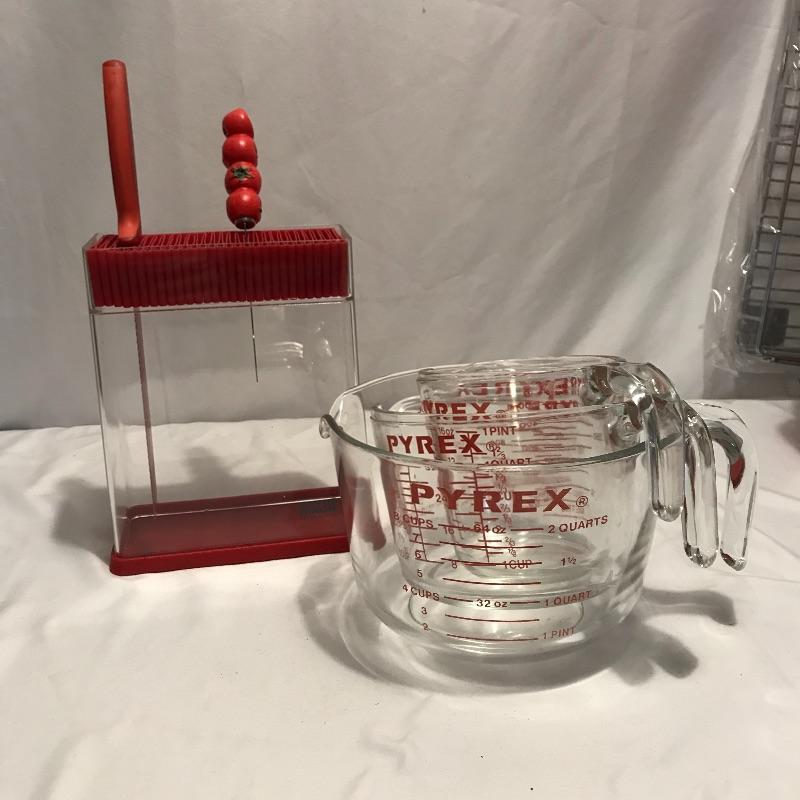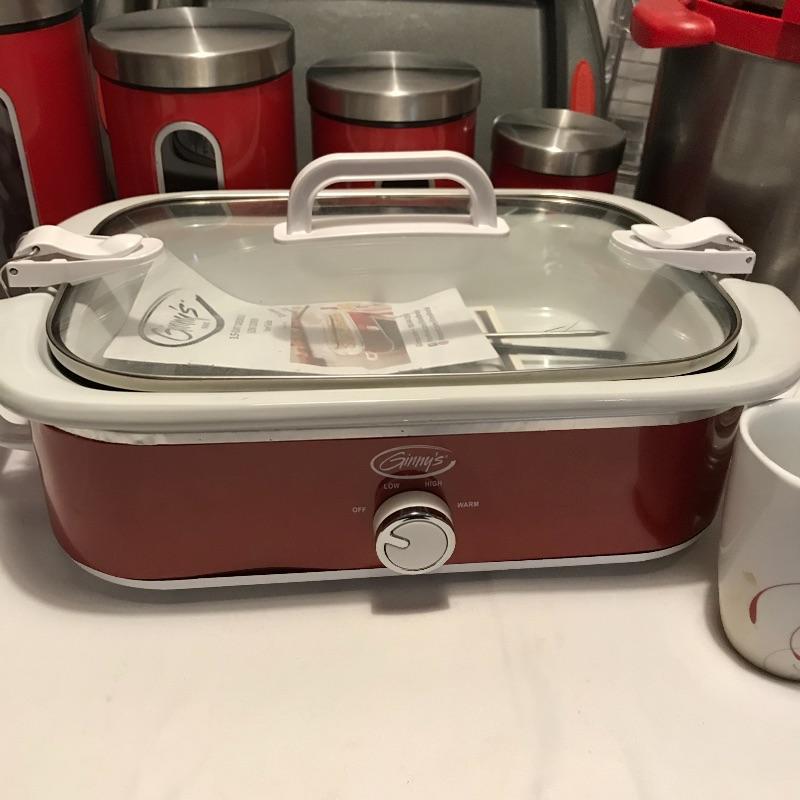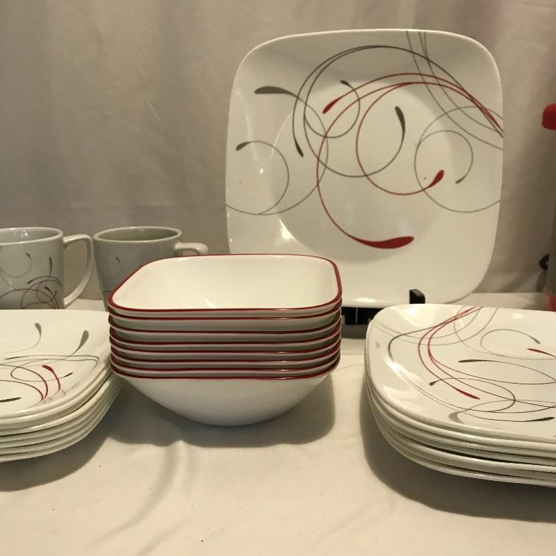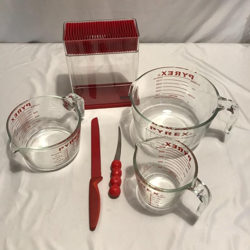 Upgrade or redesign your kitchen with stylish red flair! Appliances included all turned on when connected to power and include a Keurig with pod holder, a pressure cooker, a rice cooker that appears never used and an electric casserole dish. An eight person set of Corelle Vitrelle plates and bowls with four matching mugs. A four-person flatware collection on a cute hanging rack with one coffee spoon missing. Lot also includes three Pyrex measuring bowls with a red vintage mixing bowl, spoon rest, manual chopper, wash clothes and kitchen towel. Lot also includes a new, unassembled rolling organizer rack, a red themed knife display and clean four canister set with lids. See photos, some items and dishes need to be cleaned. Local pick up only.