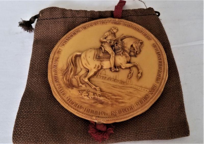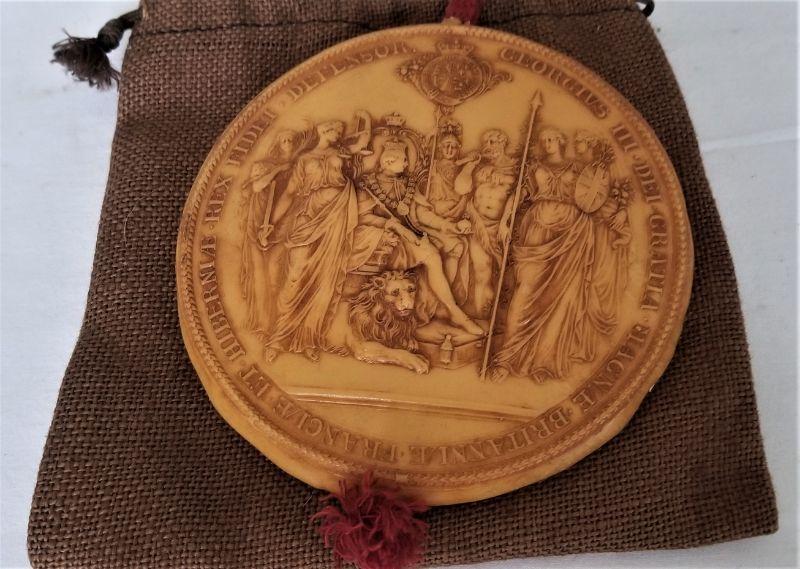 Resin two-sided reproduction George III Medallion in burlap bag - measures 6" across. Reenactment item