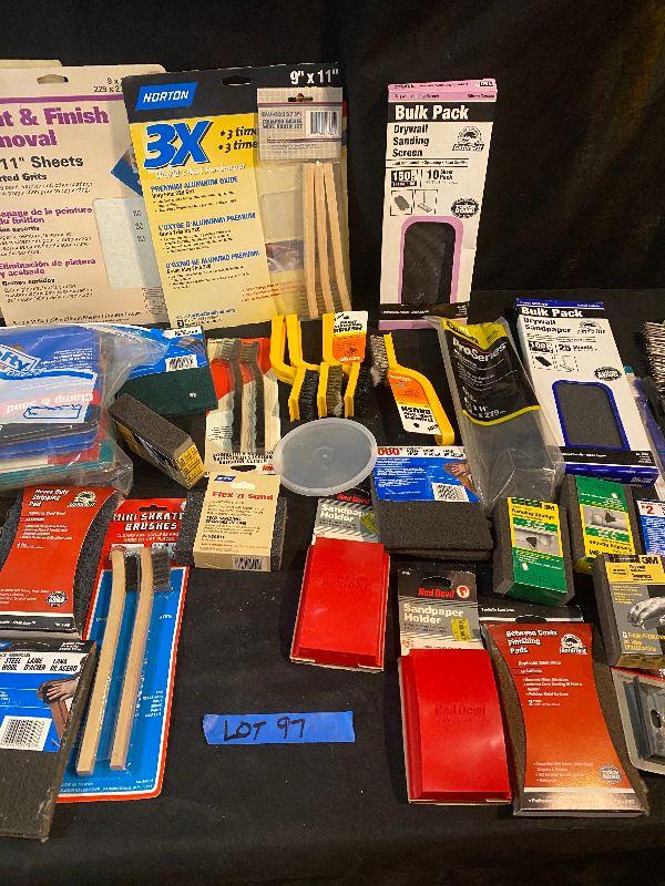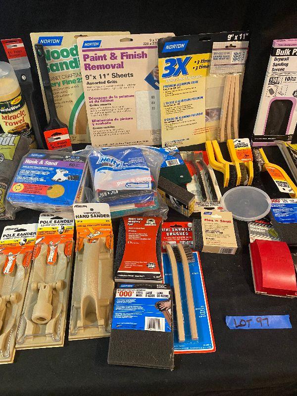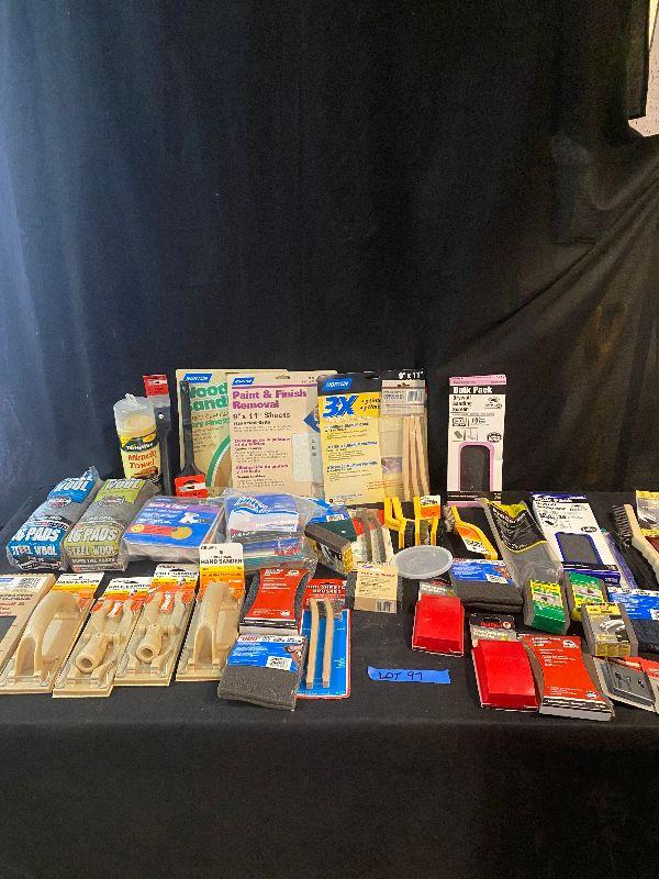 Lot 97 - Sanding Hardware/Supplies (new hand sander, hook & sand, hook & loop, steel wool, paint scrapers, stainless steel, wire brush, sand paper and much more!)