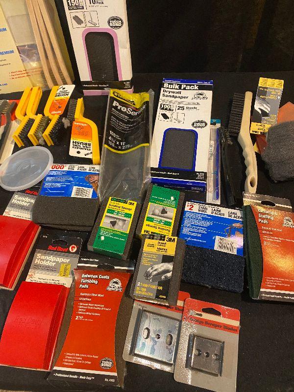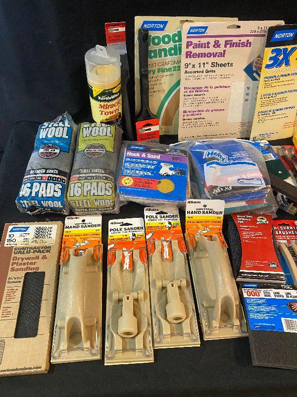 Sanding hardware/supplies including new hand sander, hook & sand, hook & loop, steel wool, paint scrapers, stainless steel, wire brush, sand paper and more.