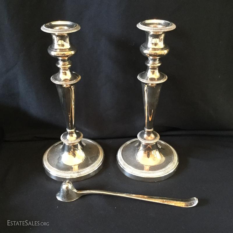 Pair of matching candlesticks, 11.5" tall, includes candle snuffer.