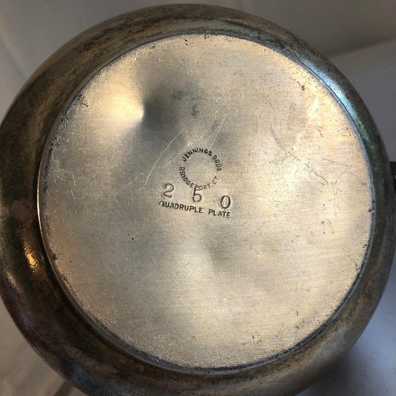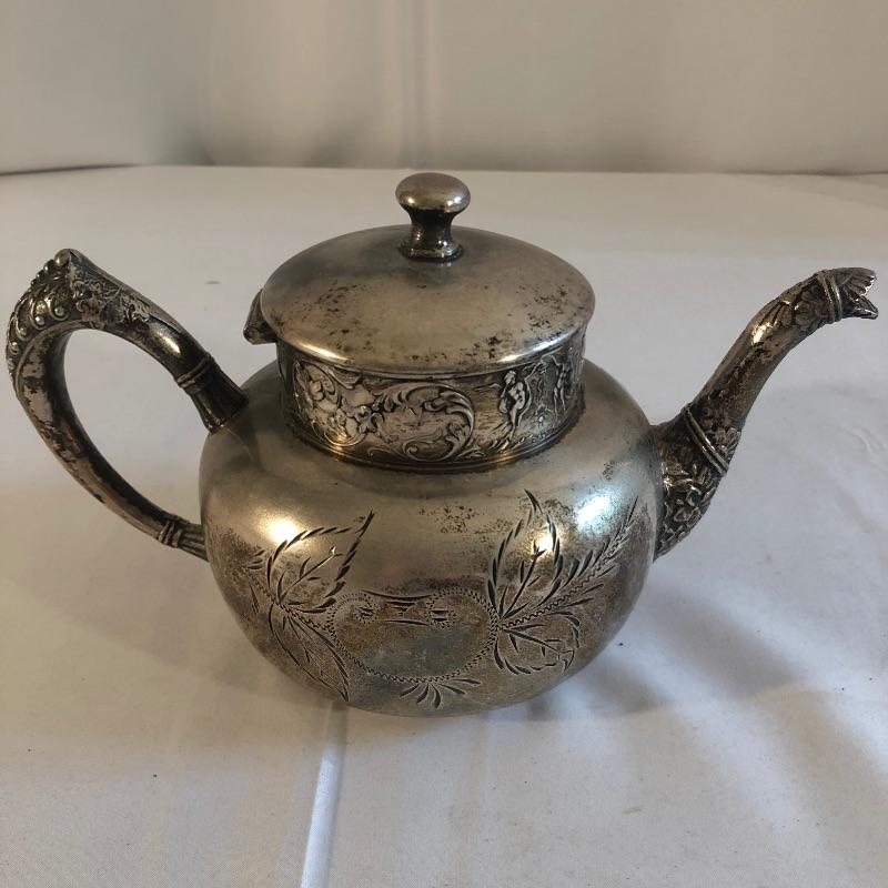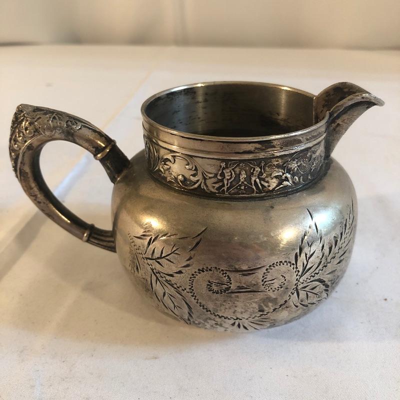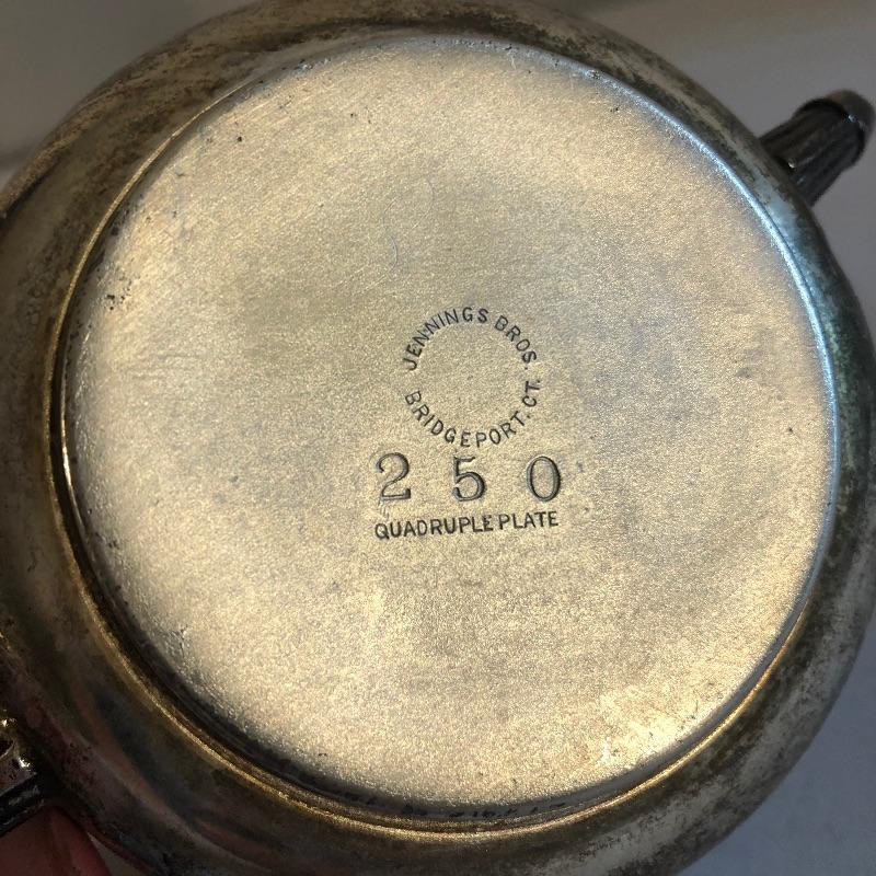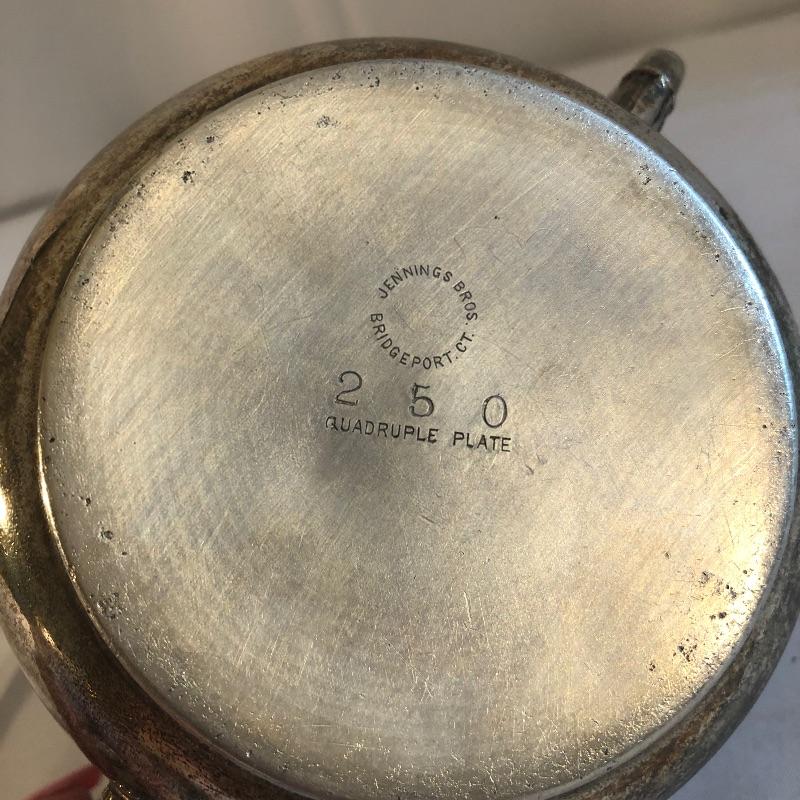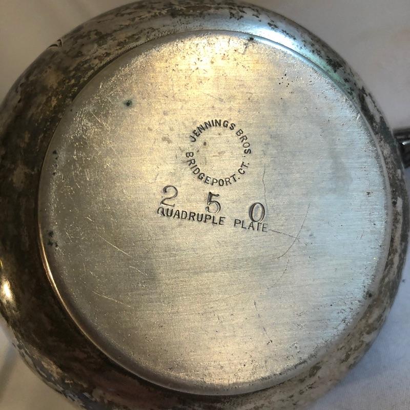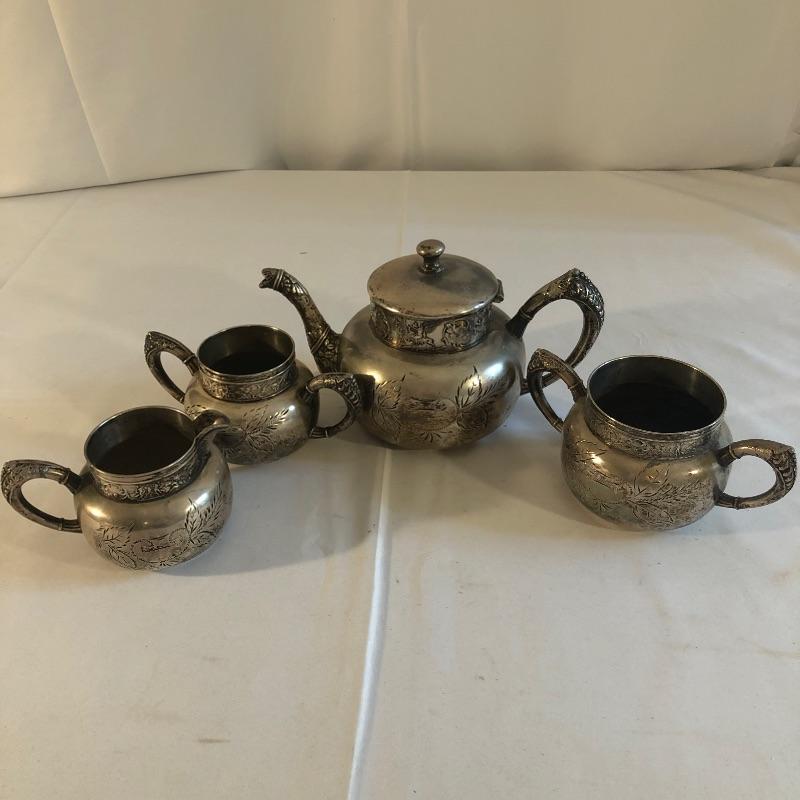 Four piece set of Jennings Bros quadruple plate silver serving pitchers. The intricate detailing on these pieces makes them extraordinary. Teapot measures 10”W x 6”H. Shipping available.
