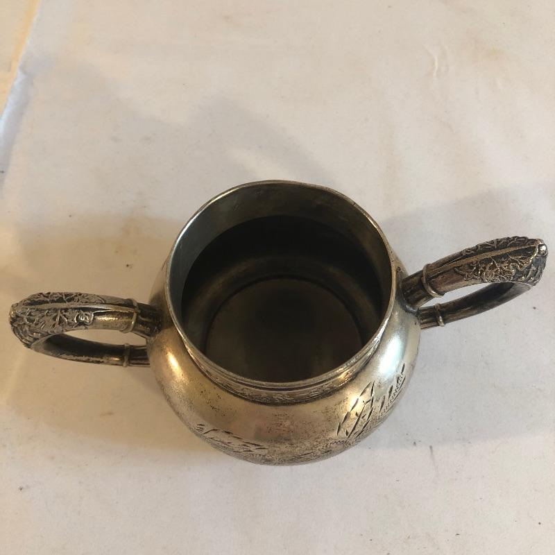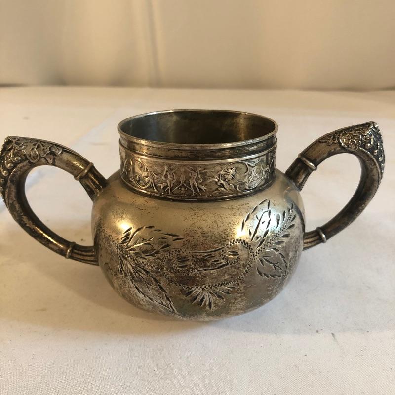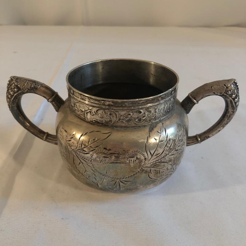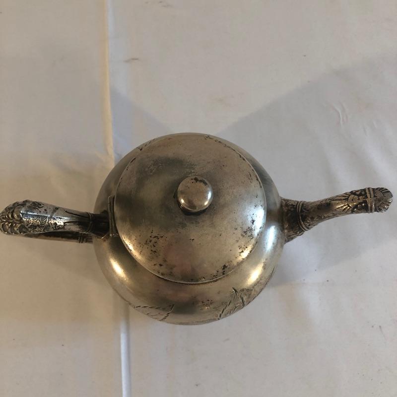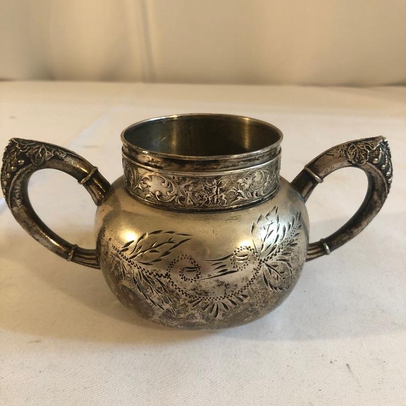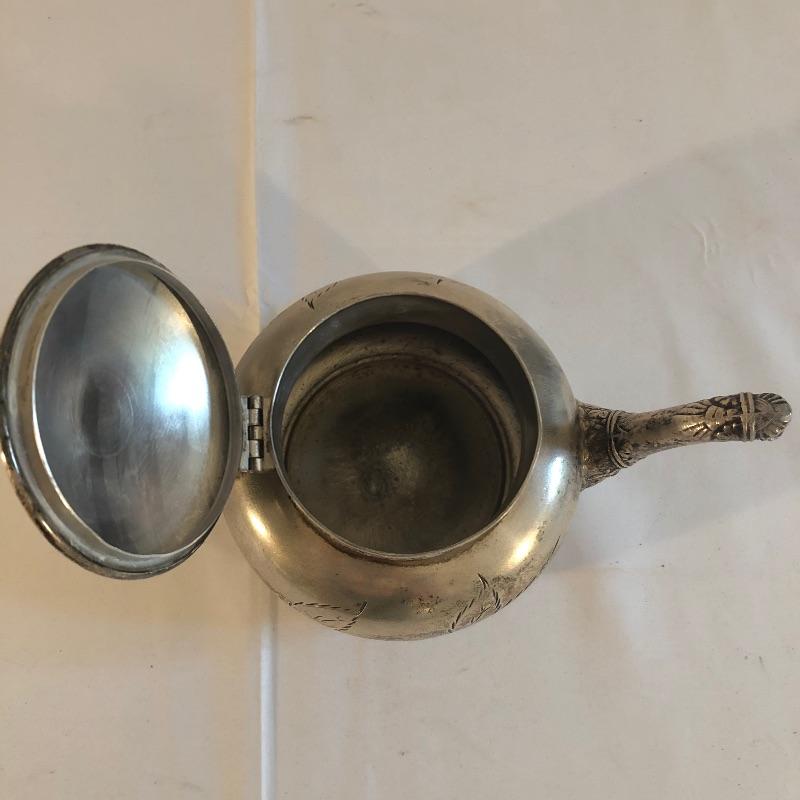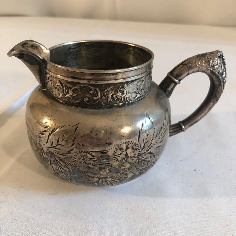 Four piece set of Jennings Bros quadruple plate silver serving pitchers. The intricate detailing on these pieces makes them extraordinary. Teapot measures 10”W x 6”H. Shipping available.