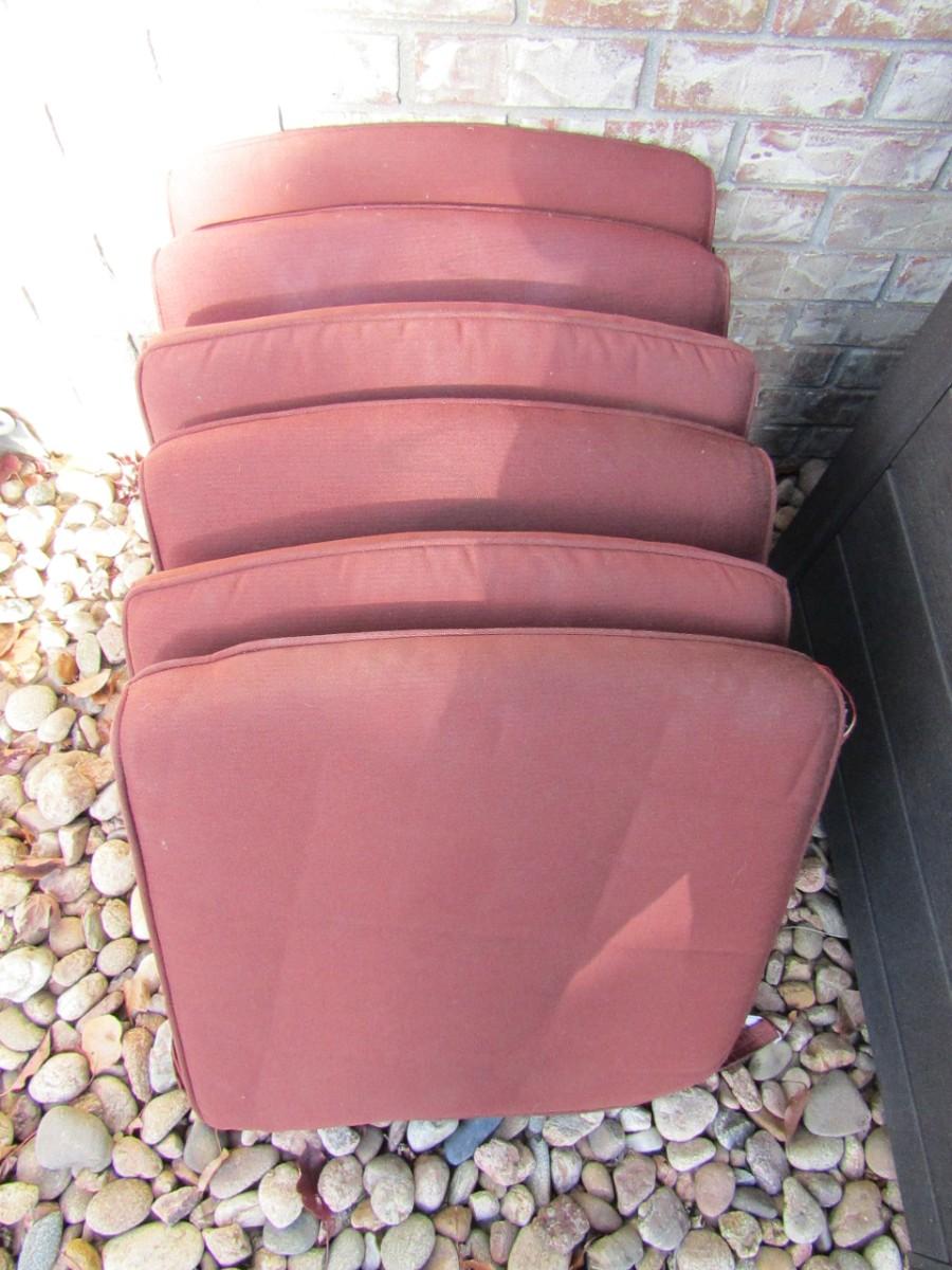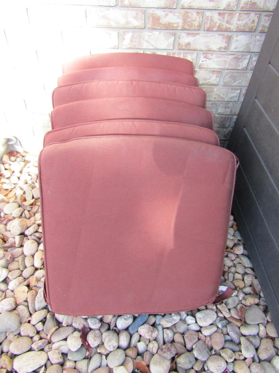 SIX FAIRLY THICK SEAT CUSHIONS THAT MEASURE 20" SQUARE. THEY ALL NEED TO BE CLEANED BUT ARE OTHERWISE IN VERY GOOD SHAPE