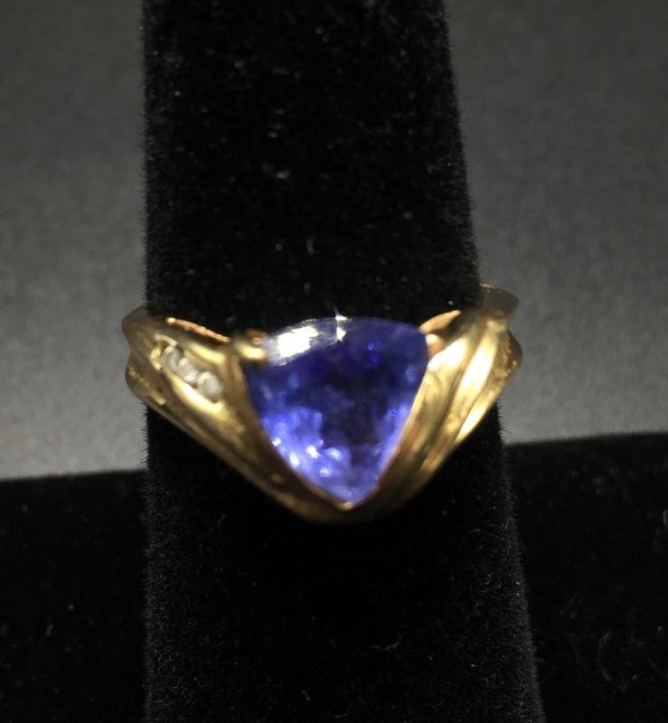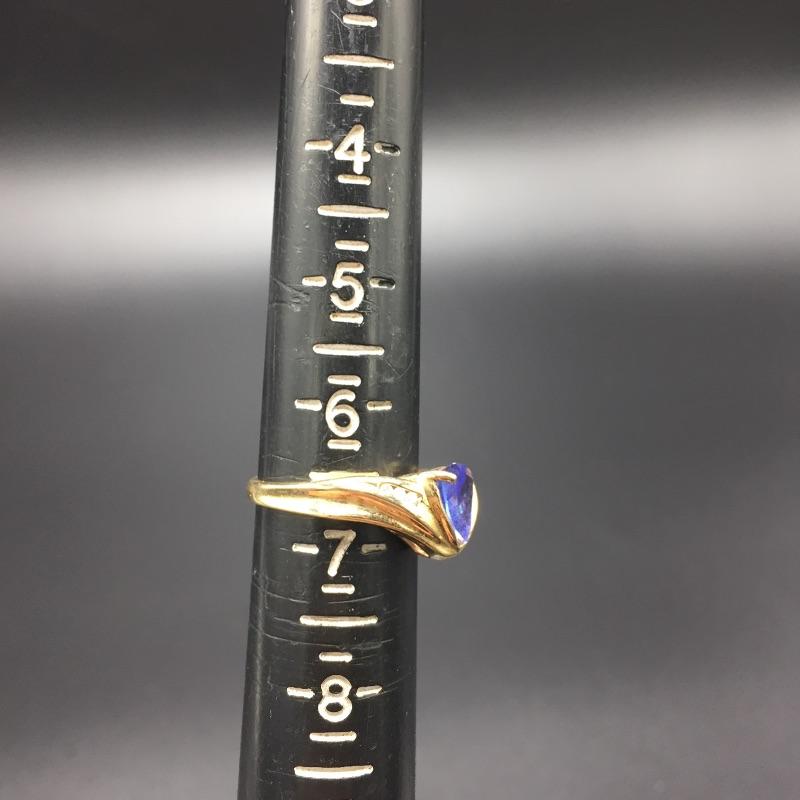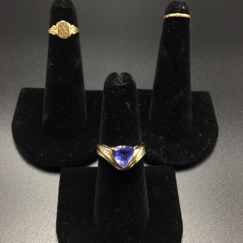 Three 10K rings one with blue stone all stamped 10K. See pictures for sizes.