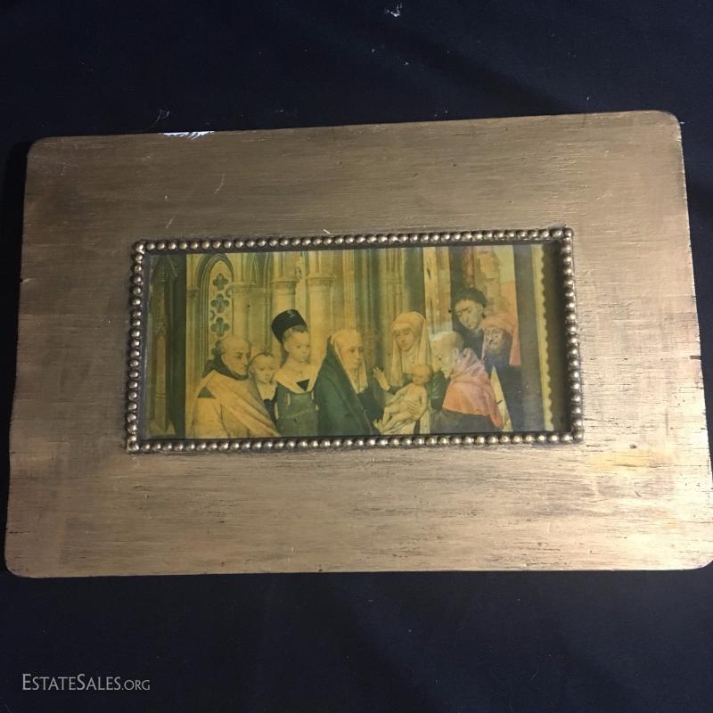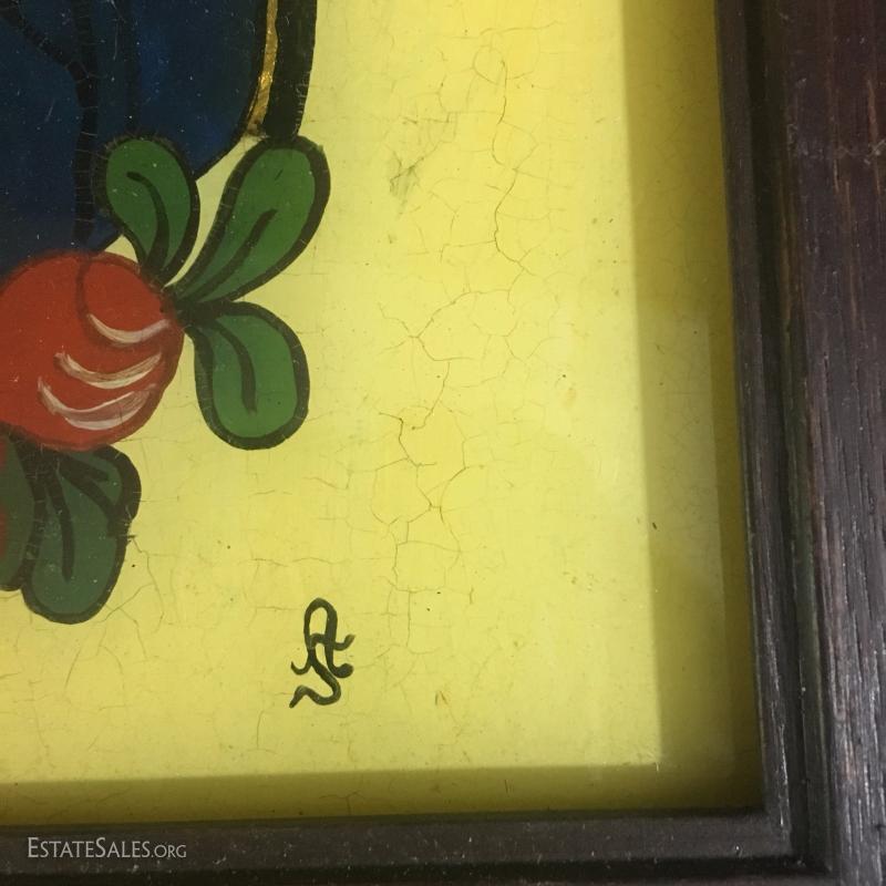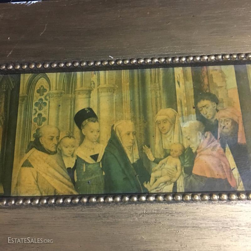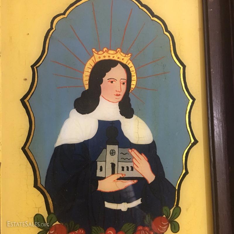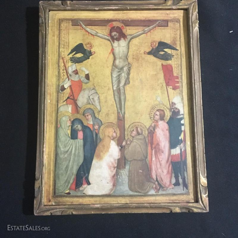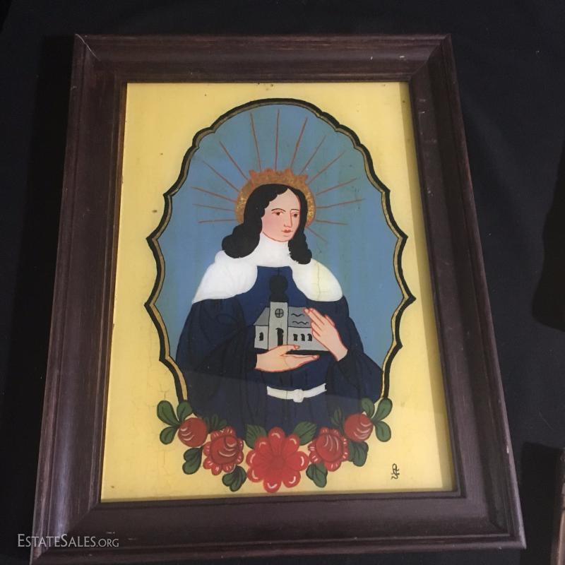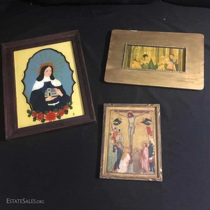 Three small religious prints. Gold and yellow tones. Colorful Mary 13.5 " l x 10.5"w. Jesus 6.5"l x 8.5"w. Group 12"l x 8"w.