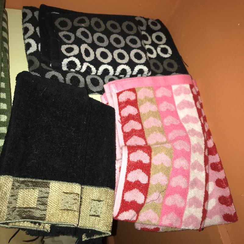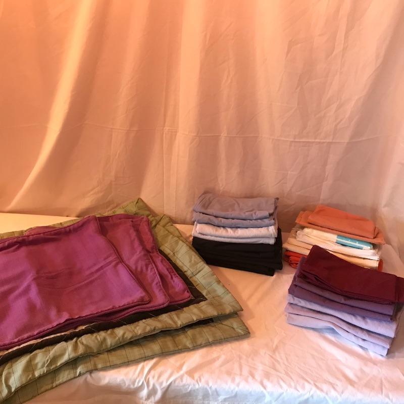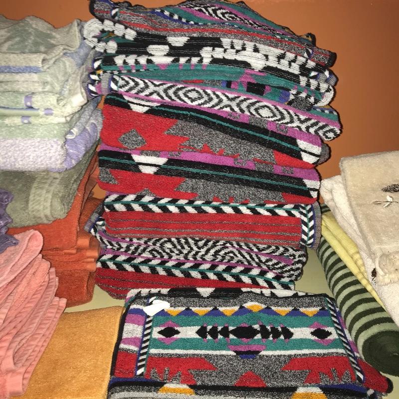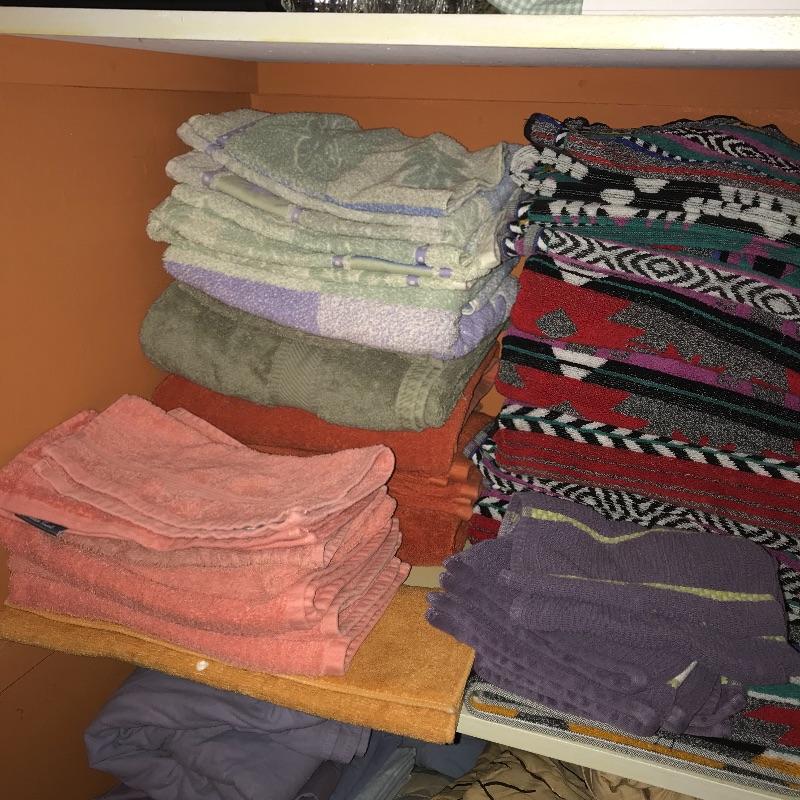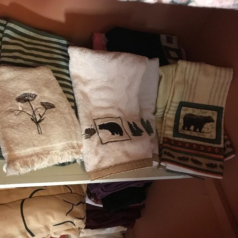 This is a great lot to rejuvenate or replace your current linens. Lot features bold colors and some southwest themes. There is a bold warm toned orange/maroon twin bed set with matching sheets and comforter. There is a silhouette cat comforter which appears to be a twin size as well. Lot features three smaller purple Pottery Barn throw pillow covers, two quilted larger green themed throw covers and two southwest large throw covers with matching bedskirt. The bedskirt appears to be a double, but tags have been removed and we cannot confirm. Along with a plethora of themes for your bed, we’re also offering different themes for your bathroom with pastel leaf design, bears, olive green stripes and more. See photos. Local pick up only