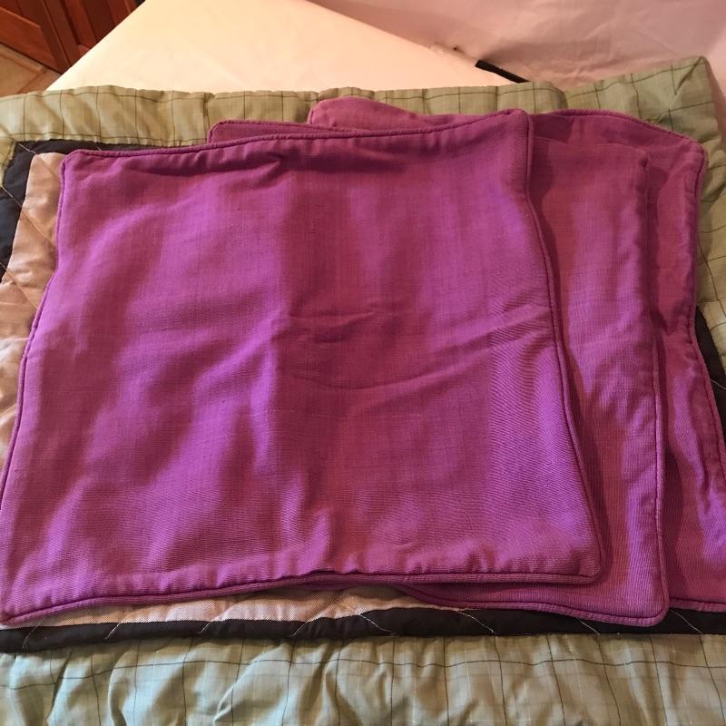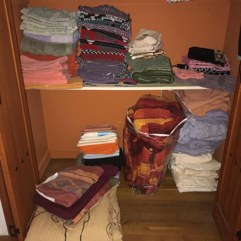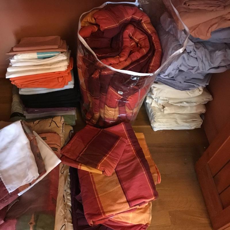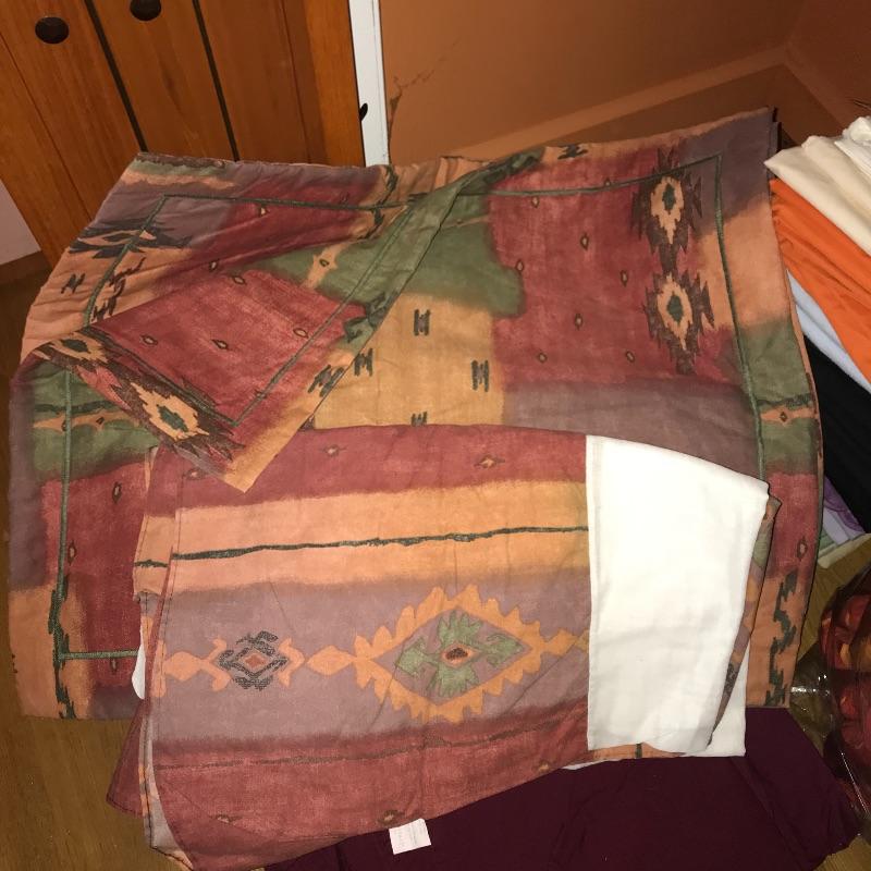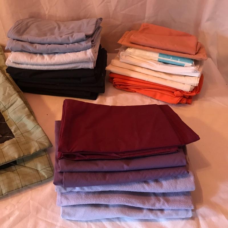 This is a great lot to rejuvenate or replace your current linens. Lot features bold colors and some southwest themes. There is a bold warm toned orange/maroon twin bed set with matching sheets and comforter. There is a silhouette cat comforter which appears to be a twin size as well. Lot features three smaller purple Pottery Barn throw pillow covers, two quilted larger green themed throw covers and two southwest large throw covers with matching bedskirt. The bedskirt appears to be a double, but tags have been removed and we cannot confirm. Along with a plethora of themes for your bed, we’re also offering different themes for your bathroom with pastel leaf design, bears, olive green stripes and more. See photos. Local pick up only