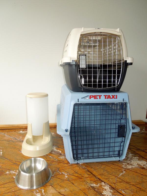Portable cat carriers and feeding bowls are used, but clean. Carrier come apart in middle and need fasteners. Mesh doors are removable and latches work. No broken parts.