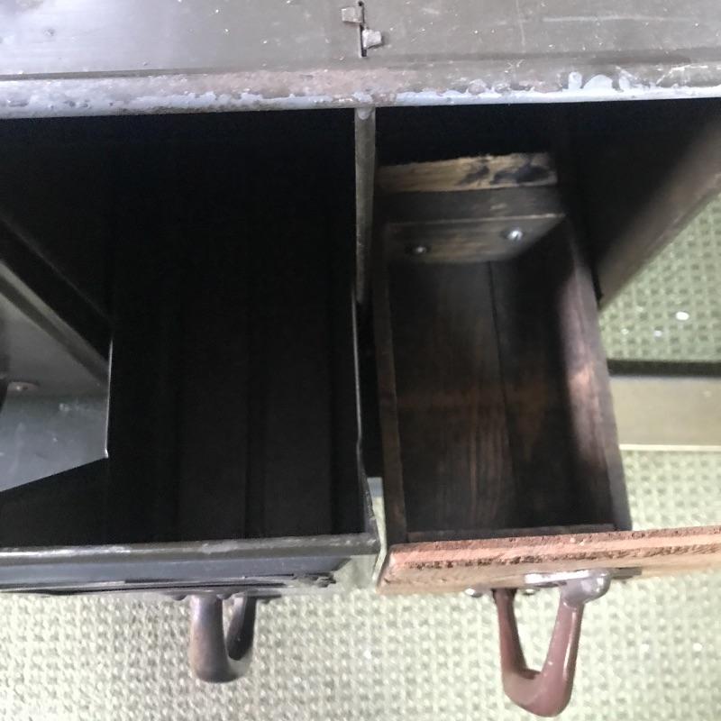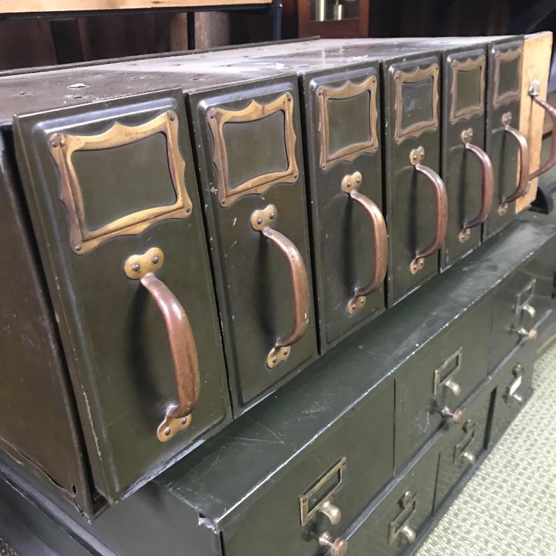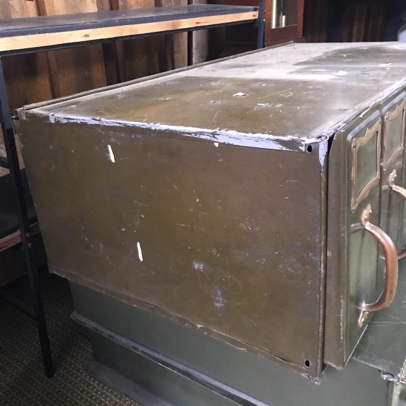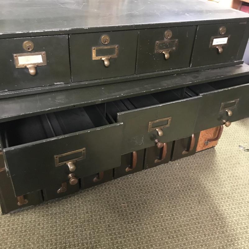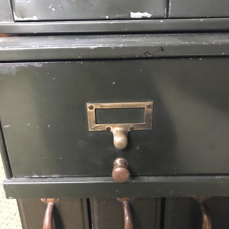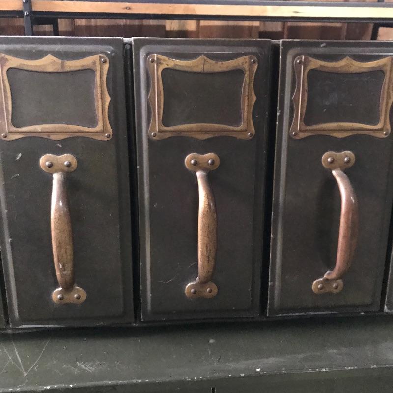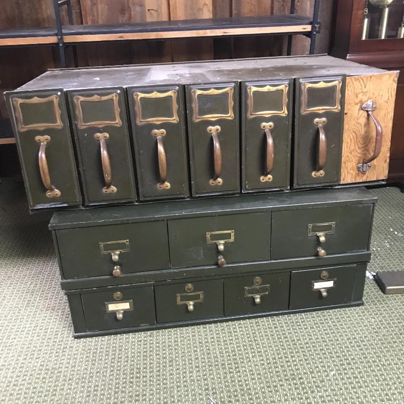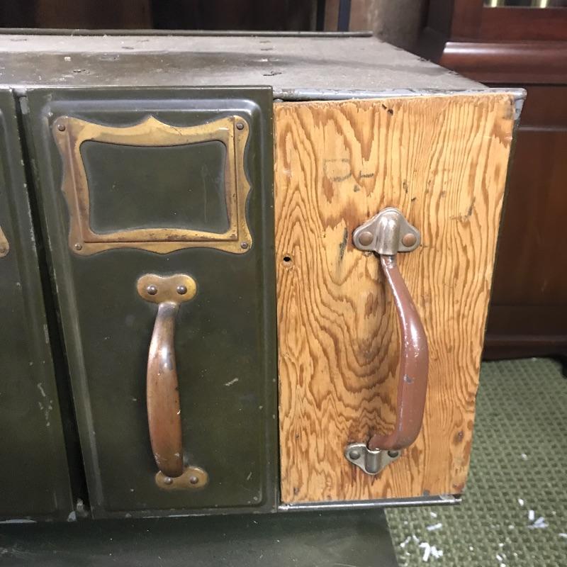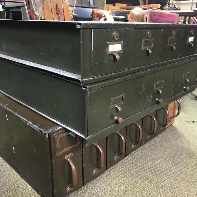 Trio of filing cabinets. All stacked on top of each other in photos. Super cool retro filing cabinet opens lateral. One drawer on end was missing and it looks like someone handmade a new one. Key is missing. The other two open classic style for notecards or other storage. Use in a kitchen for recipes? In a bathroom for storage? Get creative! Largest cabinet measures 19” x 35” x 11”. Local Pickup Only