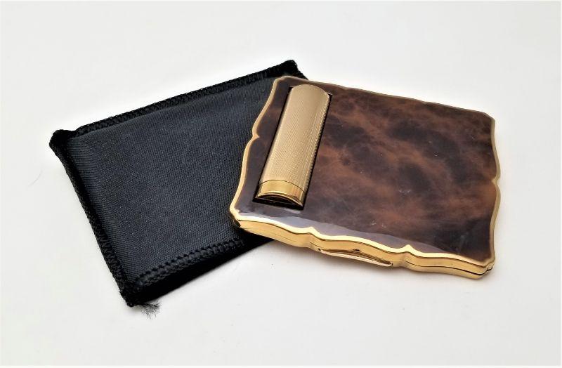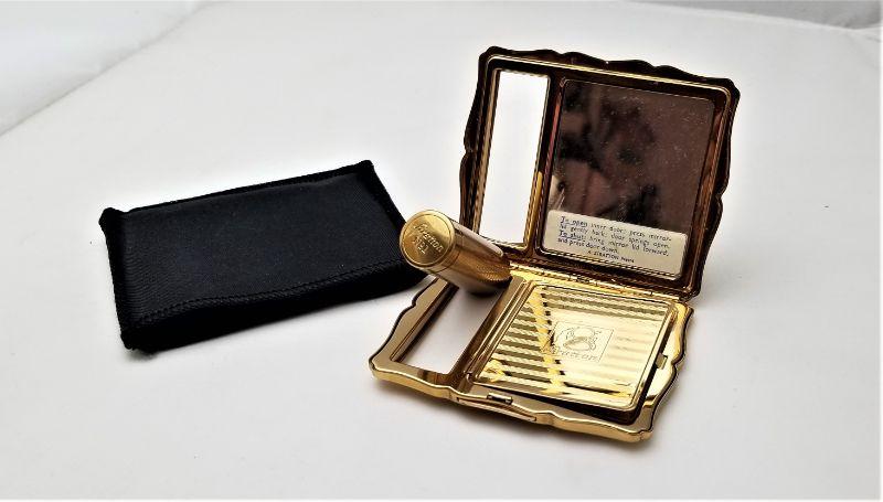 This combination compact/lipstick case by Stratton is a real beauty and is in excellent condition. Lipstick side has never been used. Complete with moire fabric carrying case. Measures 3.25" x 2.75".