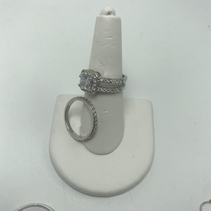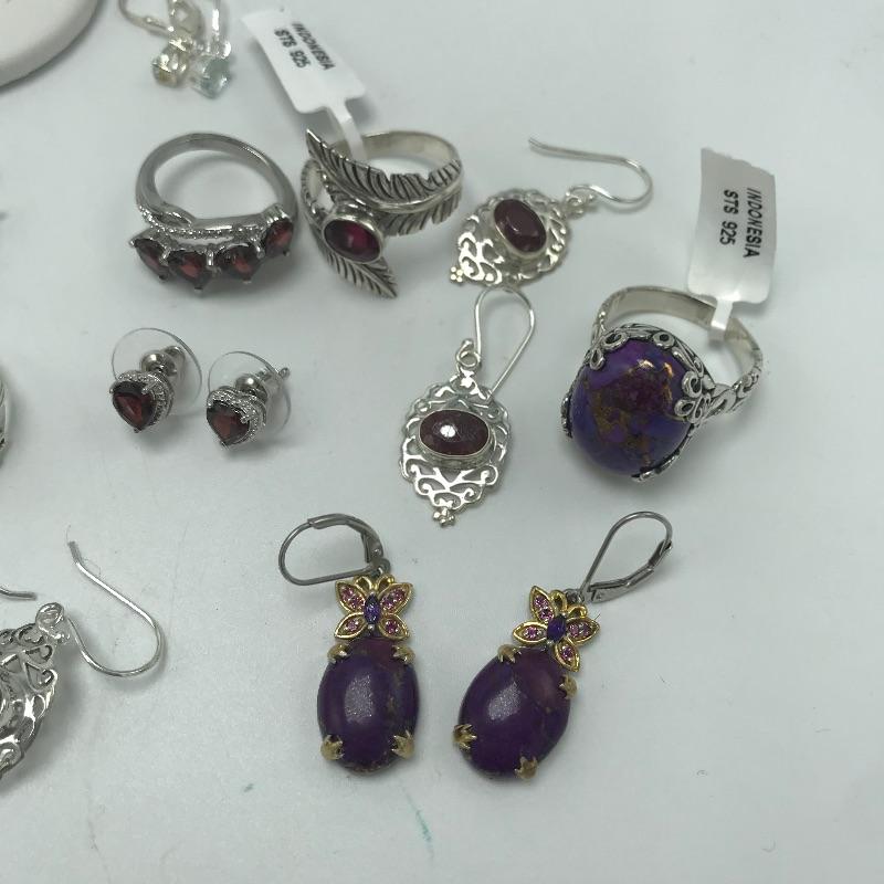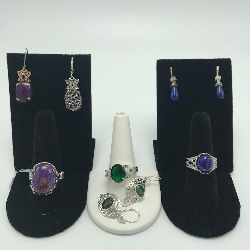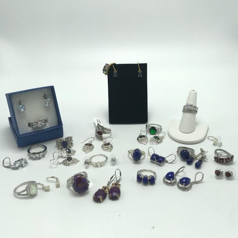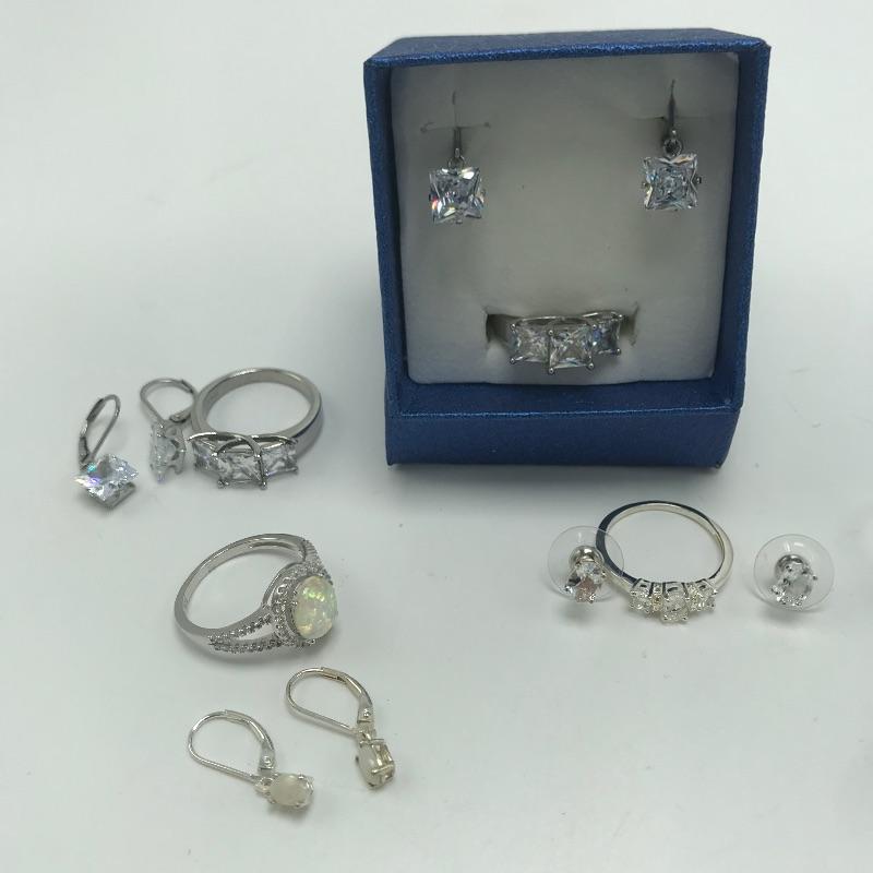 Get coordinated and mix and match! Large collection of sets with stones and gems ring and earring sets. All earrings are for pierced ears with French wire, posts and loops. The wedding set does not appear to be marked. Twin sets (one in gift box) Quartz-like gems rings are marked 316L S.Steel and earrings in set do not have known markings. Most other rings and earrings are marked 925, some also marked STS. See photos for ring sizes.
