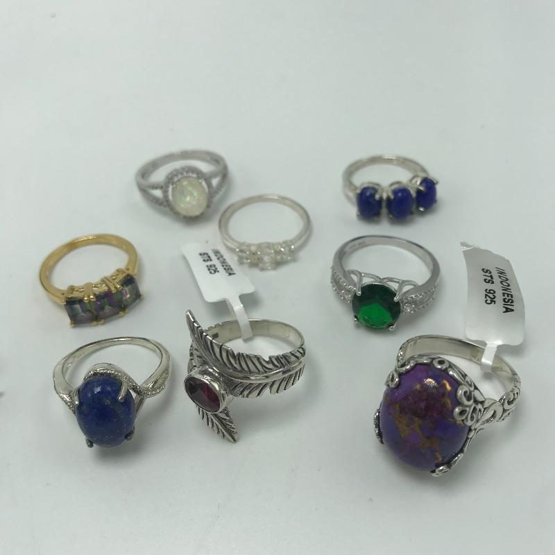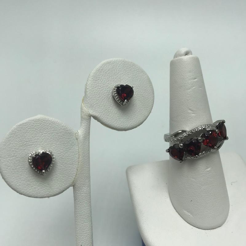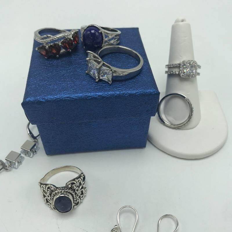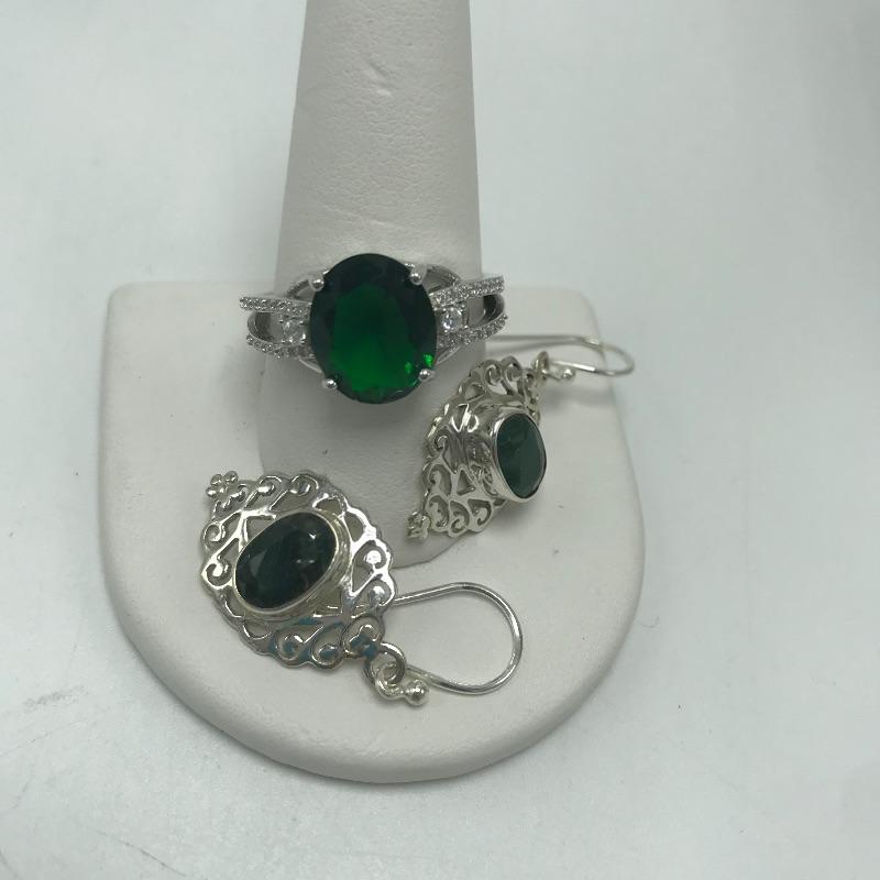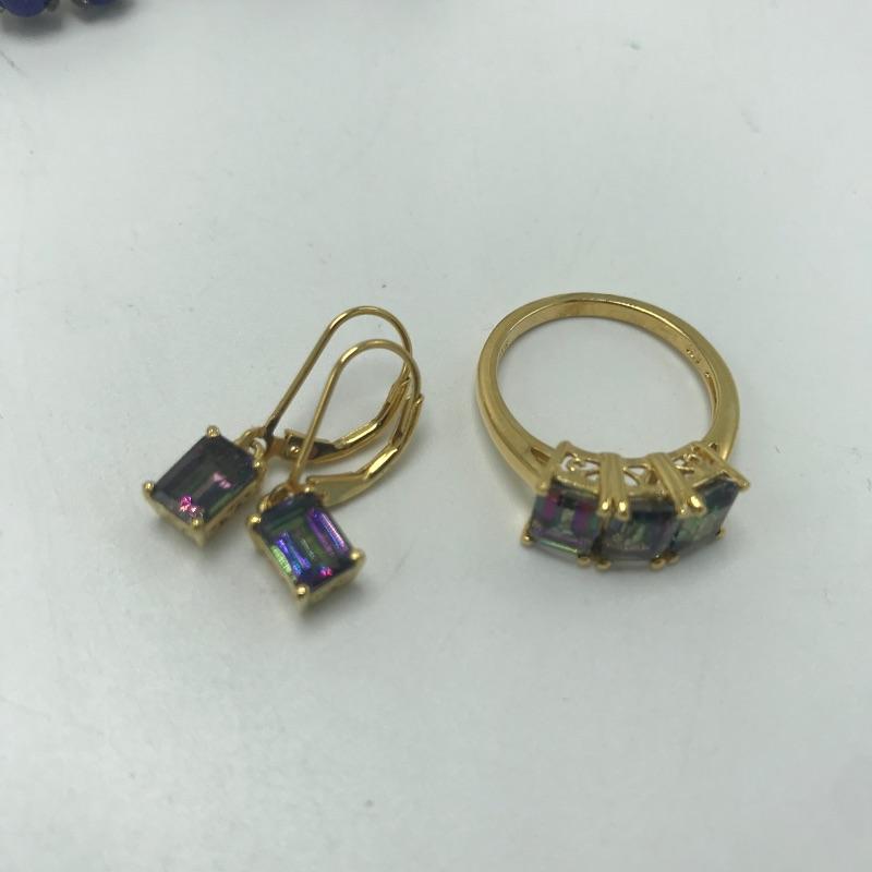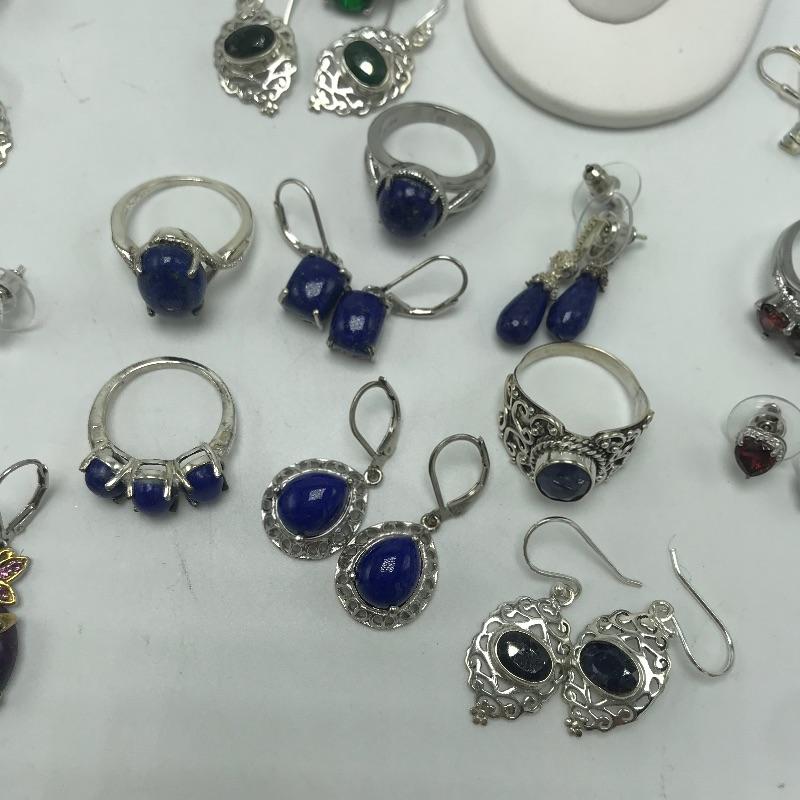 Get coordinated and mix and match! Large collection of sets with stones and gems ring and earring sets. All earrings are for pierced ears with French wire, posts and loops. The wedding set does not appear to be marked. Twin sets (one in gift box) Quartz-like gems rings are marked 316L S.Steel and earrings in set do not have known markings. Most other rings and earrings are marked 925, some also marked STS. See photos for ring sizes.