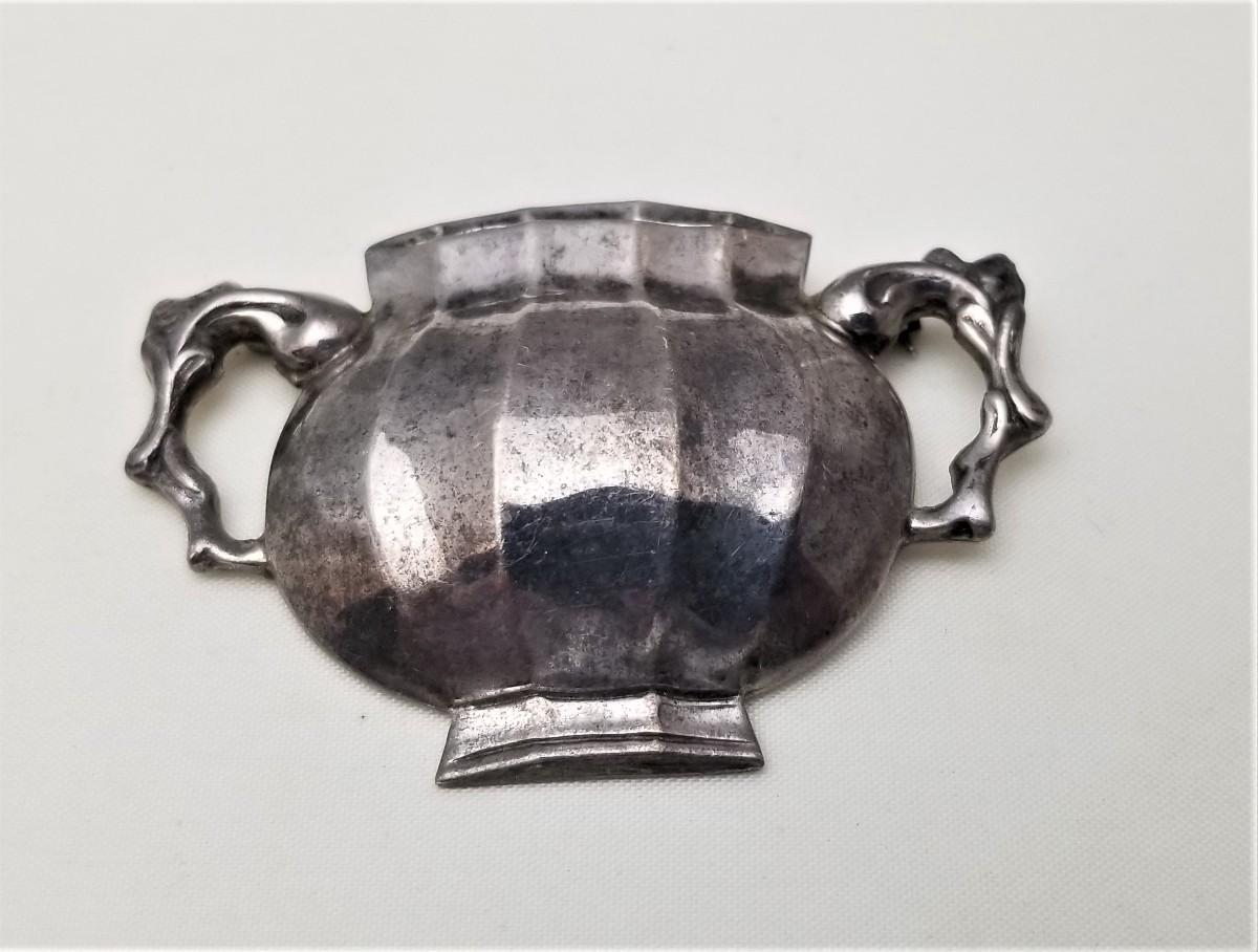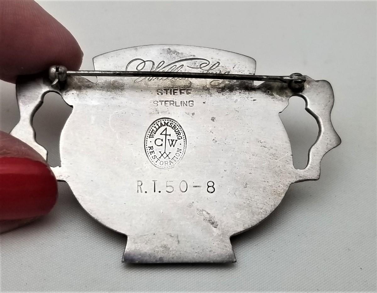 Part of the Colonials Williamsburg Collection by Steiff - Sterling Silver booch in the form of a Sugar Bowl. Fully marked on reverse. Good vintage condition. 2.75" across. You would polish this up or leave the patina.