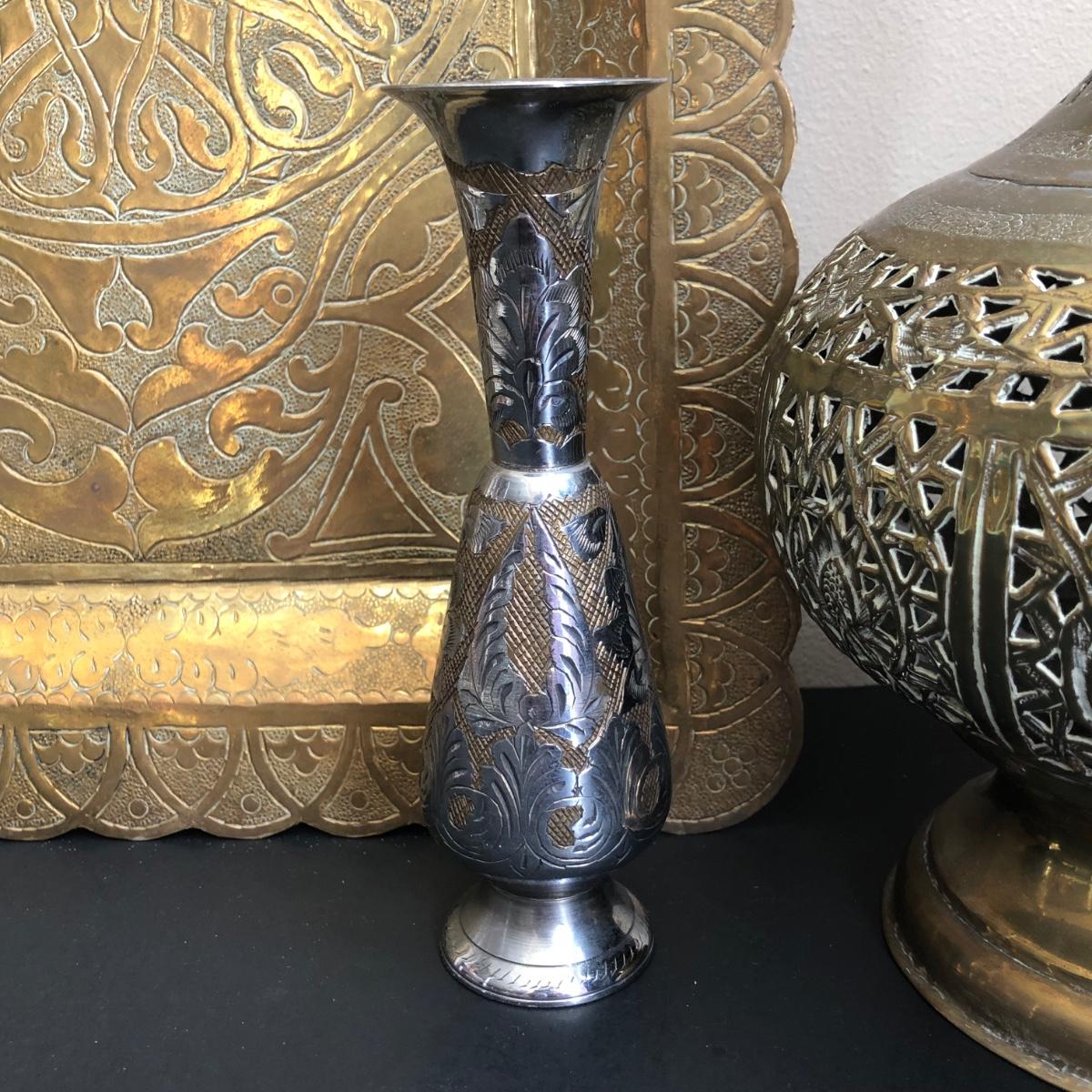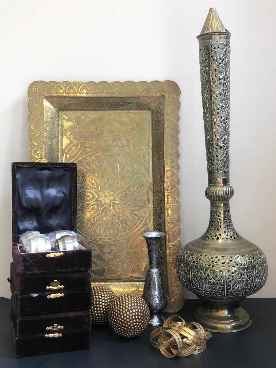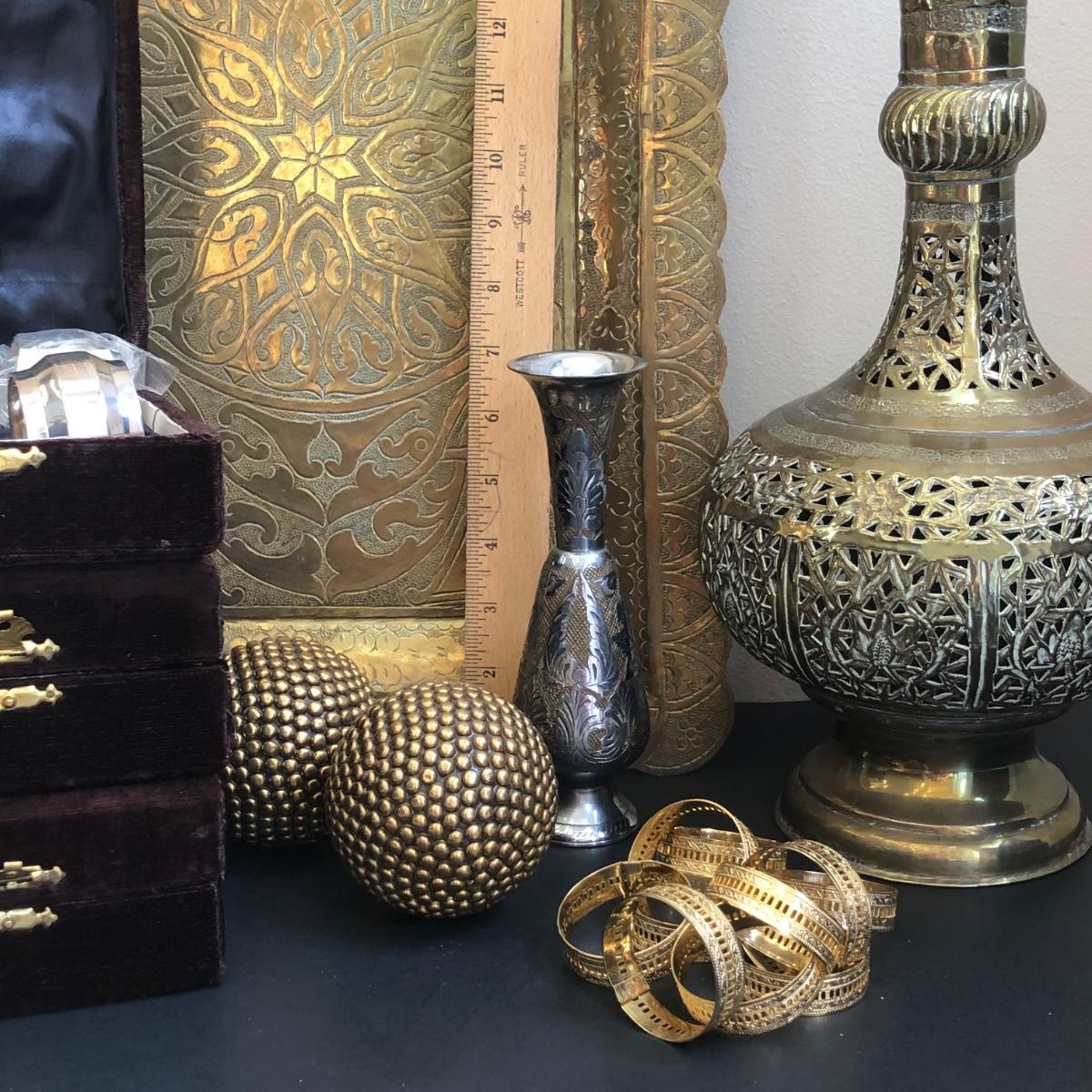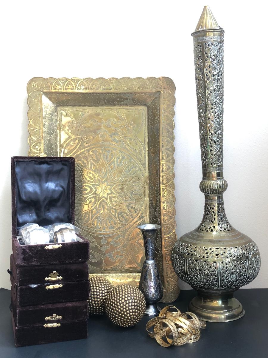 LOT 17K: Tall Incense Holder, Decorative Brass Orbs, Bud Vase & Napkin Rings Made in India