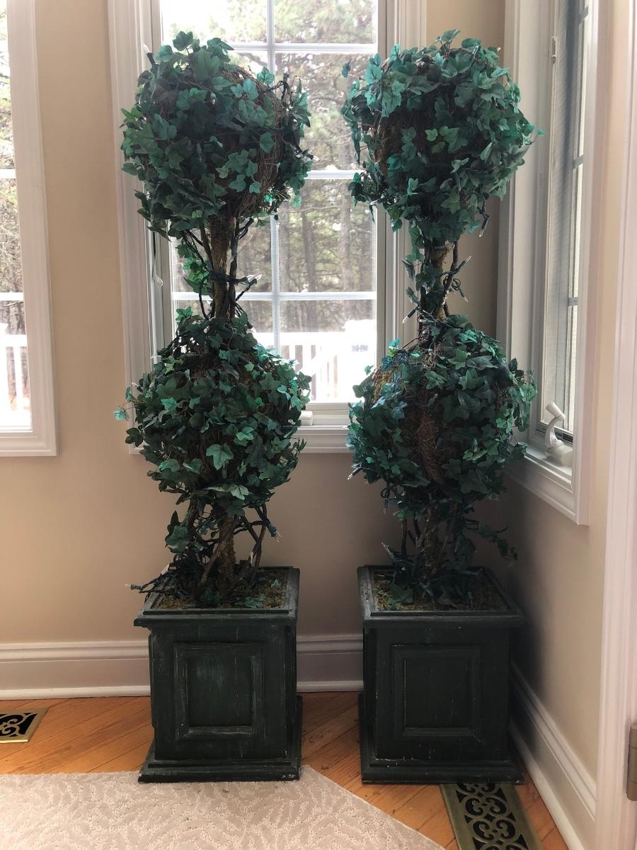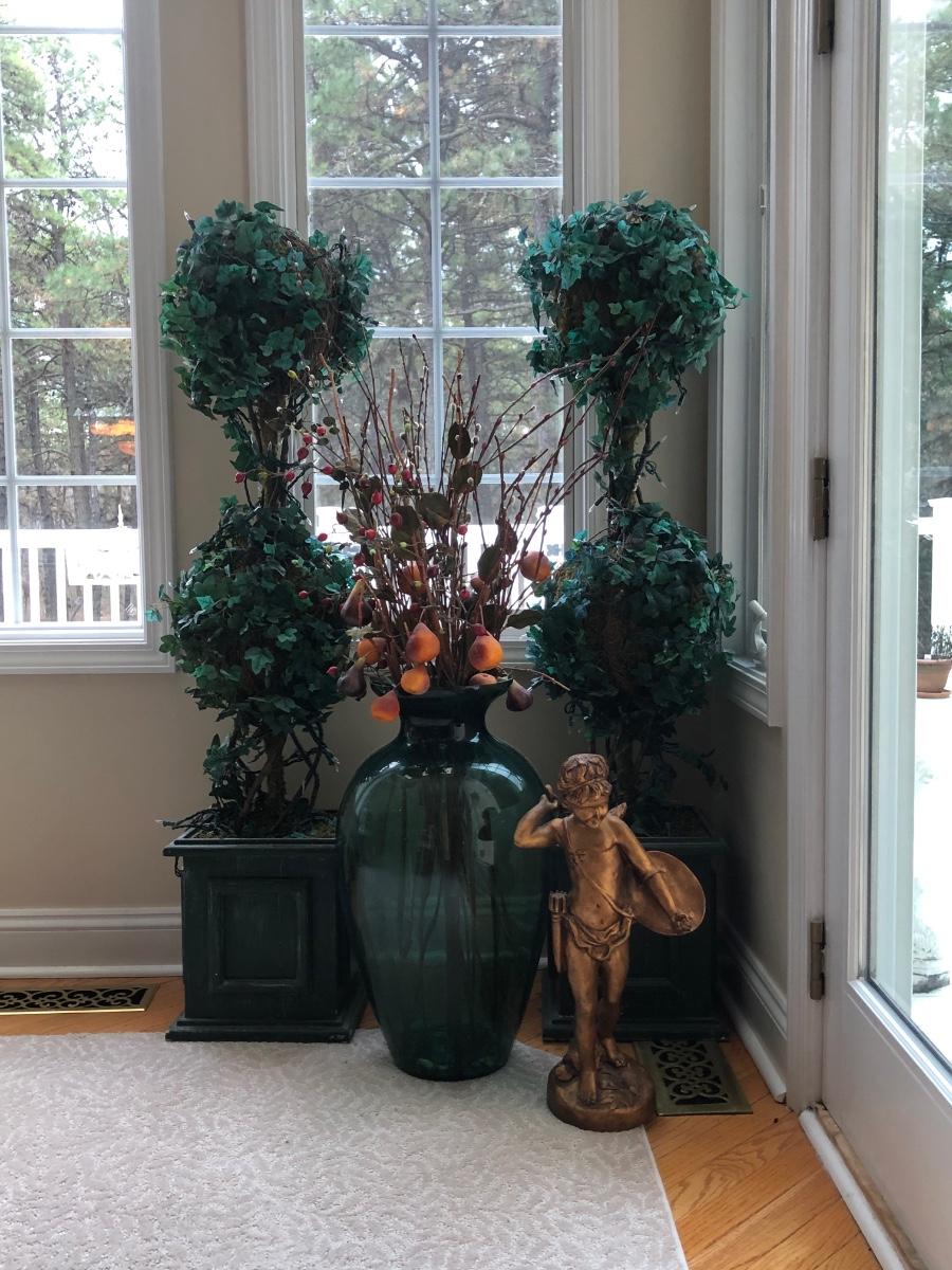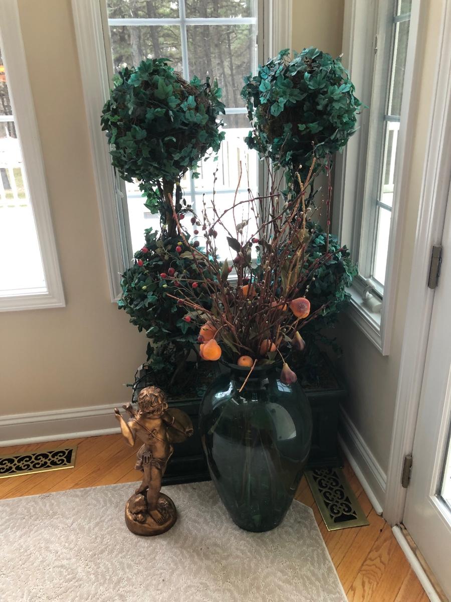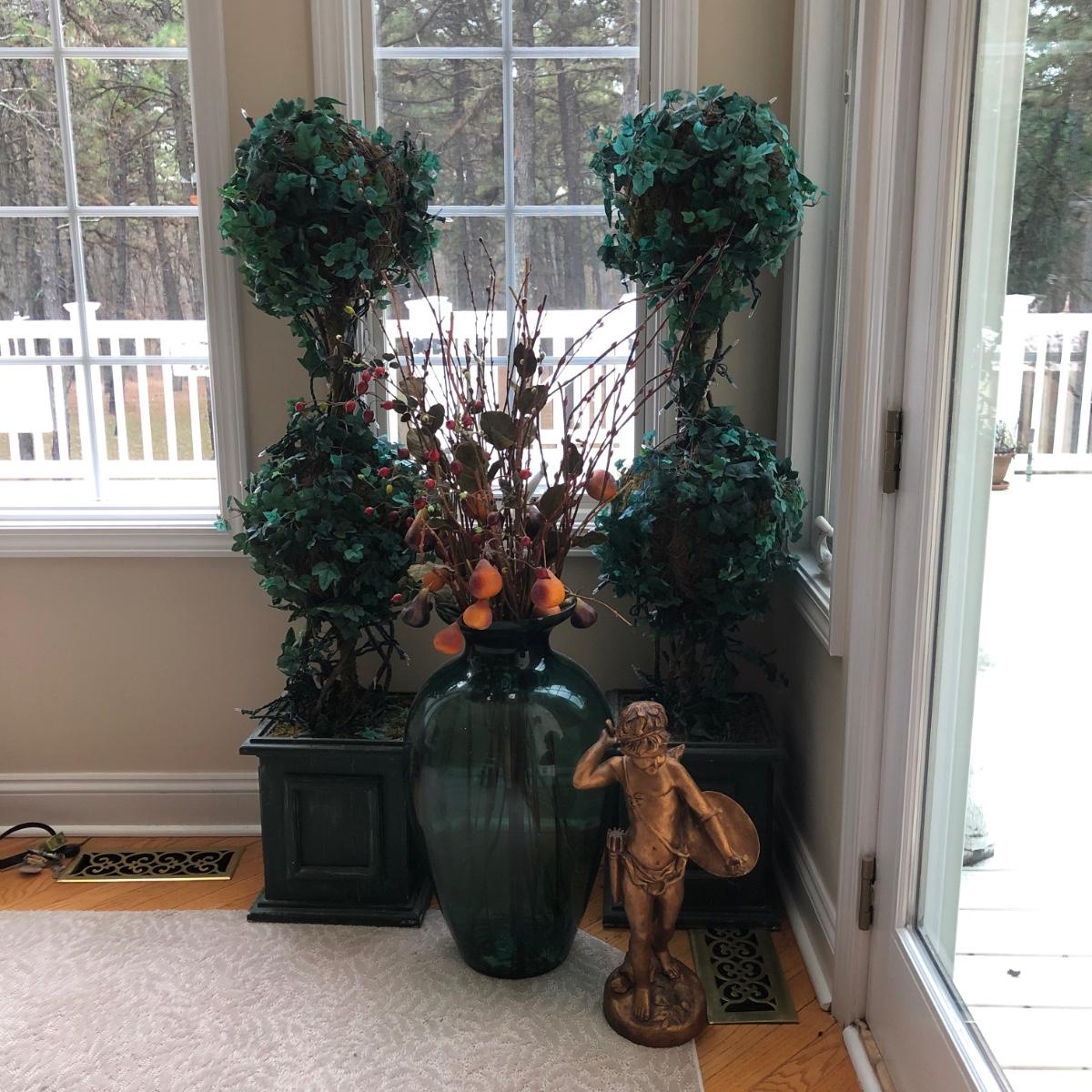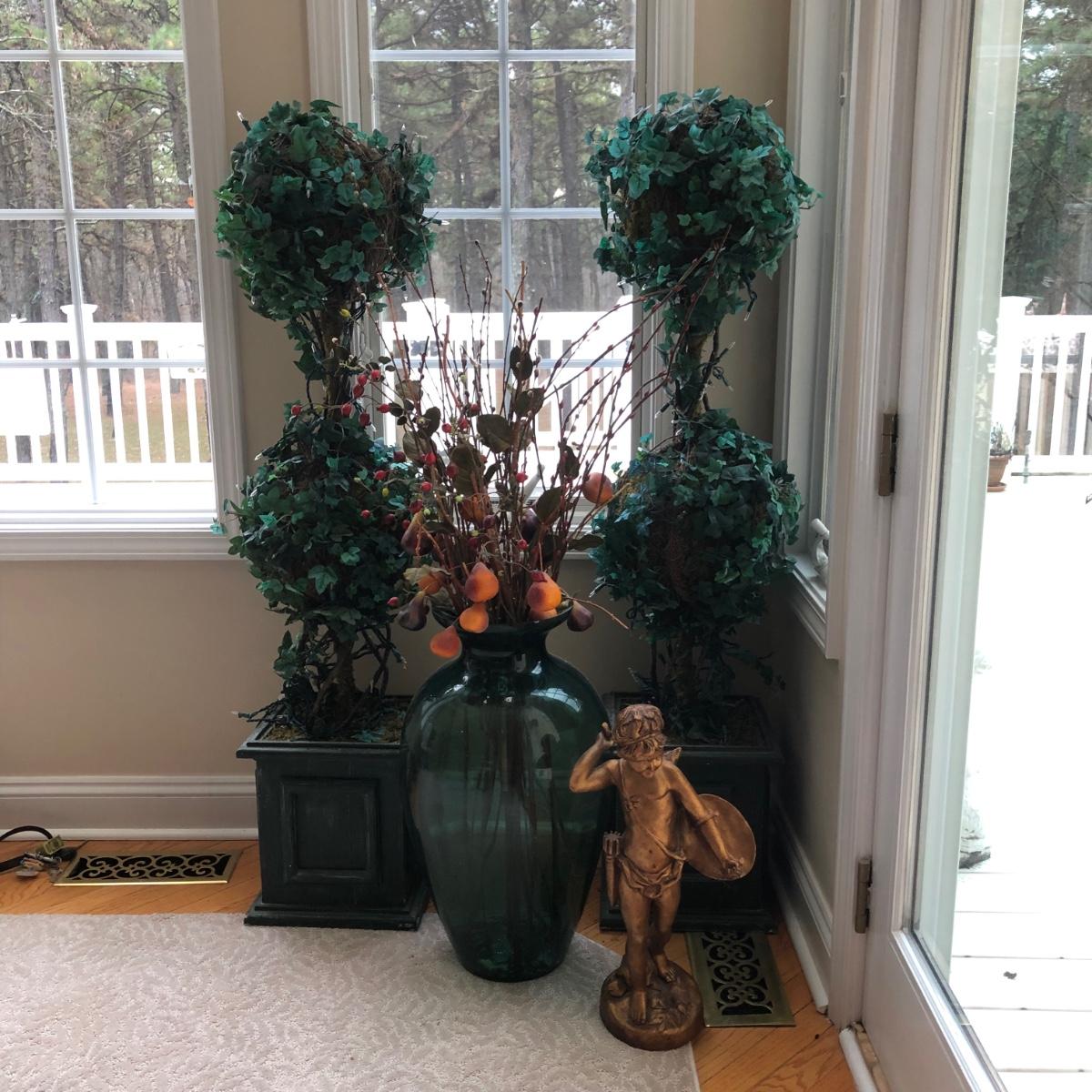 LOT 100K: Faux Lighted Topiaries, Large Glass Vase & Statue