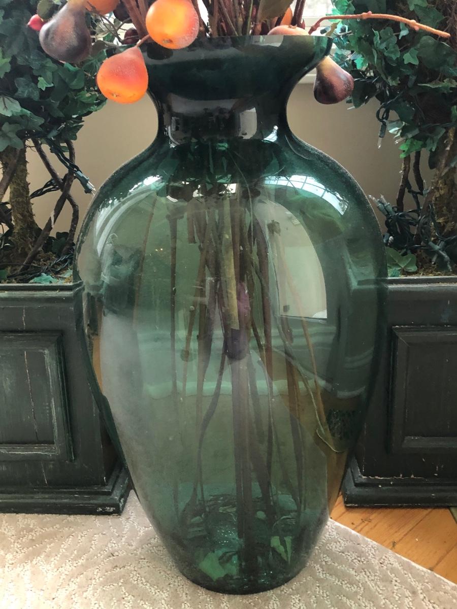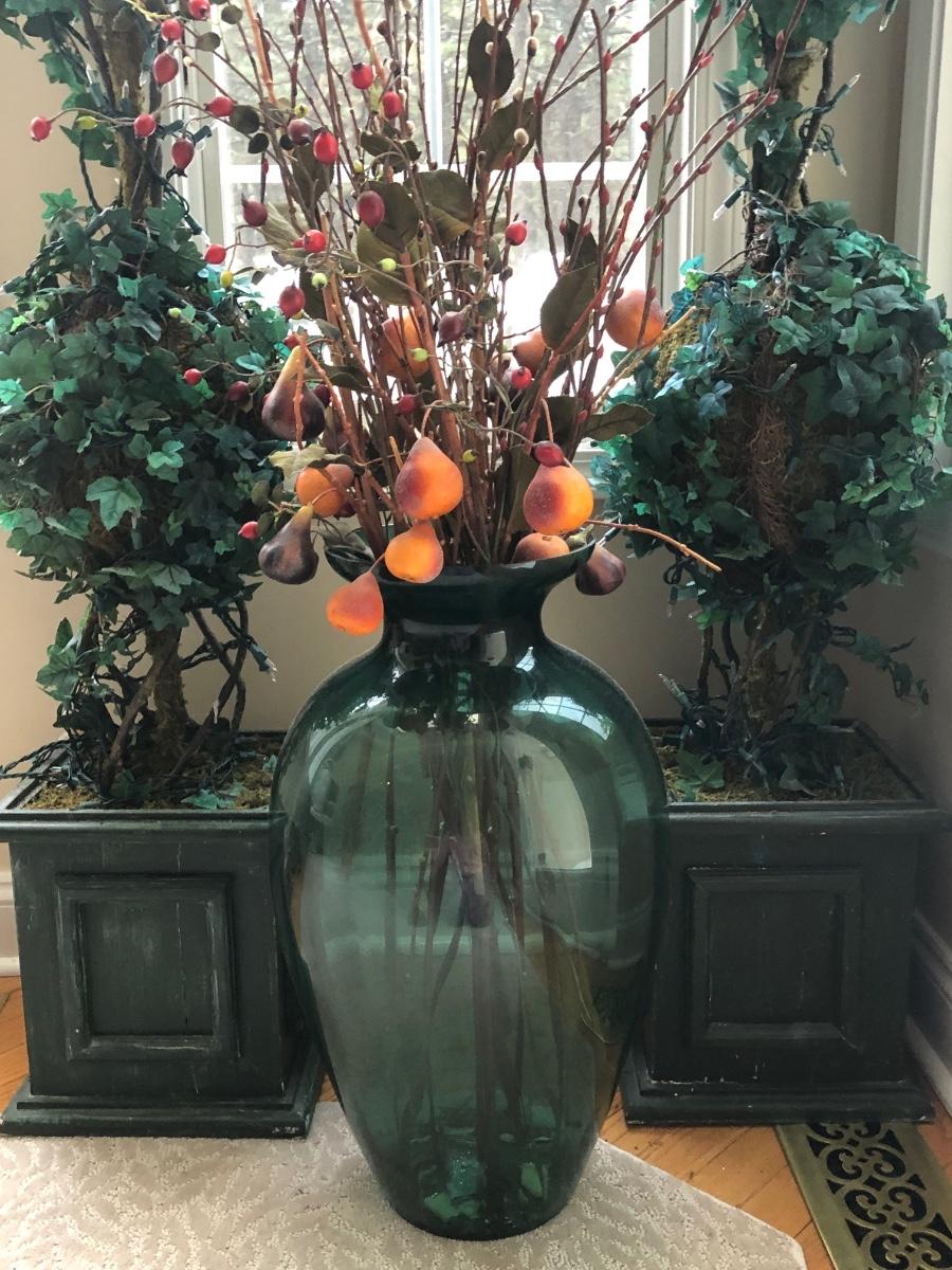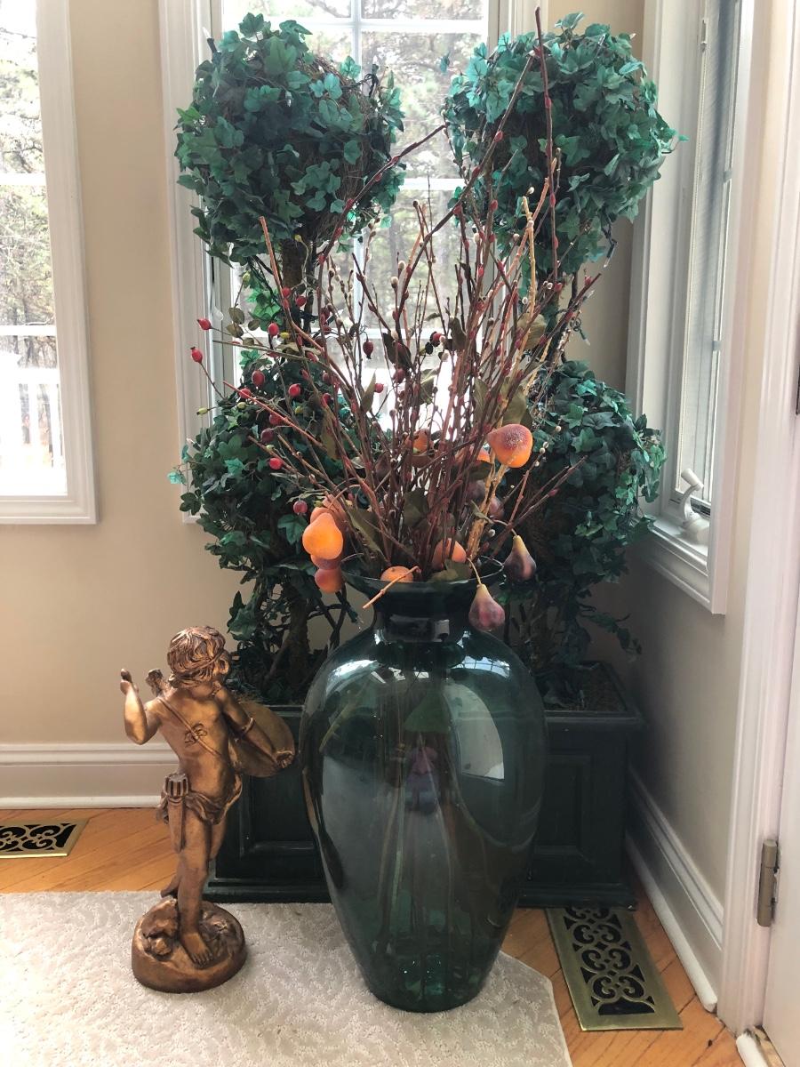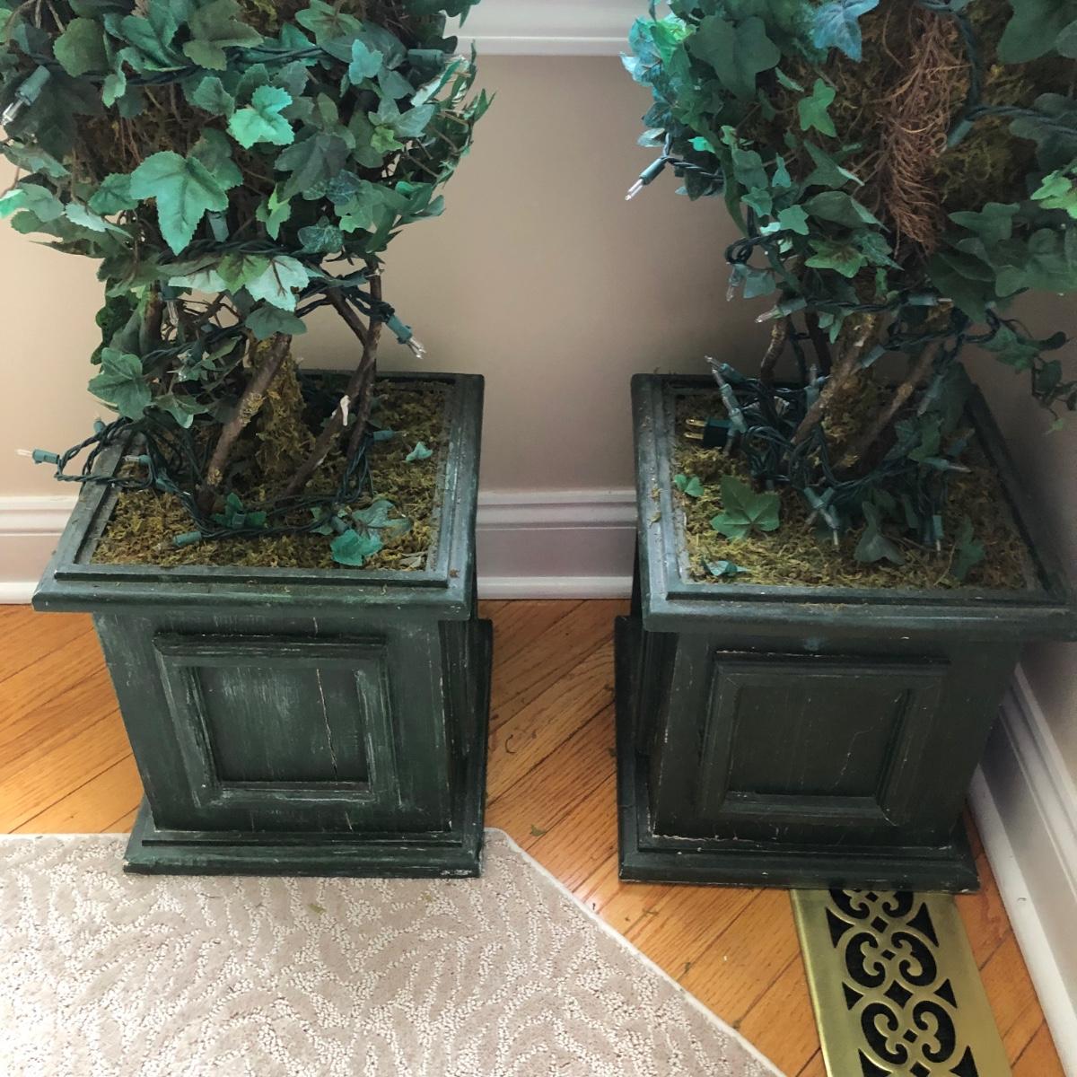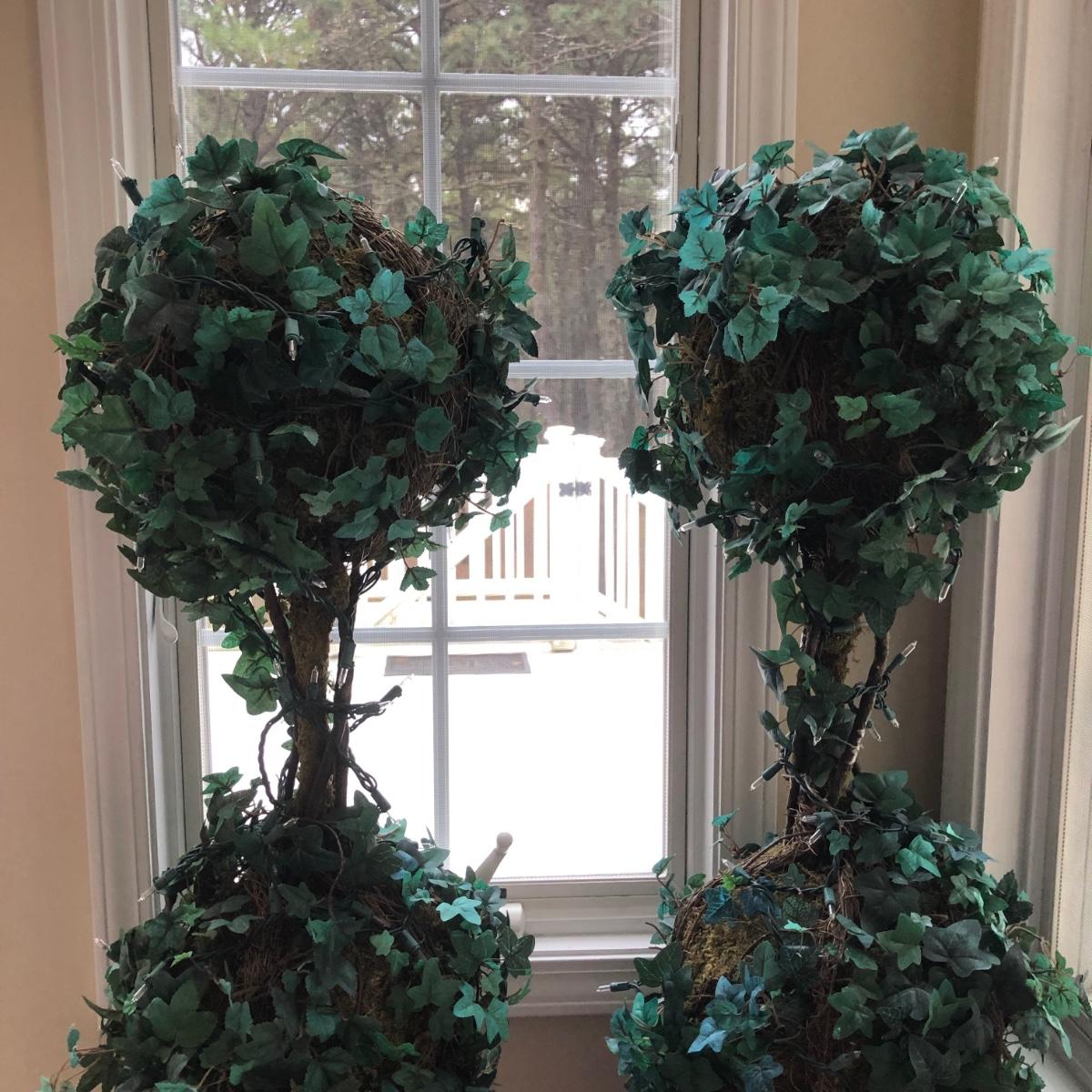 LOT 100K: Faux Lighted Topiaries, Large Glass Vase & Statue