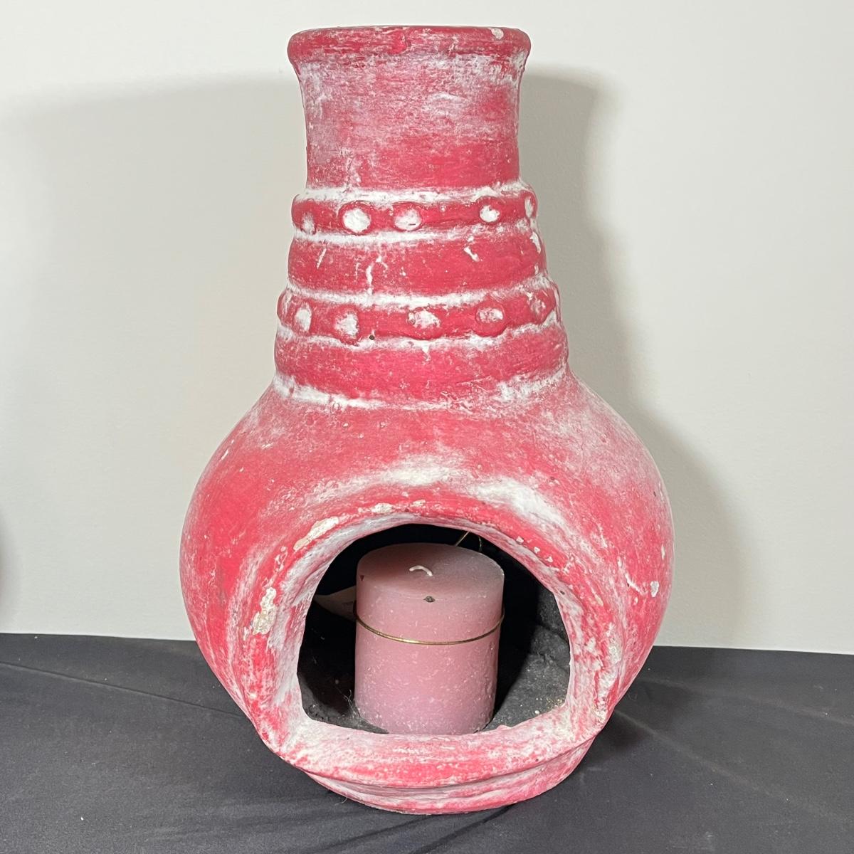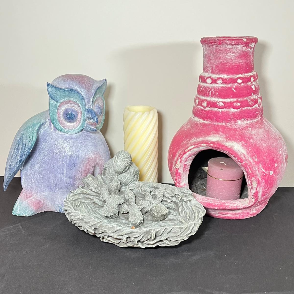 LOT 132B: Home Decor - Candles, Chiminea, Owl Statue, Wall-Mount Birdbath