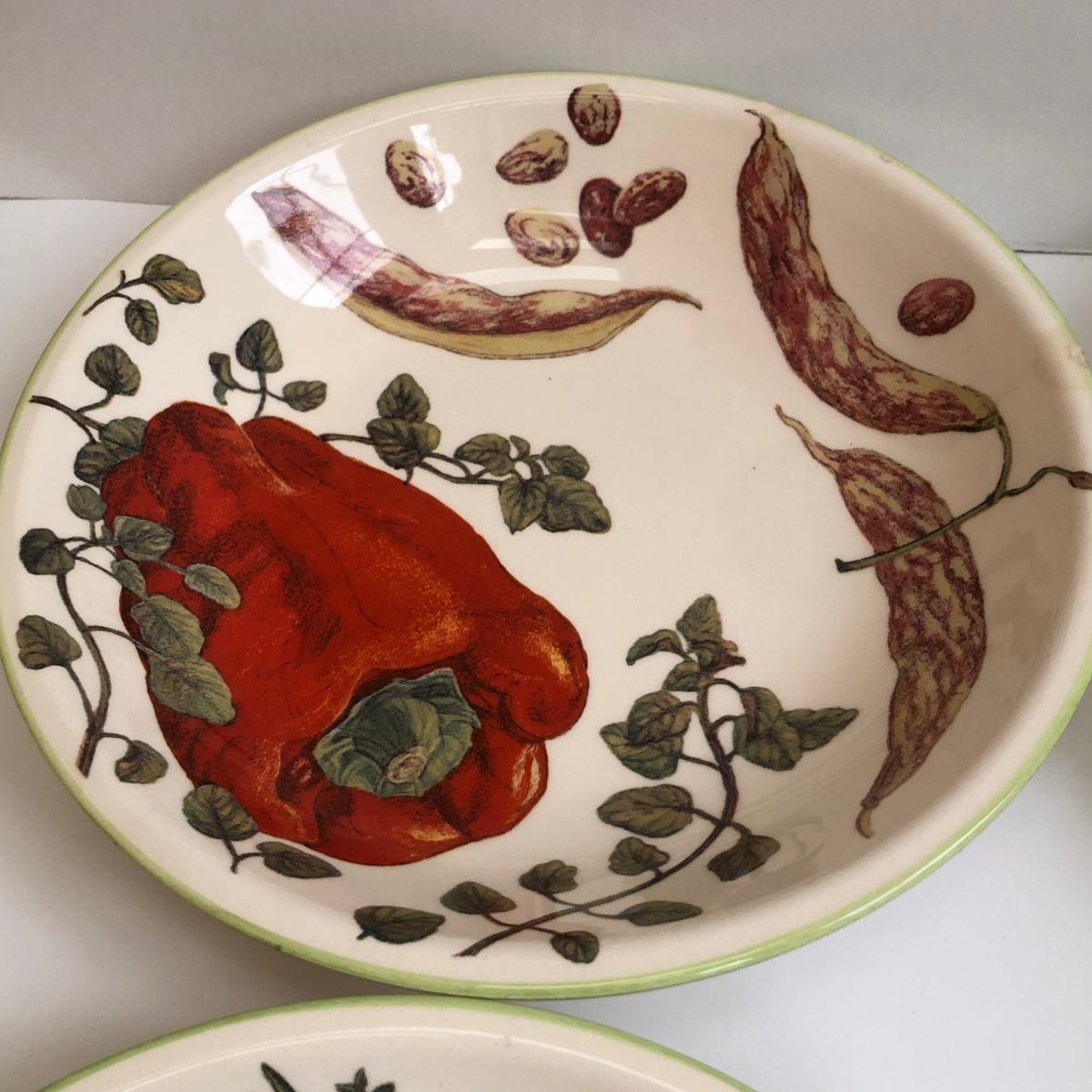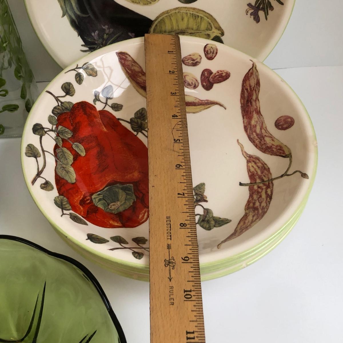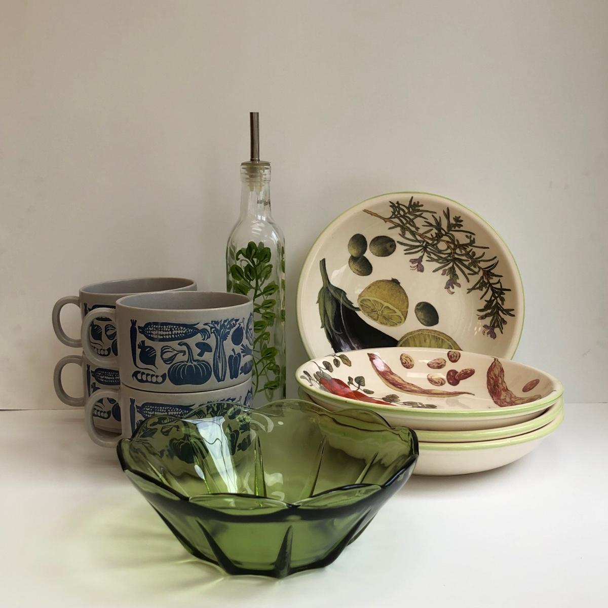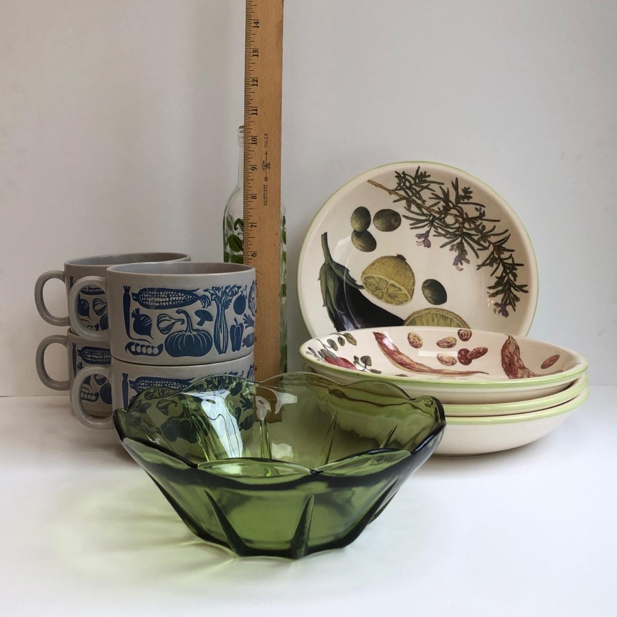 LOT 145K: Rustic Kitchen Collection - Williams-Sonoma Veggie Dishes, Avocado Green Glass Bowl, Veggie Stoneware Soup Mugs & Painted Oil Bottle