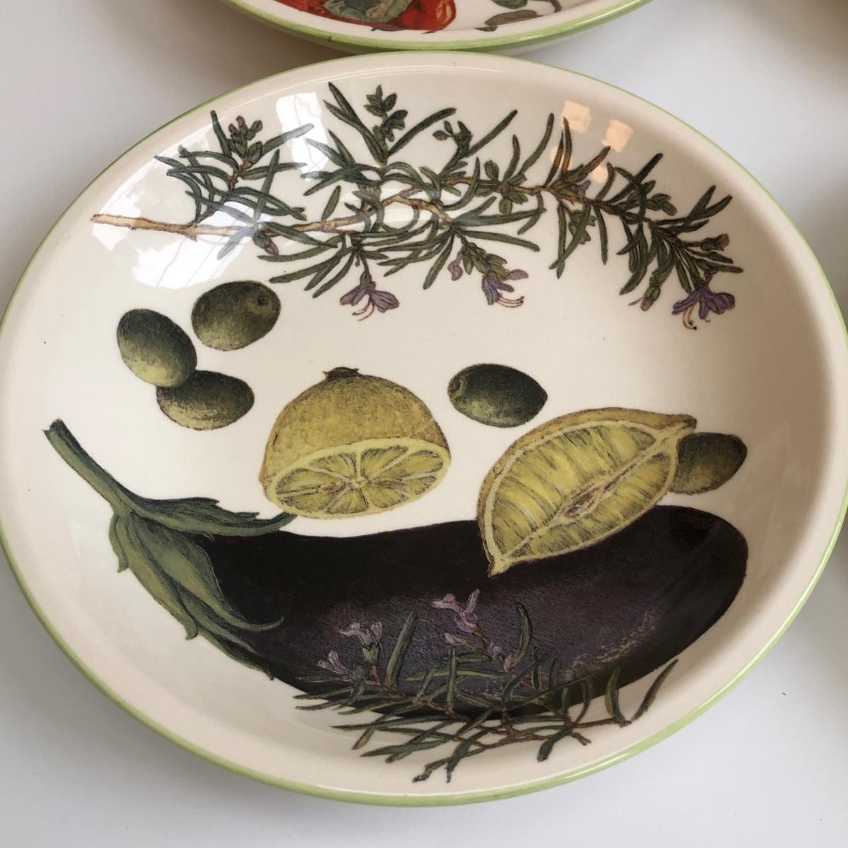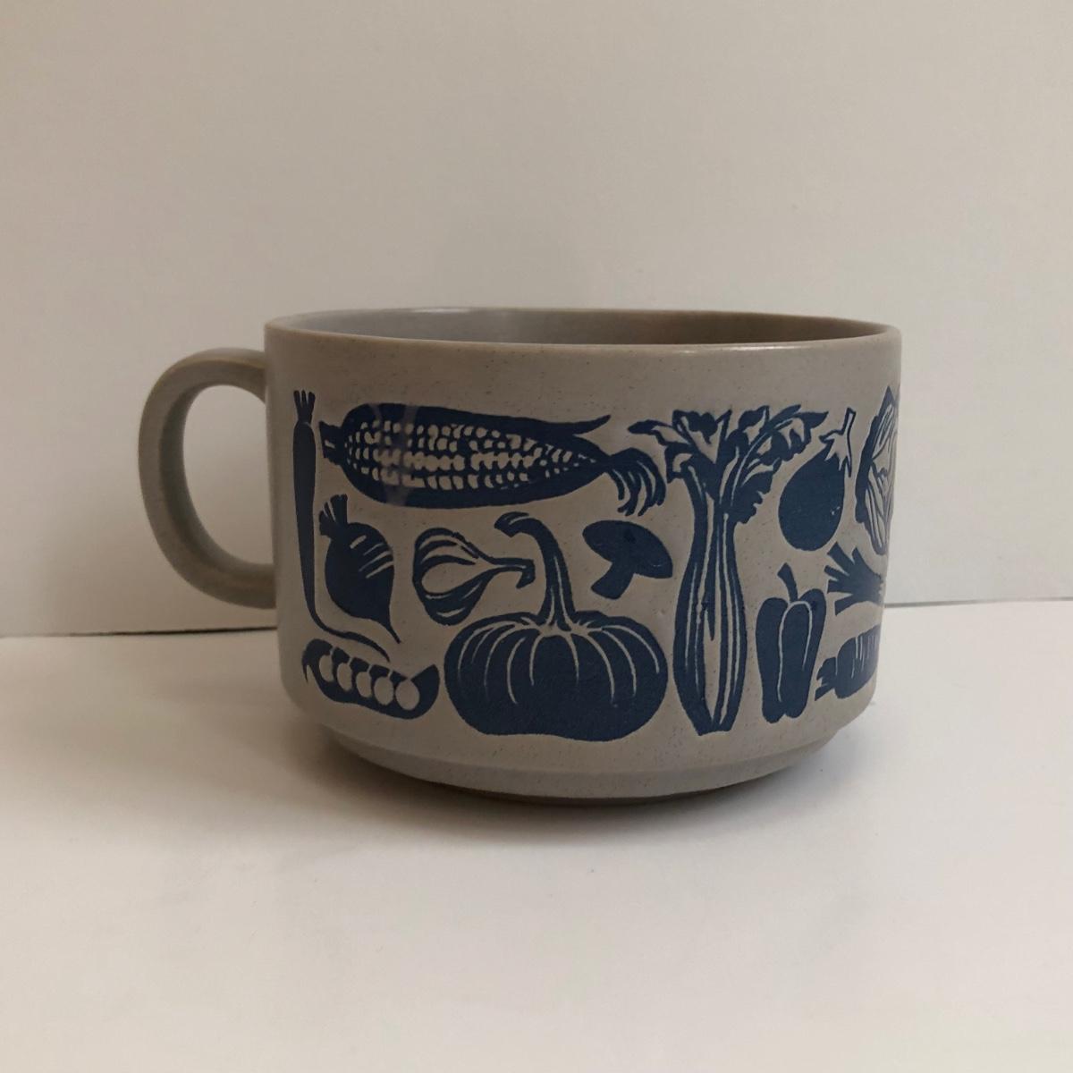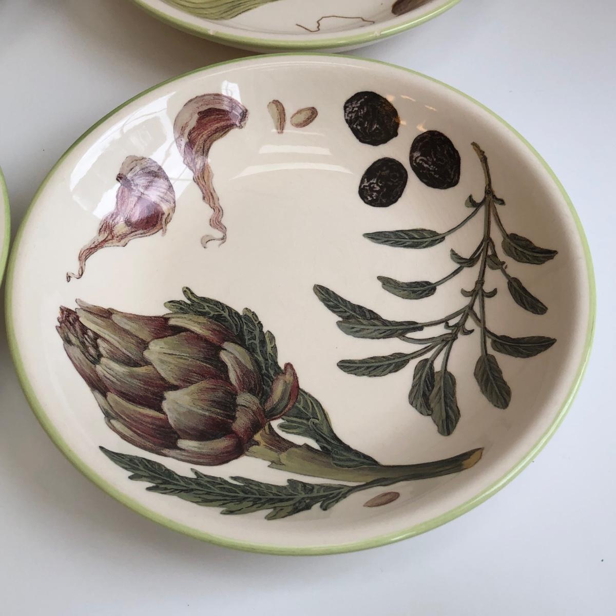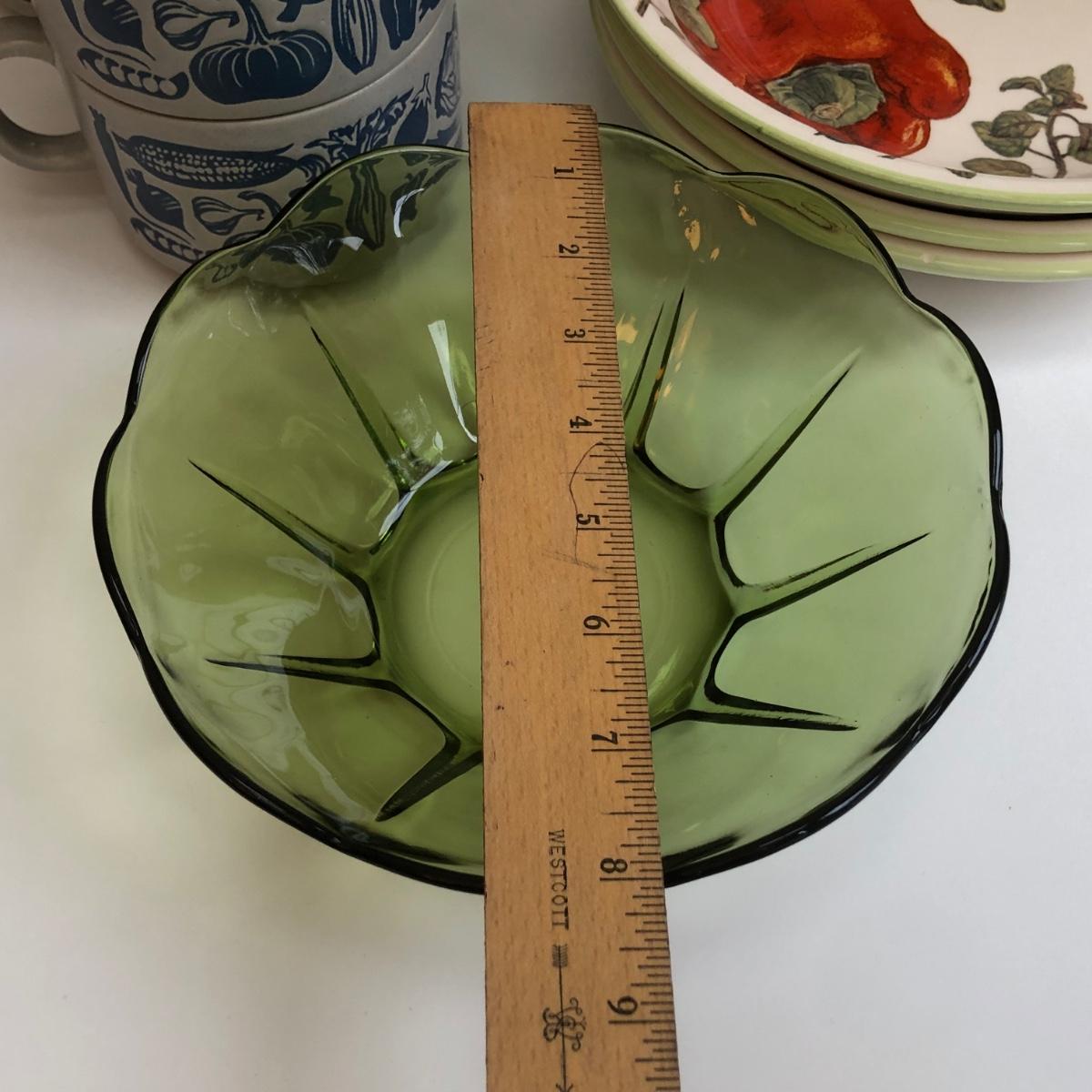LOT 145K: Rustic Kitchen Collection - Williams-Sonoma Veggie Dishes, Avocado Green Glass Bowl, Veggie Stoneware Soup Mugs & Painted Oil Bottle