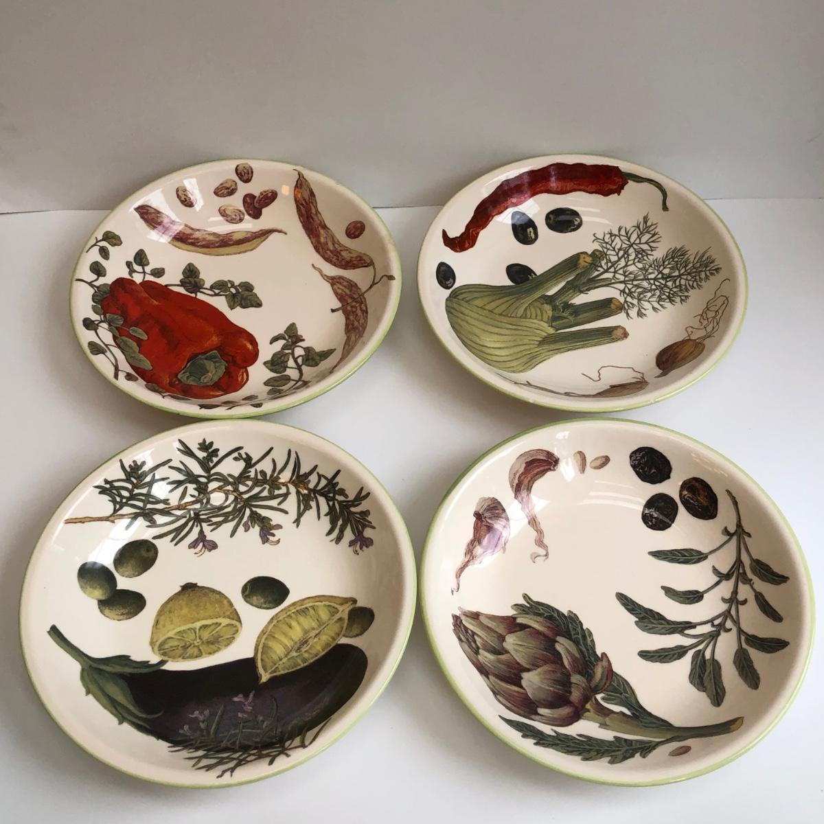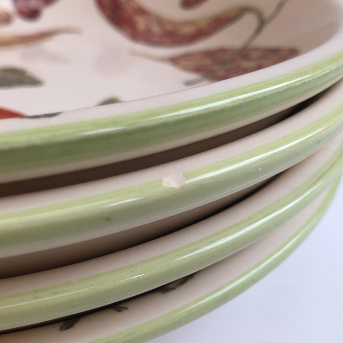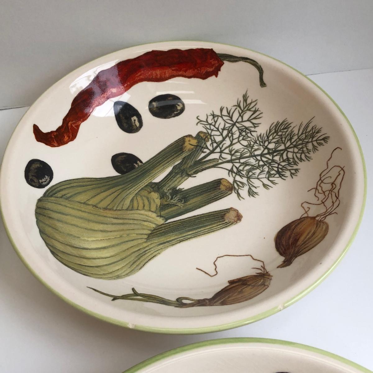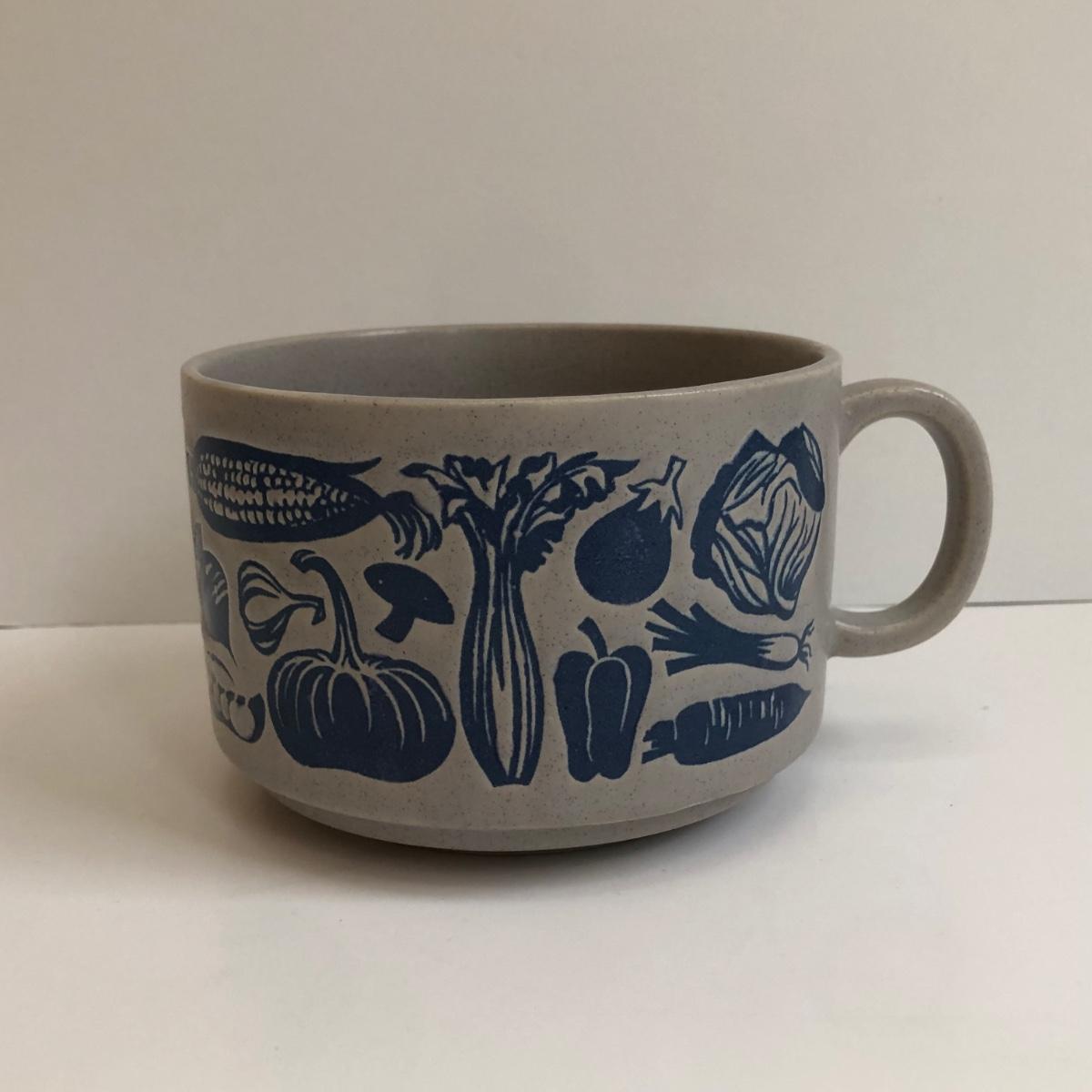 LOT 145K: Rustic Kitchen Collection - Williams-Sonoma Veggie Dishes, Avocado Green Glass Bowl, Veggie Stoneware Soup Mugs & Painted Oil Bottle