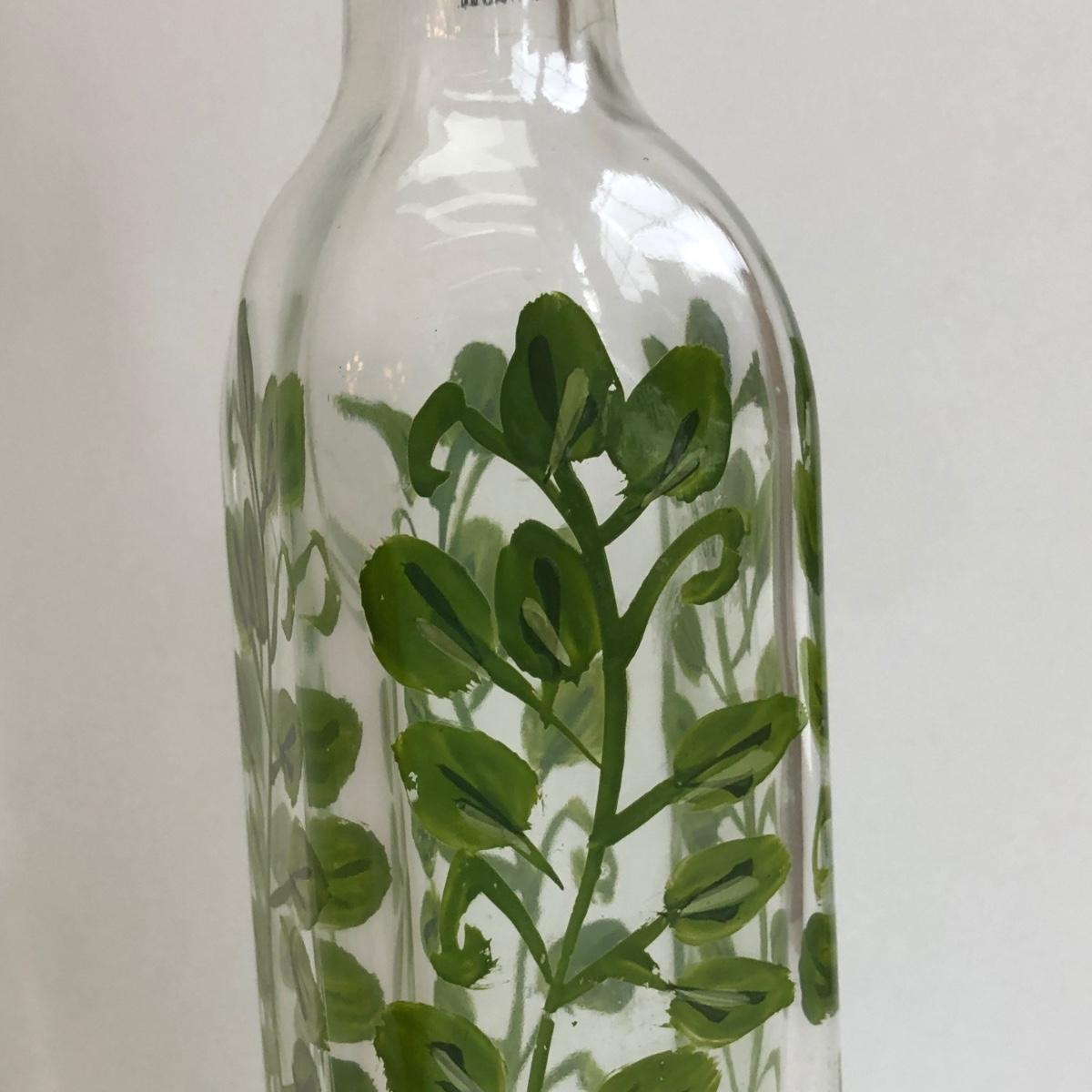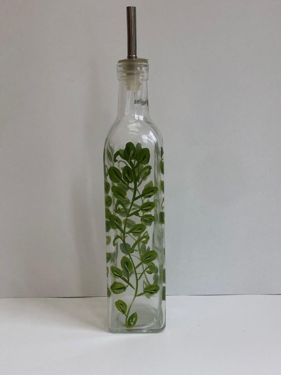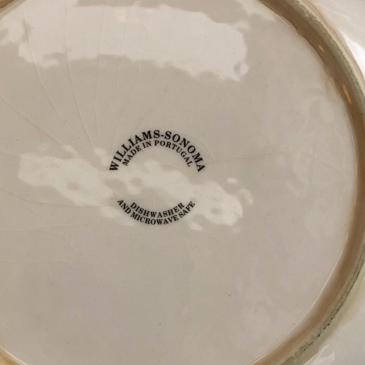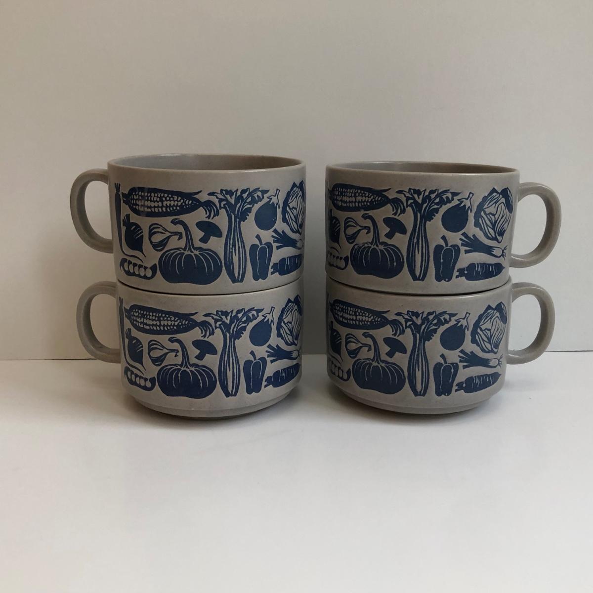 LOT 145K: Rustic Kitchen Collection - Williams-Sonoma Veggie Dishes, Avocado Green Glass Bowl, Veggie Stoneware Soup Mugs & Painted Oil Bottle